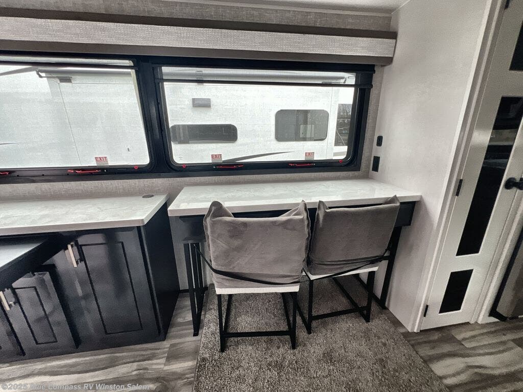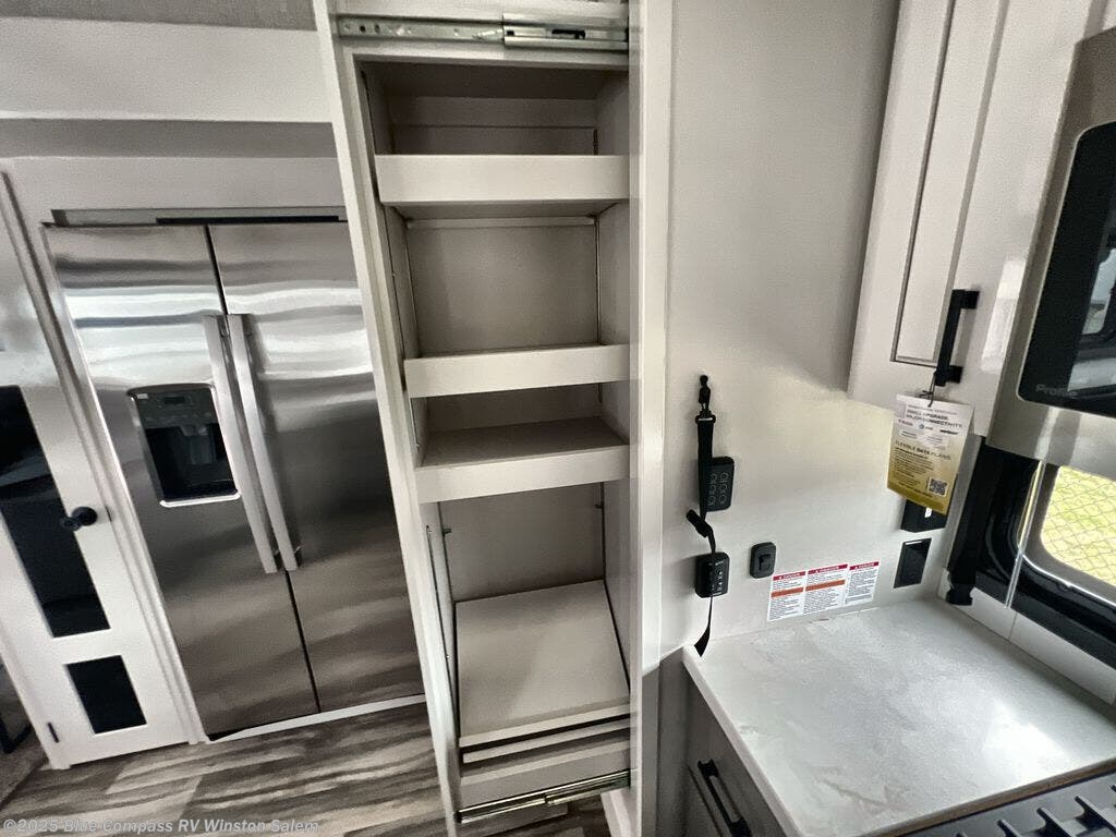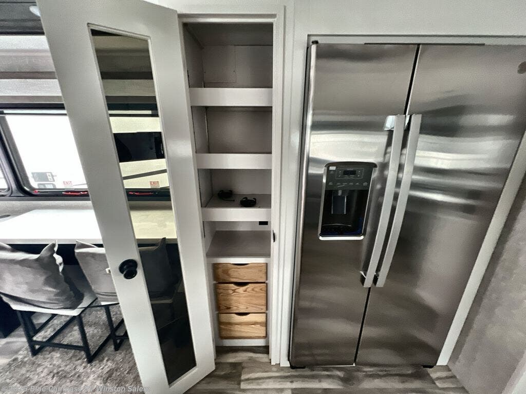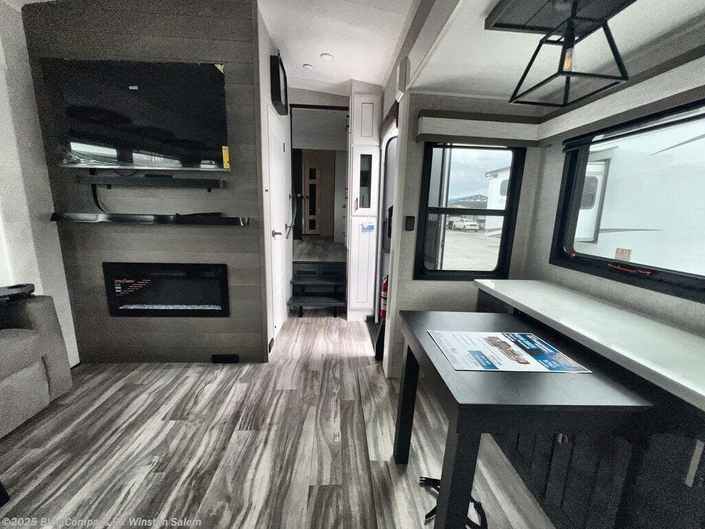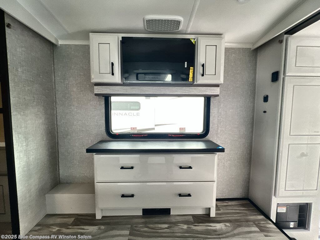 Triples slides, a desk/coffee bar, fireplace, and a huge master bath in front all indicate the kind of vacation you will experience in this Pinnacle Fifth Wheel! As you enter, a convenient half bath is located straight ahead. Slightly to your left, a nice seating area for gathering with family or friends to relax and watch TV, enjoy the fireplace while reading a book or watching a movie, and the dining table with chairs. The dinette slide also houses a 21 cu. ft. residential refrigerator and pantry. The rear kitchen features a u-shaped counter, all the appliances you need to cook like at home, even a pull-out butcher block space for chopping up your veggies. Back through and up the steps to your right in front, the master bedroom will make you feel like royalty with its king bed, plus luxurious full rear bath. A huge vanity with dual bath sinks will allow you both to get ready at the same time, plus there is a walk-in shower with a seat for added convenience. Speaking of walk-in, you will also love the spacious walk-in closet that includes washer/dryer prep.