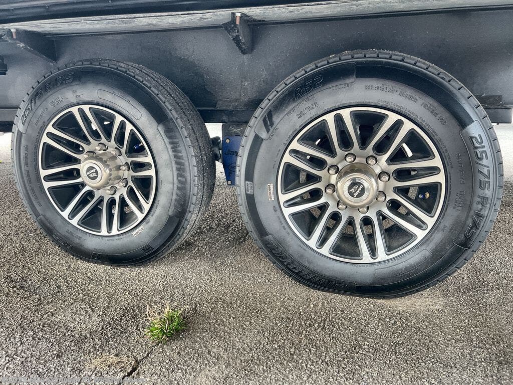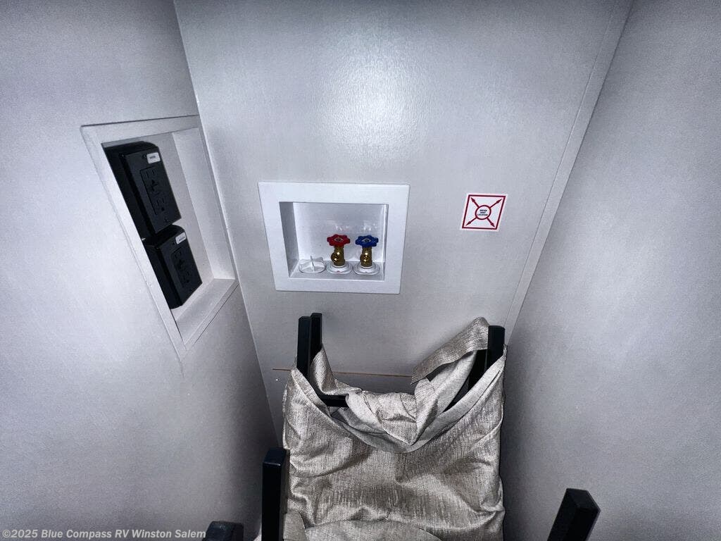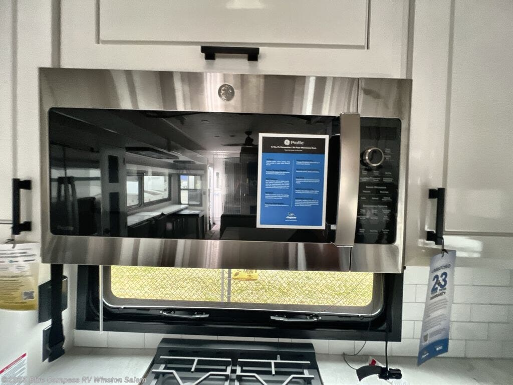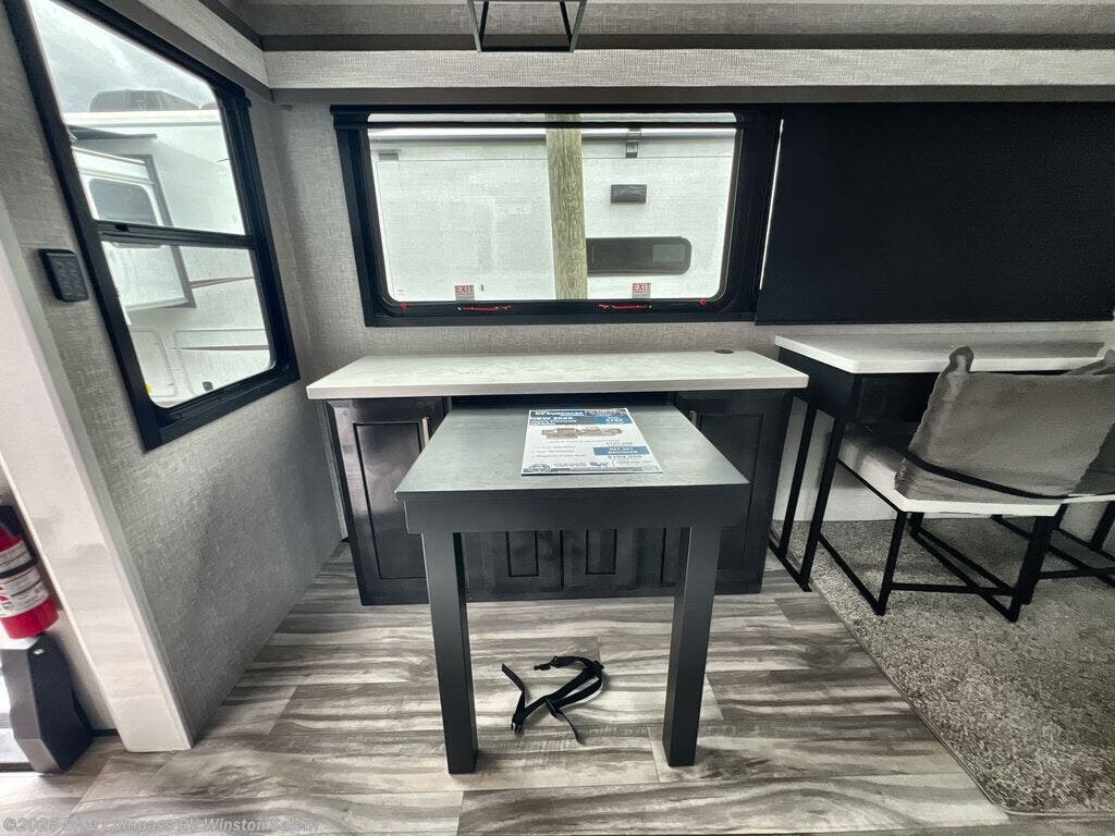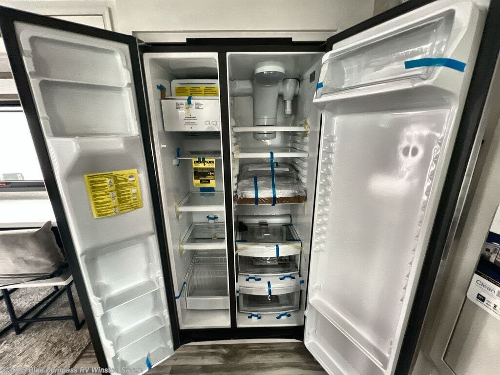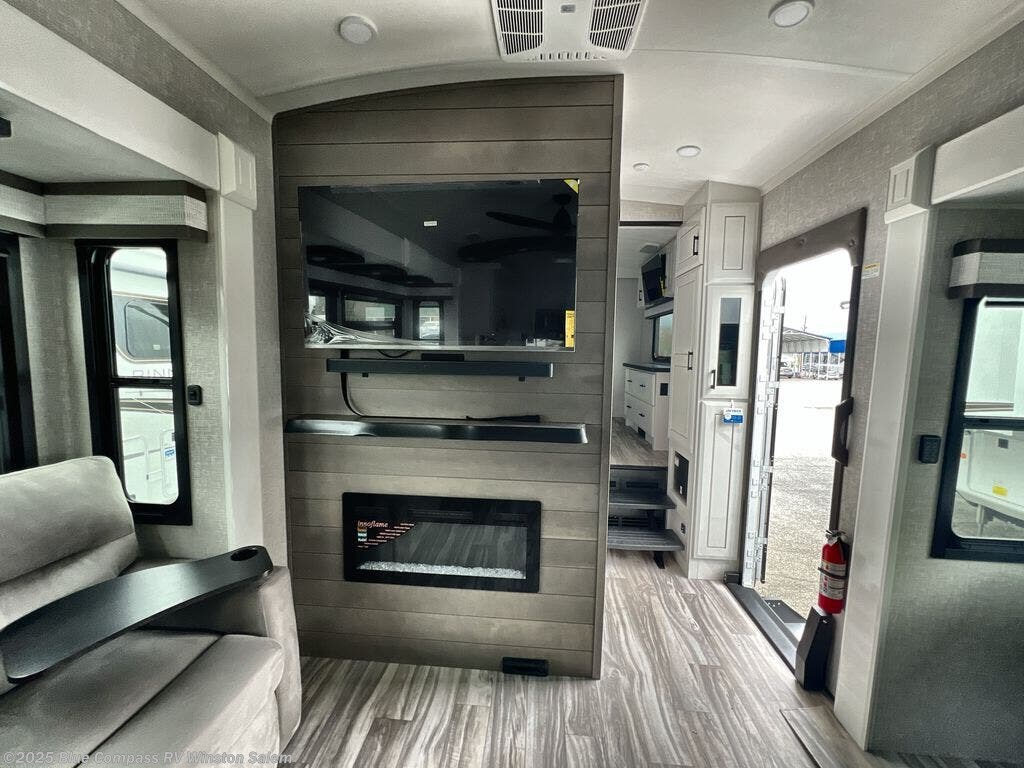 Triples slides, a desk/coffee bar, fireplace, and a huge master bath in front all indicate the kind of vacation you will experience in this Pinnacle Fifth Wheel! As you enter, a convenient half bath is located straight ahead. Slightly to your left, a nice seating area for gathering with family or friends to relax and watch TV, enjoy the fireplace while reading a book or watching a movie, and the dining table with chairs. The dinette slide also houses a 21 cu. ft. residential refrigerator and pantry. The rear kitchen features a u-shaped counter, all the appliances you need to cook like at home, even a pull-out butcher block space for chopping up your veggies. Back through and up the steps to your right in front, the master bedroom will make you feel like royalty with its king bed, plus luxurious full rear bath. A huge vanity with dual bath sinks will allow you both to get ready at the same time, plus there is a walk-in shower with a seat for added convenience. Speaking of walk-in, you will also love the spacious walk-in closet that includes washer/dryer prep.