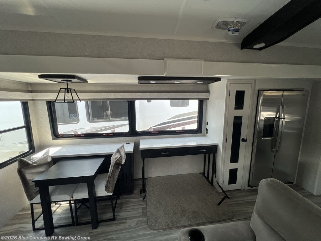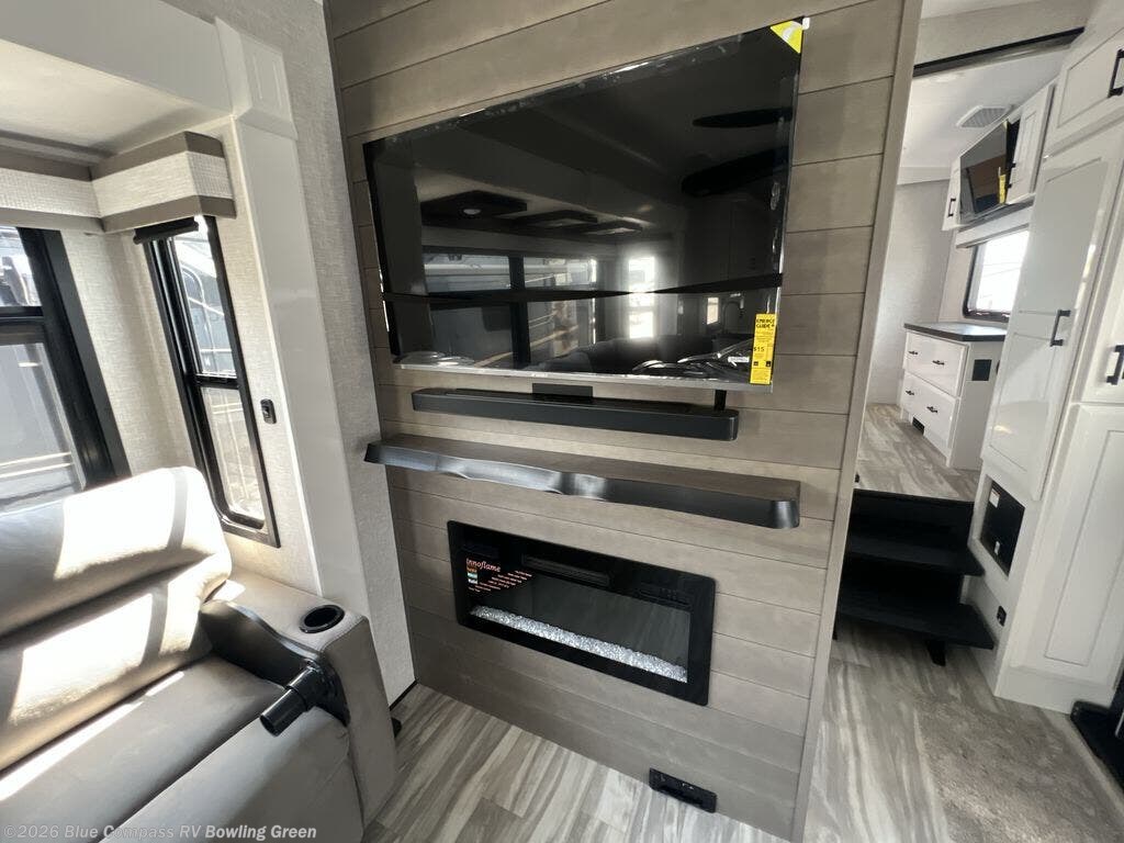 Triples slides, a desk/coffee bar, fireplace, and a huge master bath in front all indicate the kind of vacation you will experience in this Pinnacle Fifth Wheel! As you enter, a convenient half bath is located straight ahead. Slightly to your left, a nice seating area for gathering with family or friends to relax and watch TV, enjoy the fireplace while reading a book or watching a movie, and the dining table with chairs. The dinette slide also houses a 21 cu. ft. residential refrigerator and pantry. The rear kitchen features a u-shaped counter, all the appliances you need to cook like at home, even a pull-out butcher block space for chopping up your veggies. Back through and up the steps to your right in front, the master bedroom will make you feel like royalty with its king bed, plus luxurious full rear bath. A huge vanity with dual bath sinks will allow you both to get ready at the same time, plus there is a walk-in shower with a seat for added convenience. Speaking of walk-in, you will also love the spacious walk-in closet that includes washer/dryer prep.