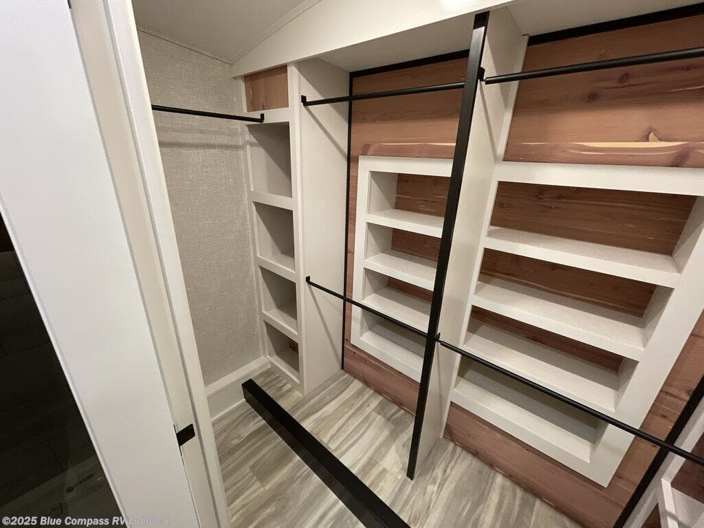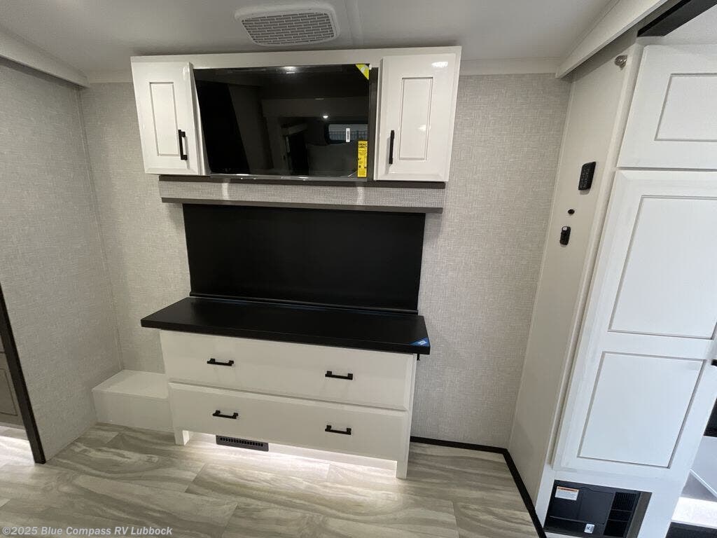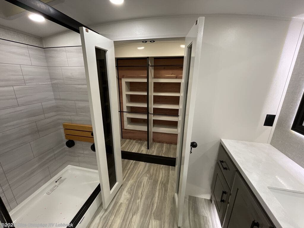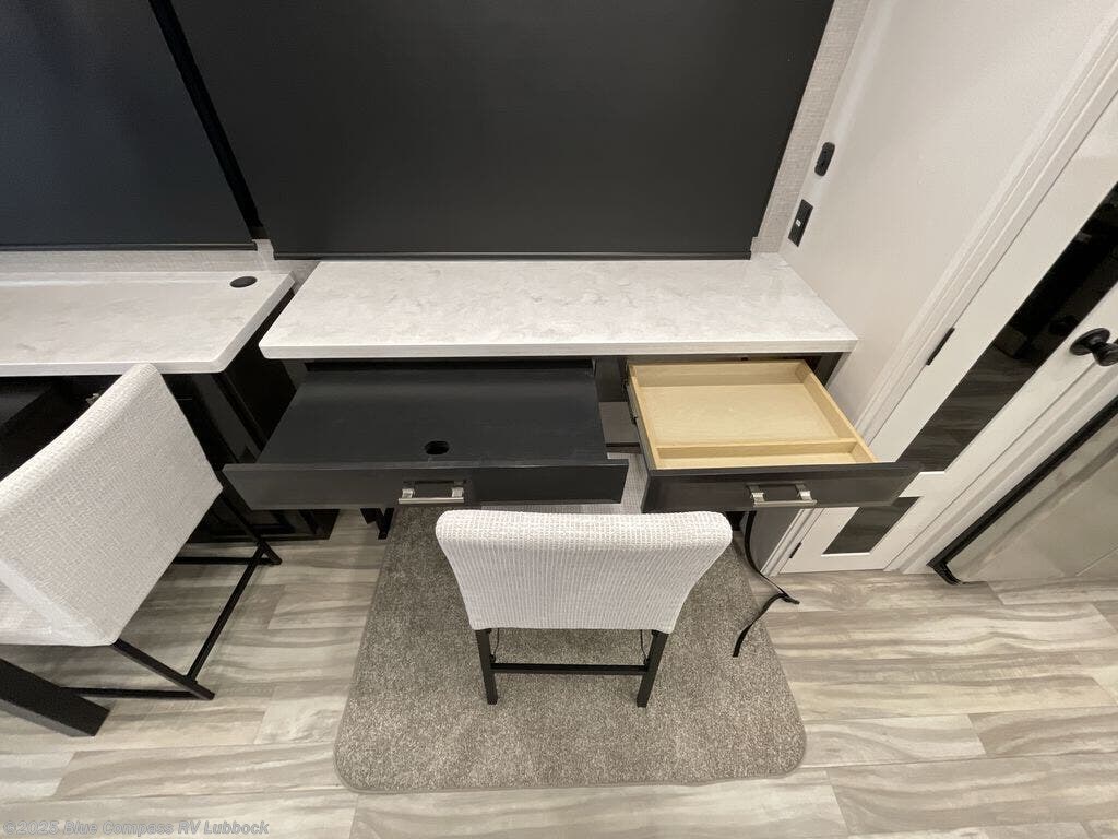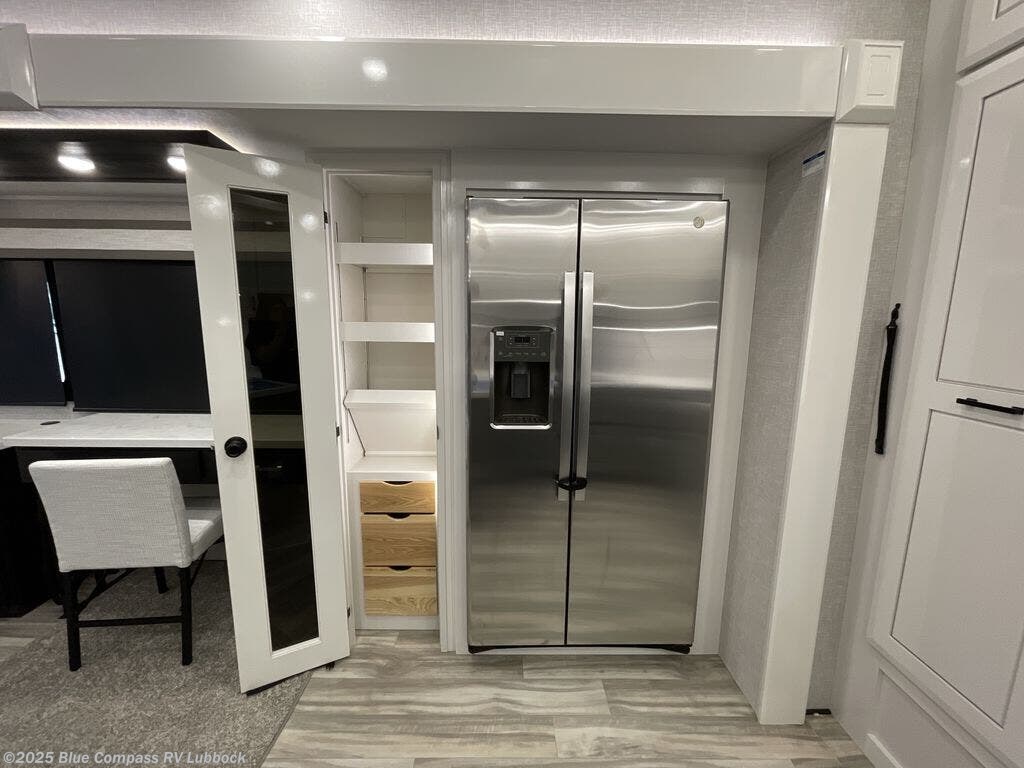 Triples slides, a desk/coffee bar, fireplace, and a huge master bath in front all indicate the kind of vacation you will experience in this Pinnacle Fifth Wheel! As you enter, a convenient half bath is located straight ahead. Slightly to your left, a nice seating area for gathering with family or friends to relax and watch TV, enjoy the fireplace while reading a book or watching a movie, and the dining table with chairs. The dinette slide also houses a 21 cu. ft. residential refrigerator and pantry. The rear kitchen features a u-shaped counter, all the appliances you need to cook like at home, even a pull-out butcher block space for chopping up your veggies. Back through and up the steps to your right in front, the master bedroom will make you feel like royalty with its king bed, plus luxurious full rear bath. A huge vanity with dual bath sinks will allow you both to get ready at the same time, plus there is a walk-in shower with a seat for added convenience. Speaking of walk-in, you will also love the spacious walk-in closet that includes washer/dryer prep.