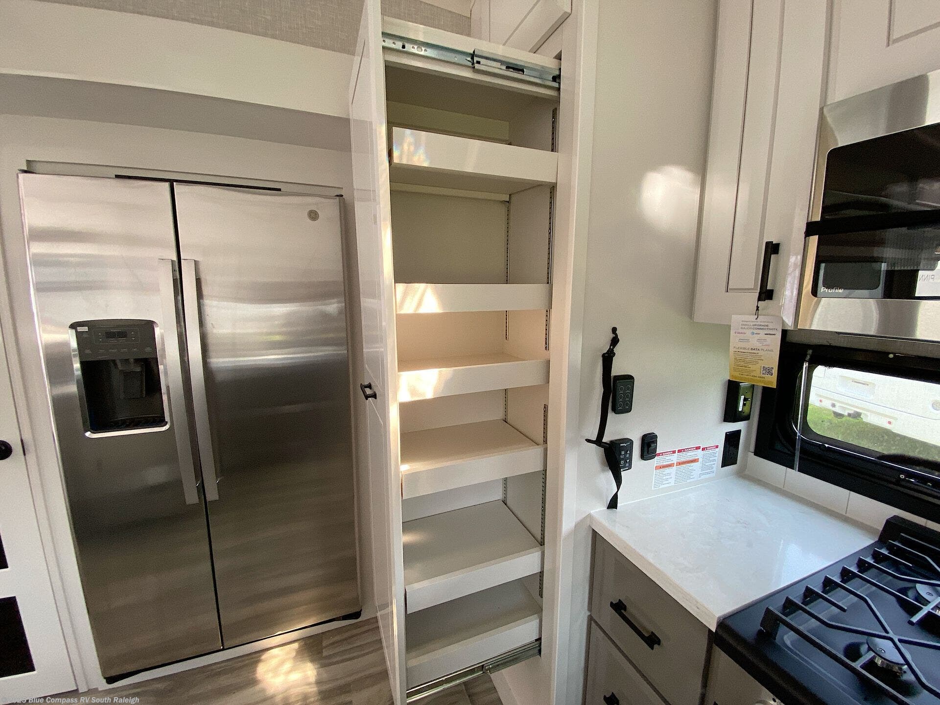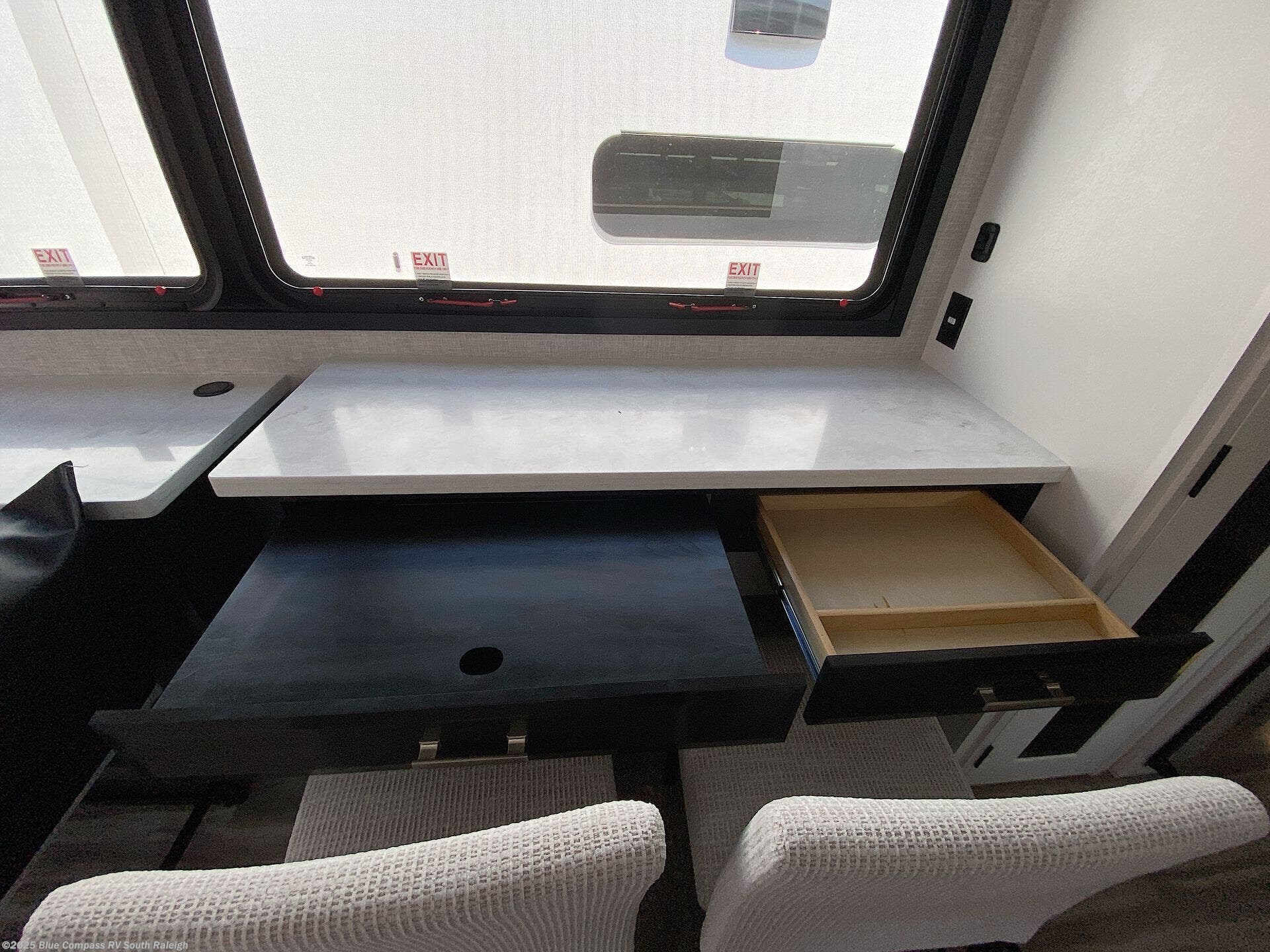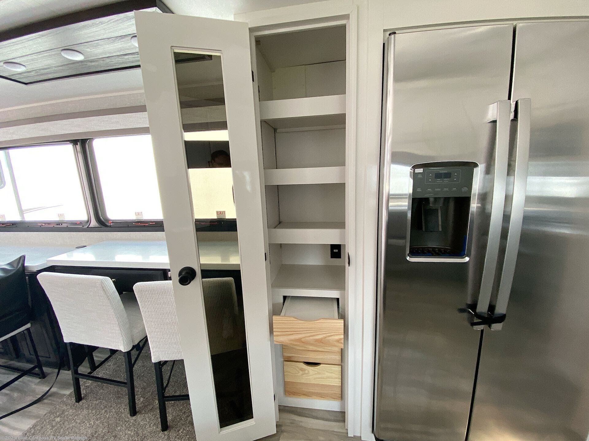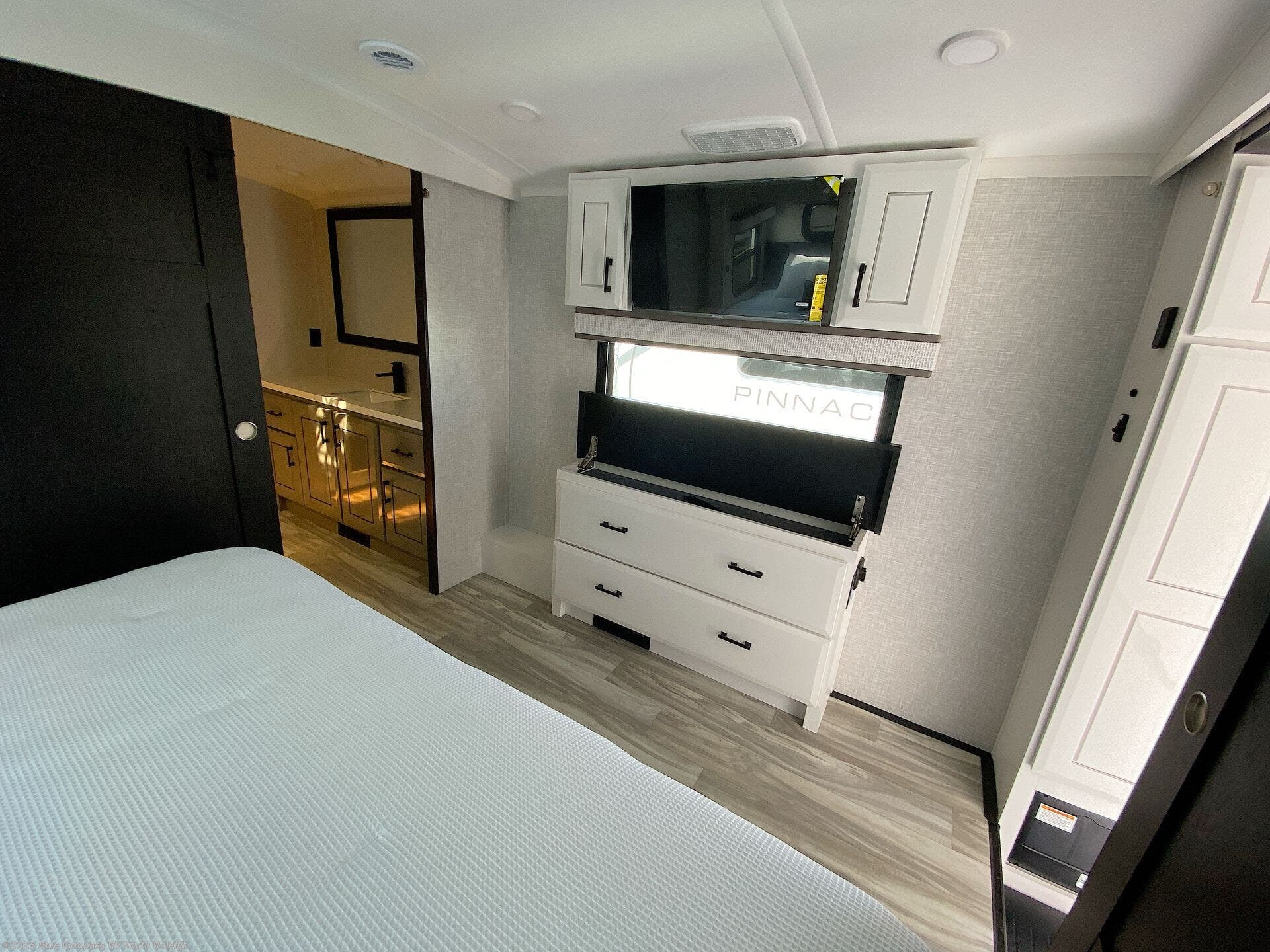 Triples slides, a desk/coffee bar, fireplace, and a huge master bath in front all indicate the kind of vacation you will experience in this Pinnacle Fifth Wheel! As you enter, a convenient half bath is located straight ahead. Slightly to your left, a nice seating area for gathering with family or friends to relax and watch TV, enjoy the fireplace while reading a book or watching a movie, and the dining table with chairs. The dinette slide also houses a 21 cu. ft. residential refrigerator and pantry. The rear kitchen features a u-shaped counter, all the appliances you need to cook like at home, even a pull-out butcher block space for chopping up your veggies. Back through and up the steps to your right in front, the master bedroom will make you feel like royalty with its king bed, plus luxurious full rear bath. A huge vanity with dual bath sinks will allow you both to get ready at the same time, plus there is a walk-in shower with a seat for added convenience. Speaking of walk-in, you will also love the spacious walk-in closet that includes washer/dryer prep.