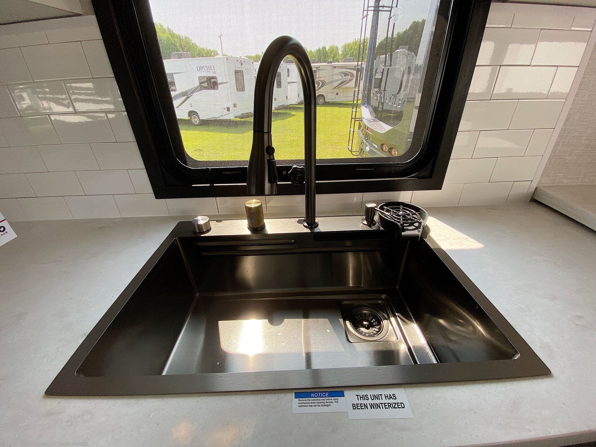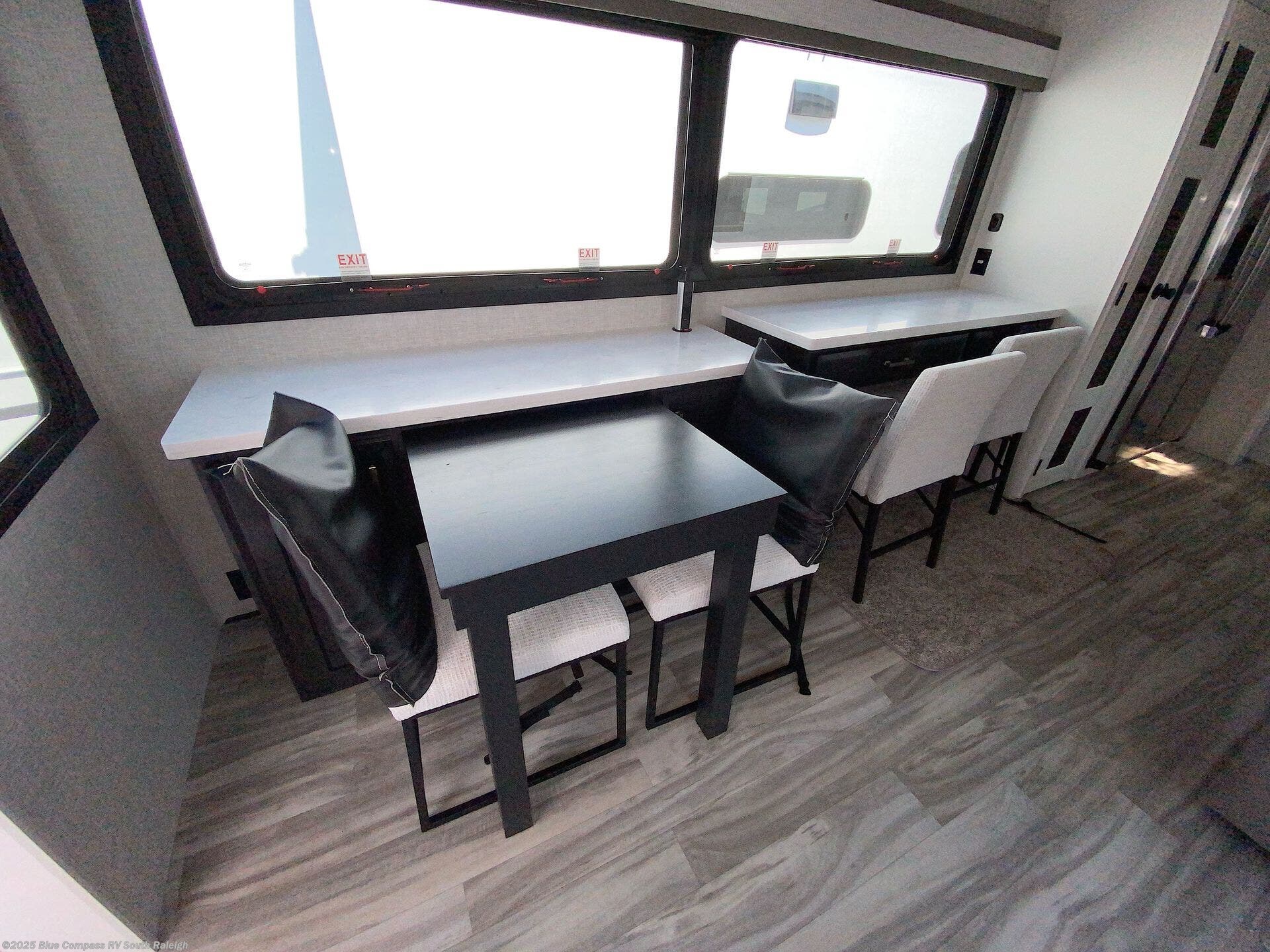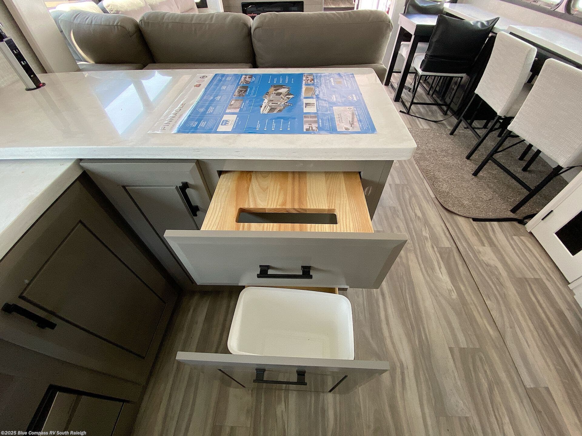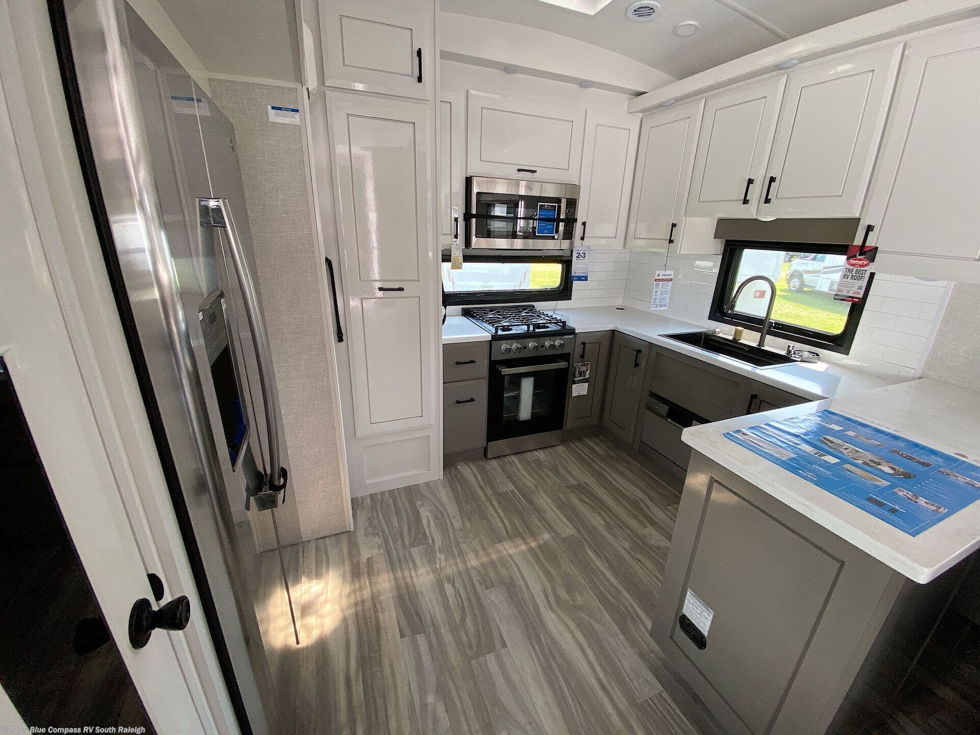 Triples slides, a desk/coffee bar, fireplace, and a huge master bath in front all indicate the kind of vacation you will experience in this Pinnacle Fifth Wheel! As you enter, a convenient half bath is located straight ahead. Slightly to your left, a nice seating area for gathering with family or friends to relax and watch TV, enjoy the fireplace while reading a book or watching a movie, and the dining table with chairs. The dinette slide also houses a 21 cu. ft. residential refrigerator and pantry. The rear kitchen features a u-shaped counter, all the appliances you need to cook like at home, even a pull-out butcher block space for chopping up your veggies. Back through and up the steps to your right in front, the master bedroom will make you feel like royalty with its king bed, plus luxurious full rear bath. A huge vanity with dual bath sinks will allow you both to get ready at the same time, plus there is a walk-in shower with a seat for added convenience. Speaking of walk-in, you will also love the spacious walk-in closet that includes washer/dryer prep.