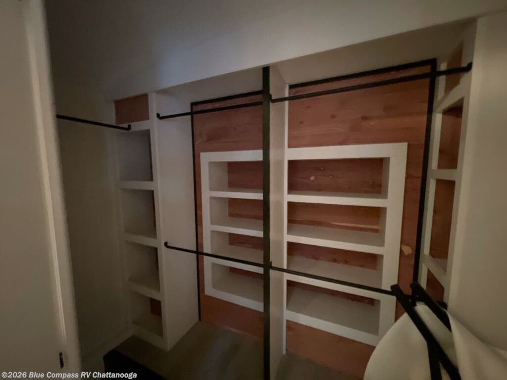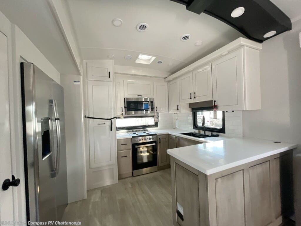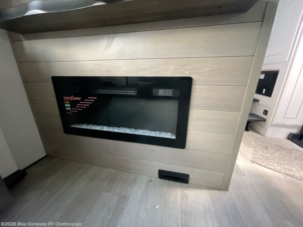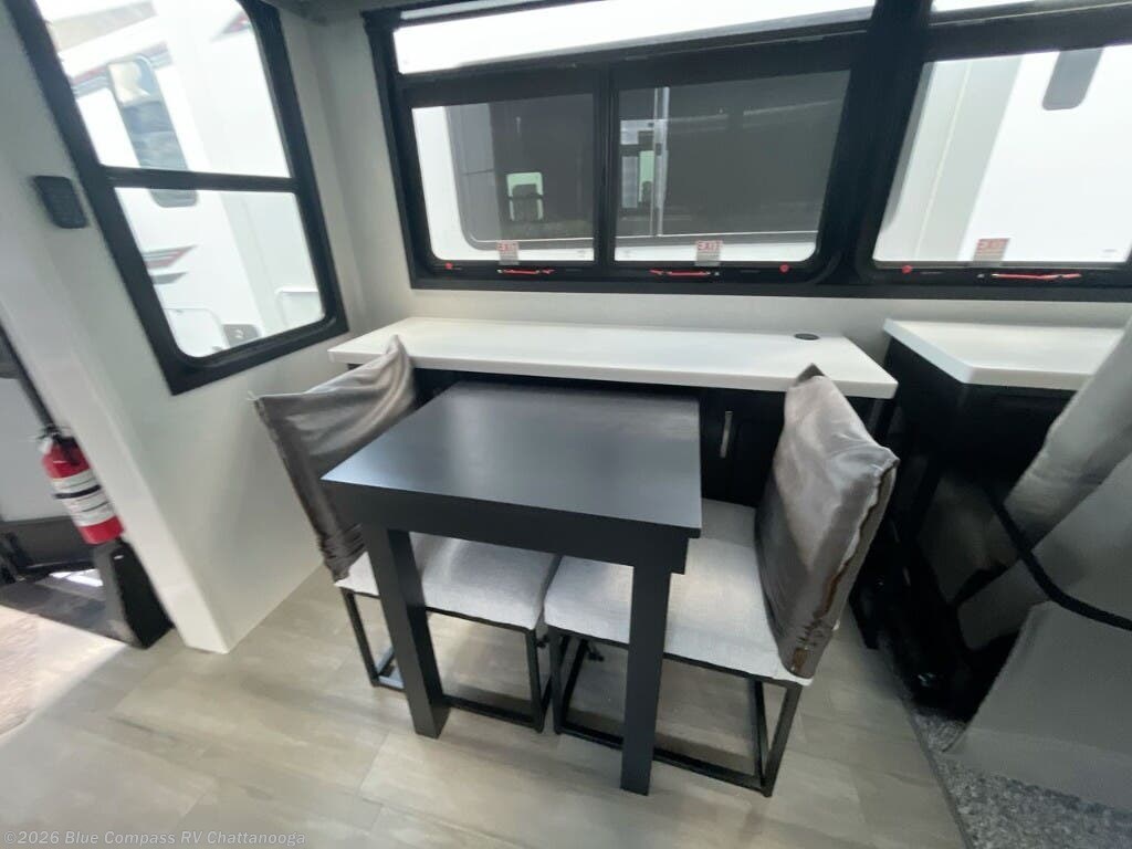 Triples slides, a desk/coffee bar, fireplace, and a huge master bath in front all indicate the kind of vacation you will experience in this Pinnacle Fifth Wheel! As you enter, a convenient half bath is located straight ahead. Slightly to your left, a nice seating area for gathering with family or friends to relax and watch TV, enjoy the fireplace while reading a book or watching a movie, and the dining table with chairs. The dinette slide also houses a 21 cu. ft. residential refrigerator and pantry. The rear kitchen features a u-shaped counter, all the appliances you need to cook like at home, even a pull-out butcher block space for chopping up your veggies. Back through and up the steps to your right in front, the master bedroom will make you feel like royalty with its king bed, plus luxurious full rear bath. A huge vanity with dual bath sinks will allow you both to get ready at the same time, plus there is a walk-in shower with a seat for added convenience. Speaking of walk-in, you will also love the spacious walk-in closet that includes washer/dryer prep.
