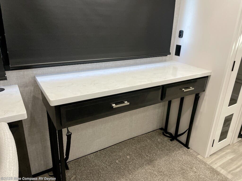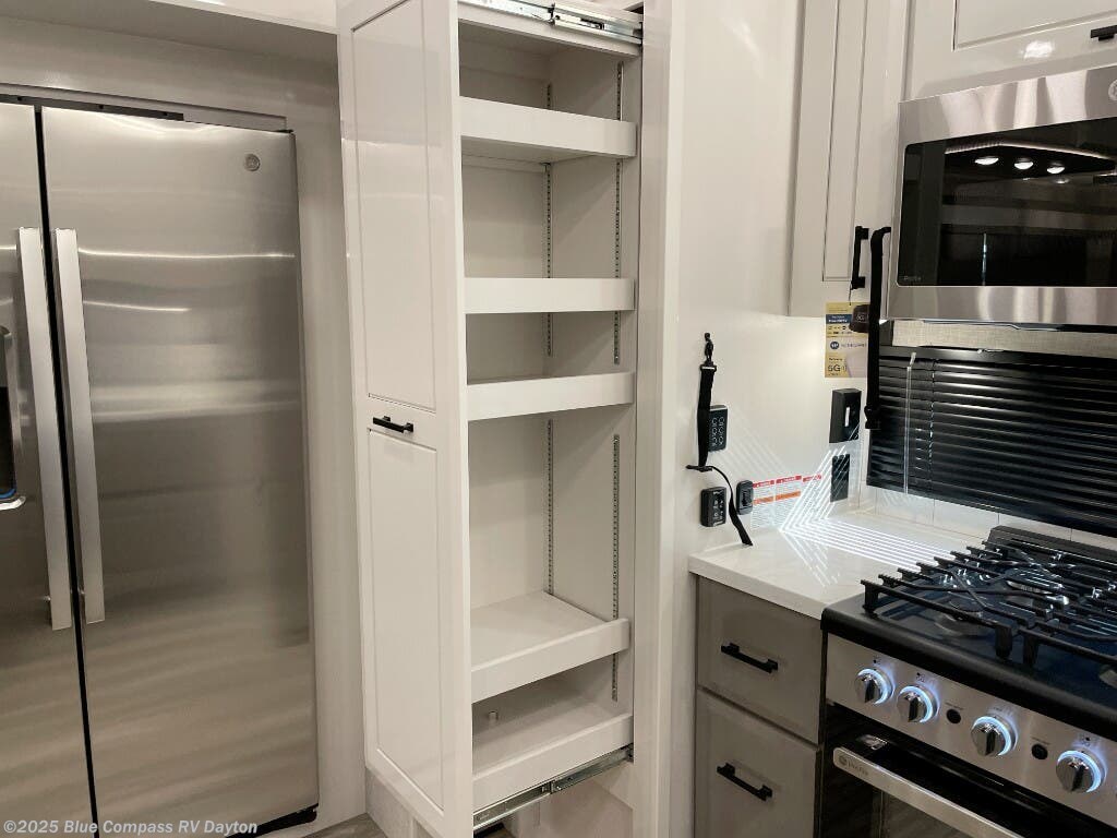 Triples slides, a desk/coffee bar, fireplace, and a huge master bath in front all indicate the kind of vacation you will experience in this Pinnacle Fifth Wheel! As you enter, a convenient half bath is located straight ahead. Slightly to your left, a nice seating area for gathering with family or friends to relax and watch TV, enjoy the fireplace while reading a book or watching a movie, and the dining table with chairs. The dinette slide also houses a 21 cu. ft. residential refrigerator and pantry. The rear kitchen features a u-shaped counter, all the appliances you need to cook like at home, even a pull-out butcher block space for chopping up your veggies. Back through and up the steps to your right in front, the master bedroom will make you feel like royalty with its king bed, plus luxurious full rear bath. A huge vanity with dual bath sinks will allow you both to get ready at the same time, plus there is a walk-in shower with a seat for added convenience. Speaking of walk-in, you will also love the spacious walk-in closet that includes washer/dryer prep.