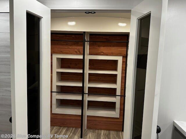 Triples slides, a desk/coffee bar, fireplace, and a huge master bath in front all indicate the kind of vacation you will experience in this Pinnacle Fifth Wheel! As you enter, a convenient half bath is located straight ahead. Slightly to your left, a nice seating area for gathering with family or friends to relax and watch TV, enjoy the fireplace while reading a book or watching a movie, and the dining table with chairs. The dinette slide also houses a 21 cu. ft. residential refrigerator and pantry. The rear kitchen features a u-shaped counter, all the appliances you need to cook like at home, even a pull-out butcher block space for chopping up your veggies. Back through and up the steps to your right in front, the master bedroom will make you feel like royalty with its king bed, plus luxurious full rear bath. A huge vanity with dual bath sinks will allow you both to get ready at the same time, plus there is a walk-in shower with a seat for added convenience. Speaking of walk-in, you will also love the spacious walk-in closet that includes washer/dryer prep.