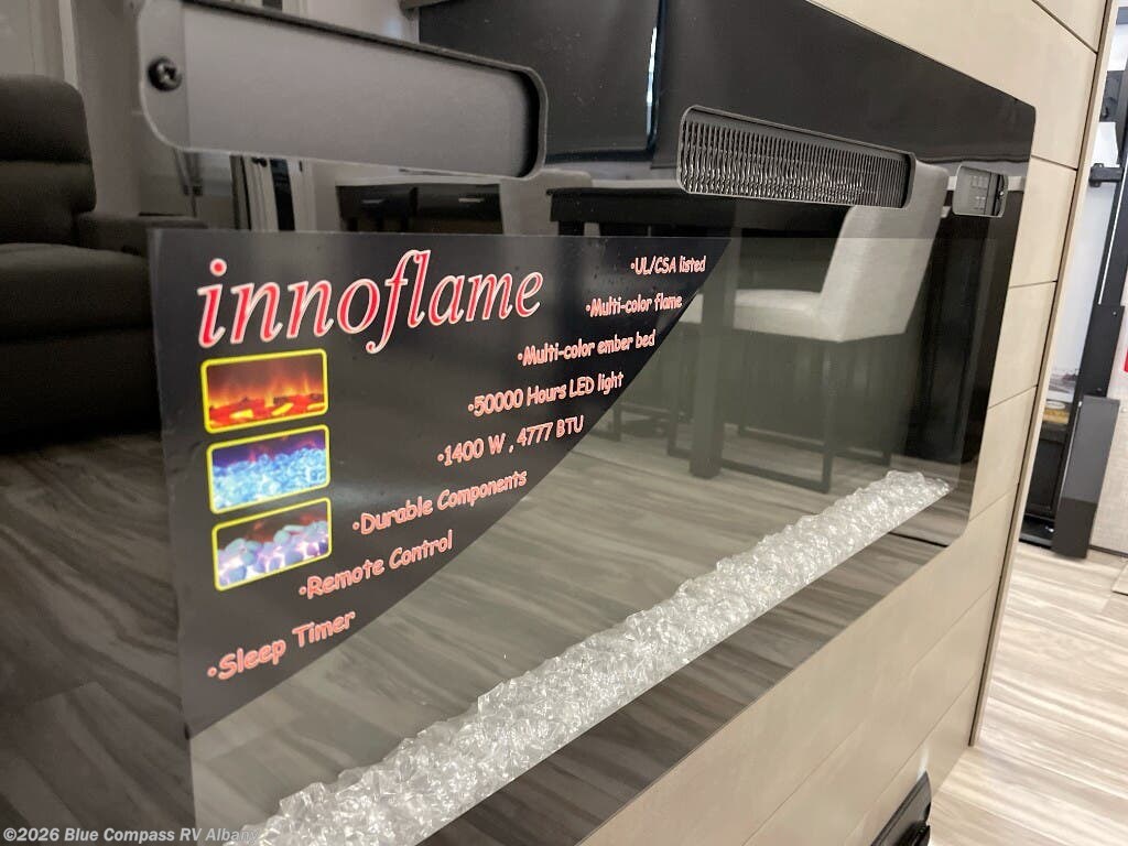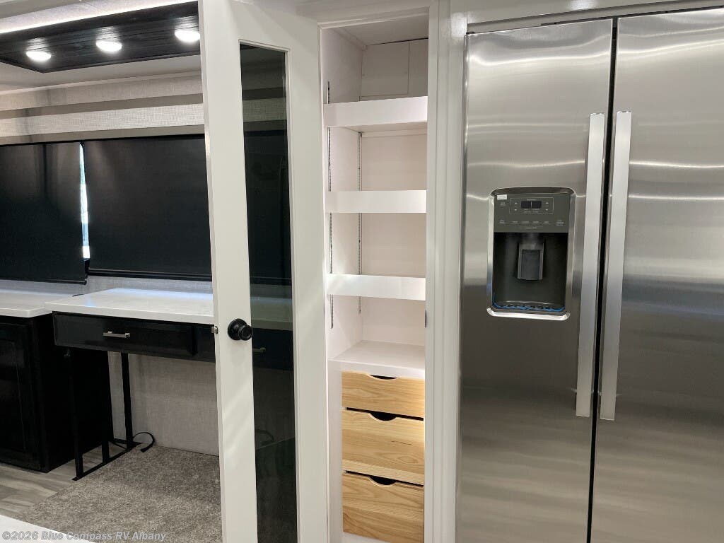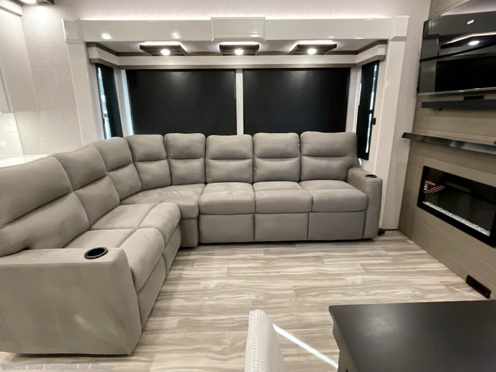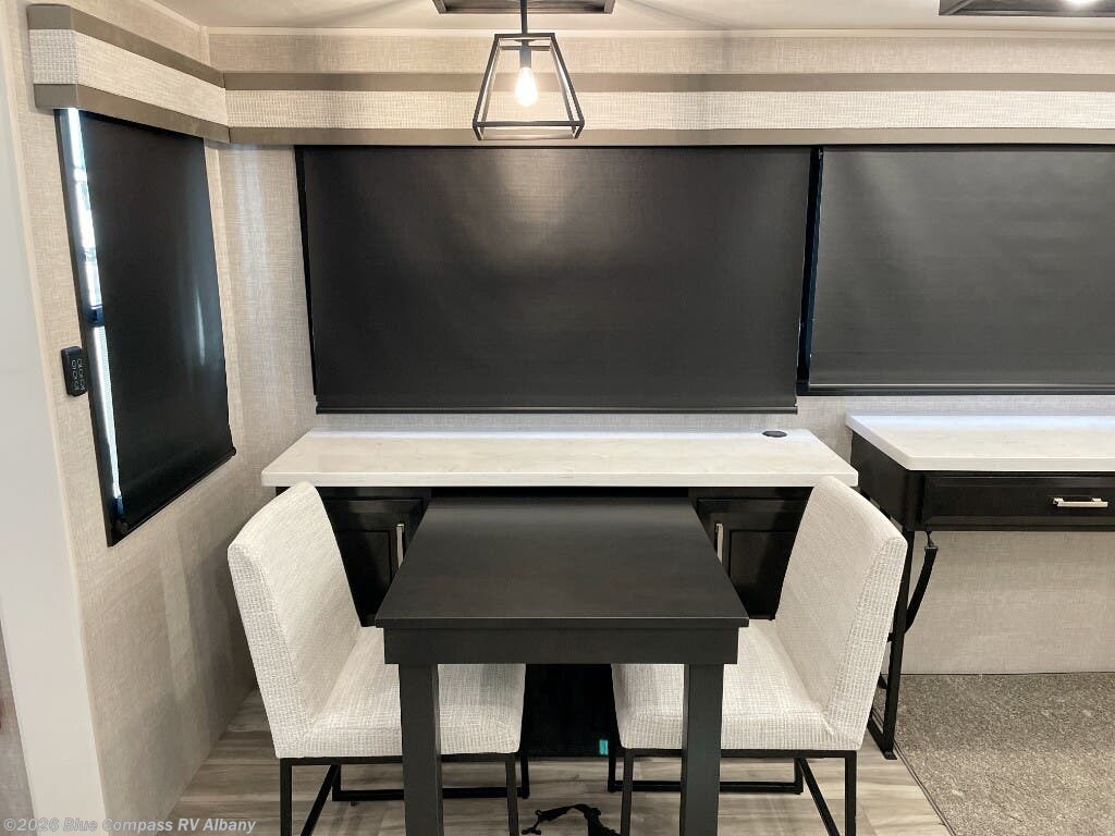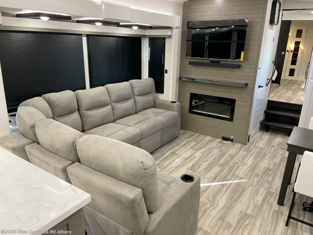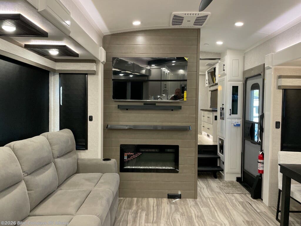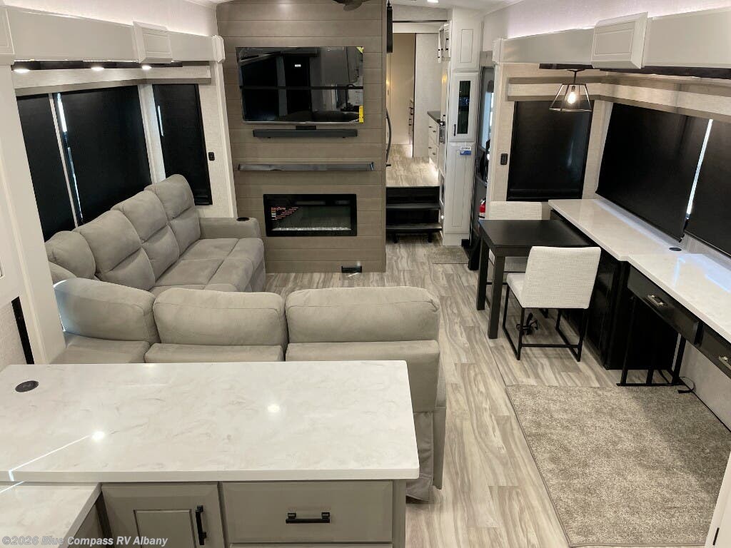 Triples slides, a desk/coffee bar, fireplace, and a huge master bath in front all indicate the kind of vacation you will experience in this Pinnacle Fifth Wheel! As you enter, a convenient half bath is located straight ahead. Slightly to your left, a nice seating area for gathering with family or friends to relax and watch TV, enjoy the fireplace while reading a book or watching a movie, and the dining table with chairs. The dinette slide also houses a 21 cu. ft. residential refrigerator and pantry. The rear kitchen features a u-shaped counter, all the appliances you need to cook like at home, even a pull-out butcher block space for chopping up your veggies. Back through and up the steps to your right in front, the master bedroom will make you feel like royalty with its king bed, plus luxurious full rear bath. A huge vanity with dual bath sinks will allow you both to get ready at the same time, plus there is a walk-in shower with a seat for added convenience. Speaking of walk-in, you will also love the spacious walk-in closet that includes washer/dryer prep.