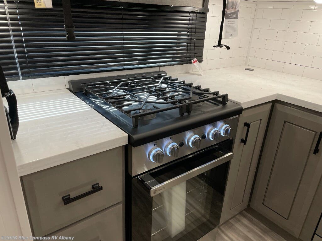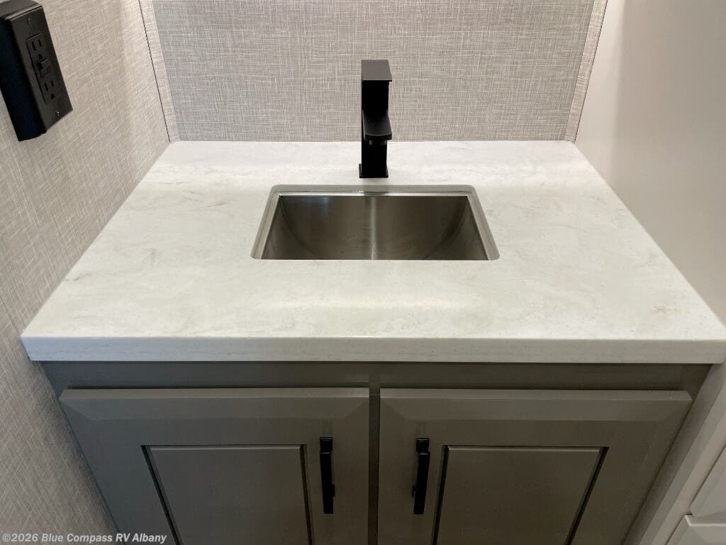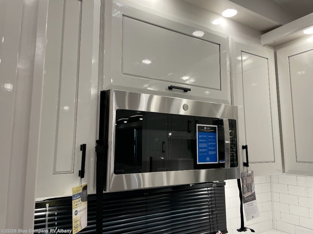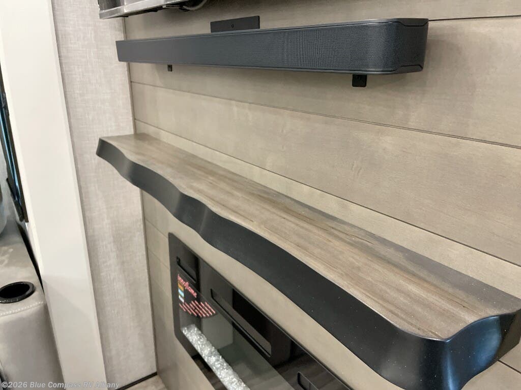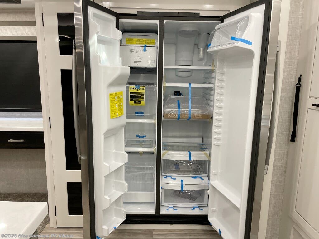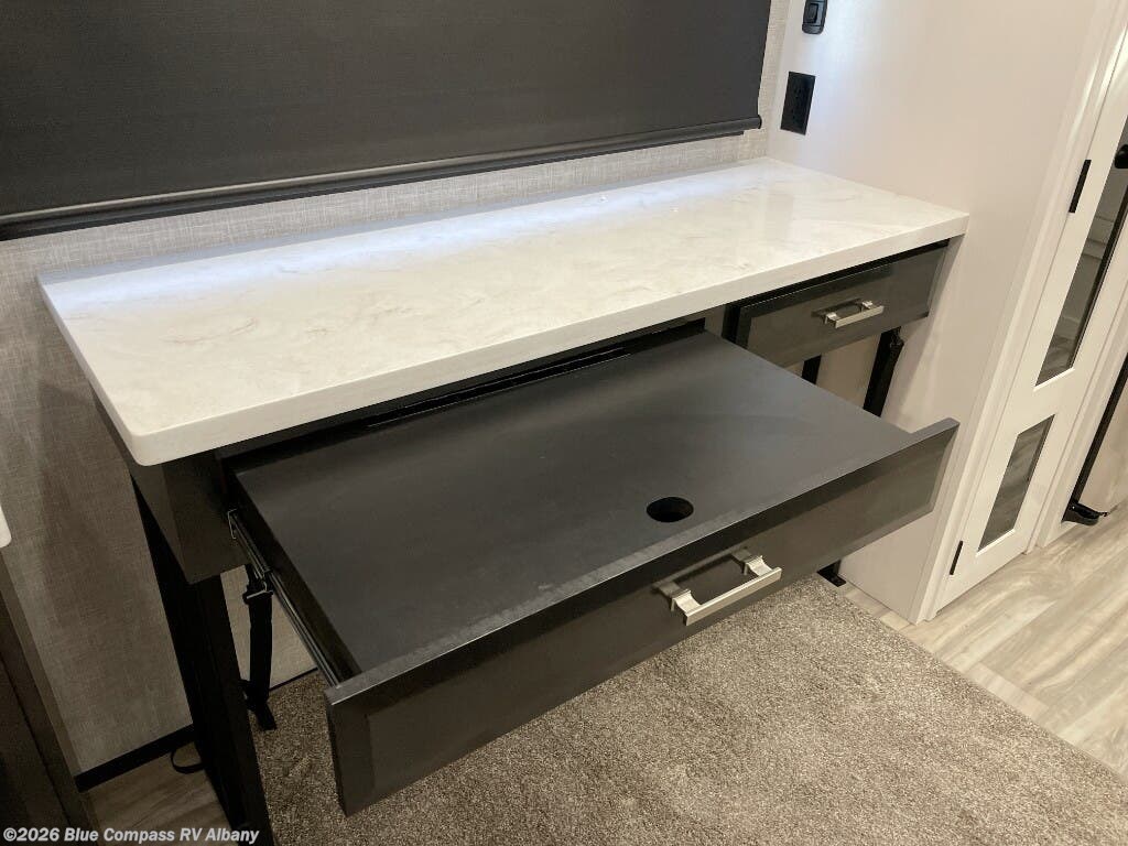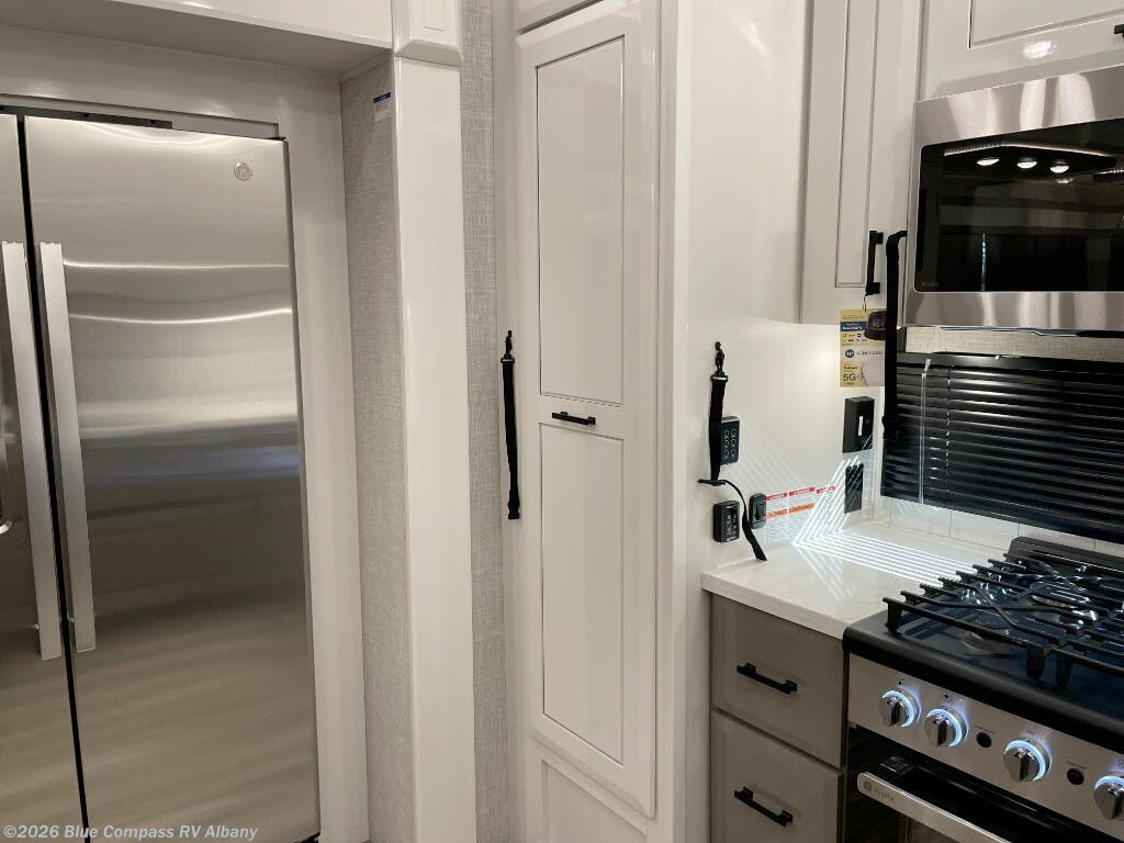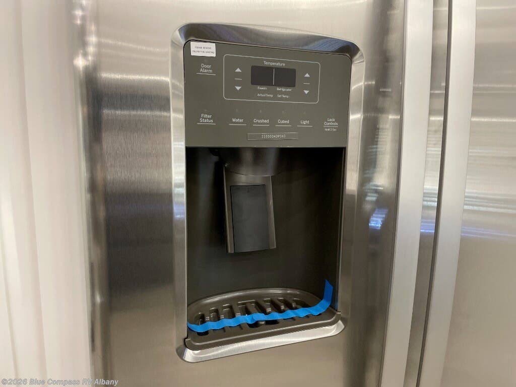 Triples slides, a desk/coffee bar, fireplace, and a huge master bath in front all indicate the kind of vacation you will experience in this Pinnacle Fifth Wheel! As you enter, a convenient half bath is located straight ahead. Slightly to your left, a nice seating area for gathering with family or friends to relax and watch TV, enjoy the fireplace while reading a book or watching a movie, and the dining table with chairs. The dinette slide also houses a 21 cu. ft. residential refrigerator and pantry. The rear kitchen features a u-shaped counter, all the appliances you need to cook like at home, even a pull-out butcher block space for chopping up your veggies. Back through and up the steps to your right in front, the master bedroom will make you feel like royalty with its king bed, plus luxurious full rear bath. A huge vanity with dual bath sinks will allow you both to get ready at the same time, plus there is a walk-in shower with a seat for added convenience. Speaking of walk-in, you will also love the spacious walk-in closet that includes washer/dryer prep.