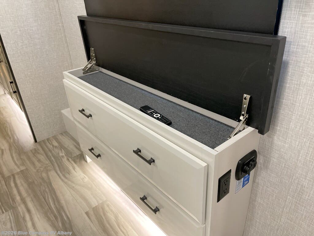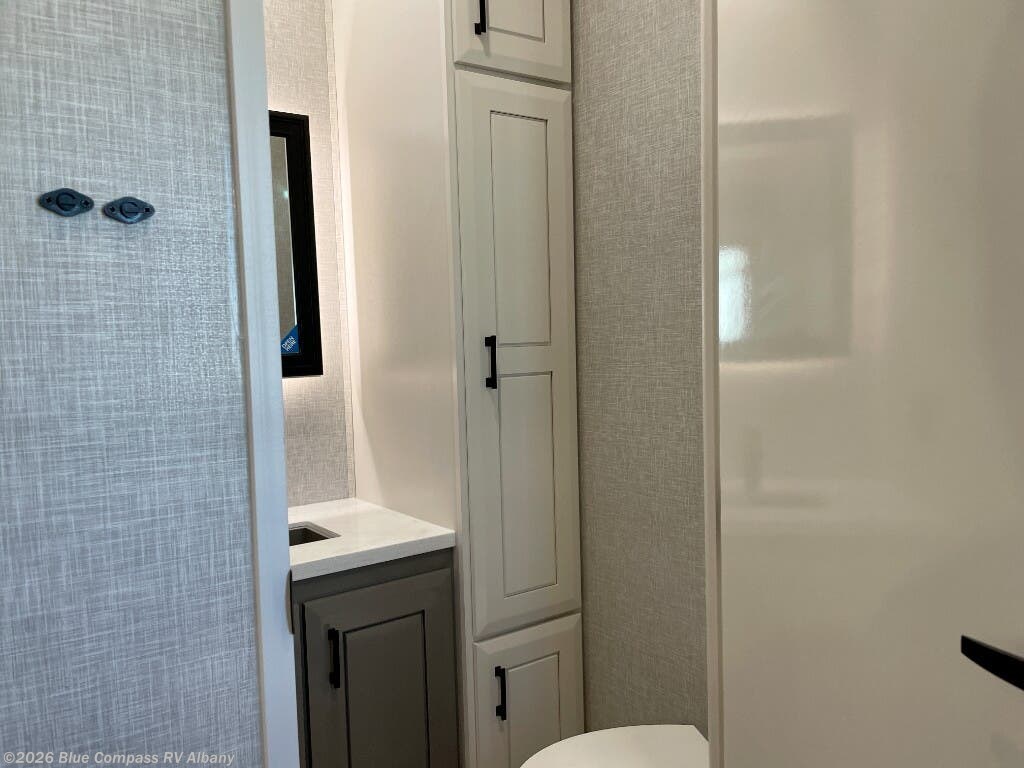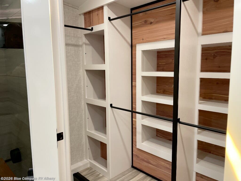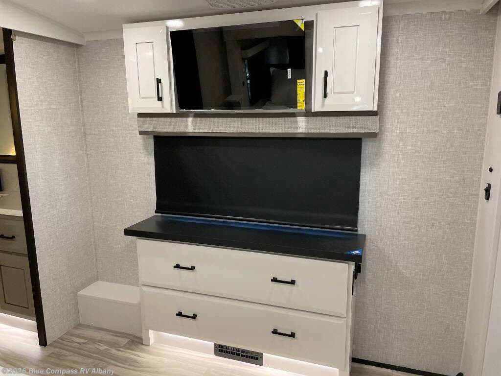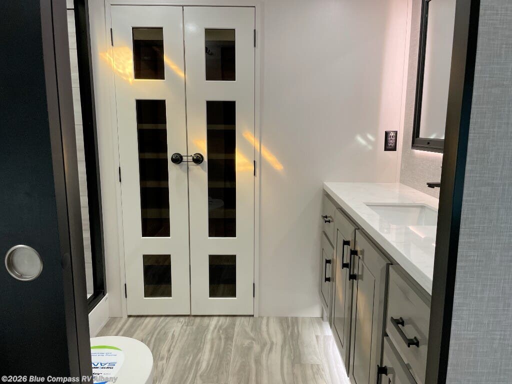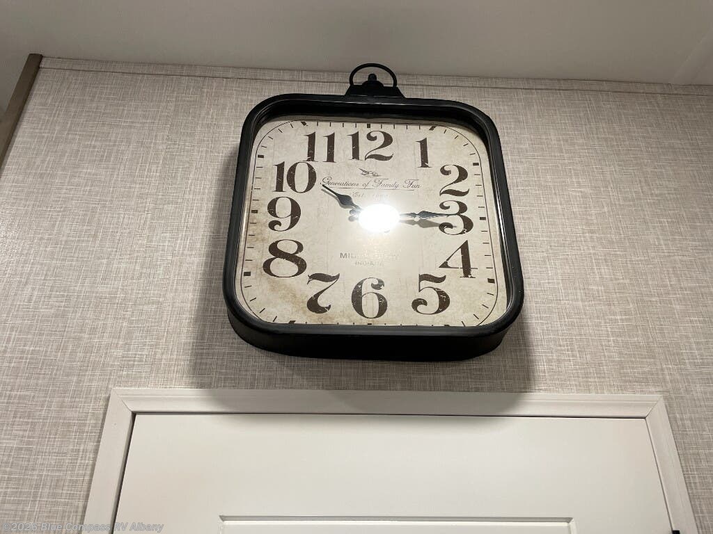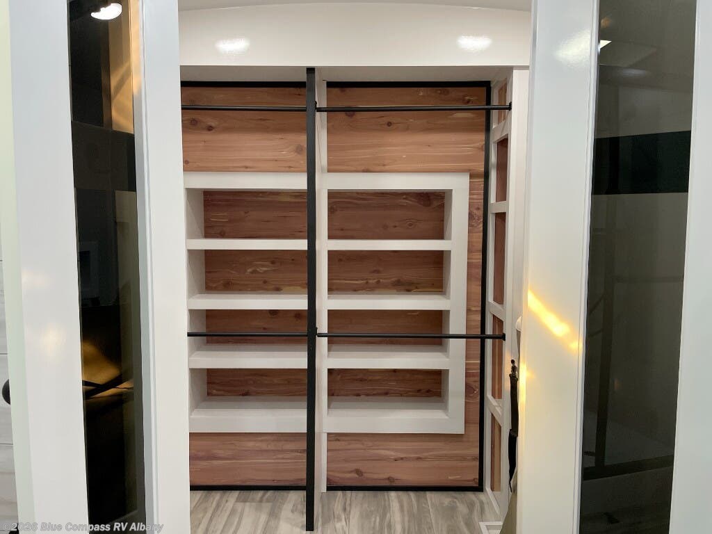 Triples slides, a desk/coffee bar, fireplace, and a huge master bath in front all indicate the kind of vacation you will experience in this Pinnacle Fifth Wheel! As you enter, a convenient half bath is located straight ahead. Slightly to your left, a nice seating area for gathering with family or friends to relax and watch TV, enjoy the fireplace while reading a book or watching a movie, and the dining table with chairs. The dinette slide also houses a 21 cu. ft. residential refrigerator and pantry. The rear kitchen features a u-shaped counter, all the appliances you need to cook like at home, even a pull-out butcher block space for chopping up your veggies. Back through and up the steps to your right in front, the master bedroom will make you feel like royalty with its king bed, plus luxurious full rear bath. A huge vanity with dual bath sinks will allow you both to get ready at the same time, plus there is a walk-in shower with a seat for added convenience. Speaking of walk-in, you will also love the spacious walk-in closet that includes washer/dryer prep.