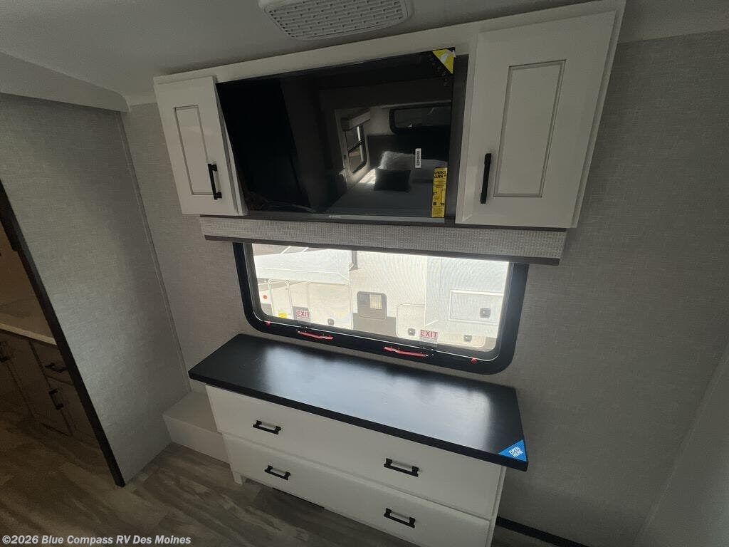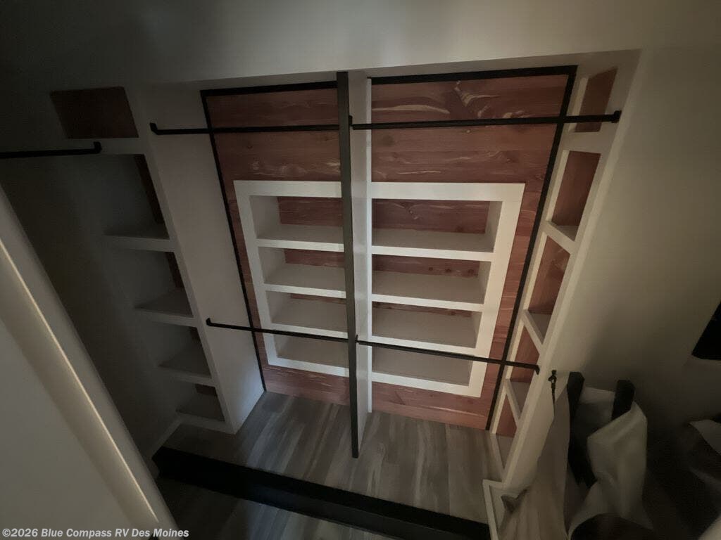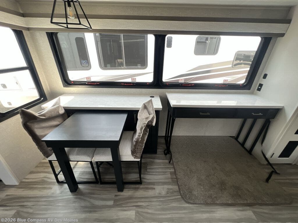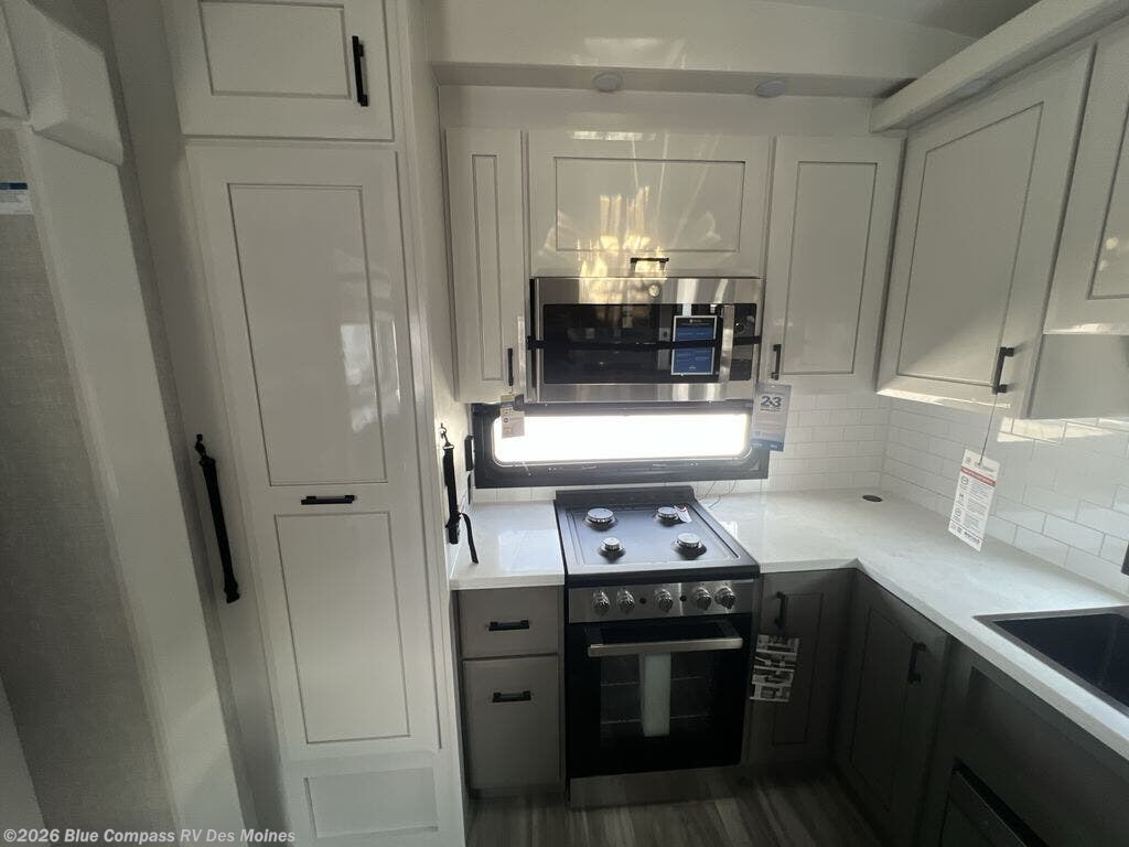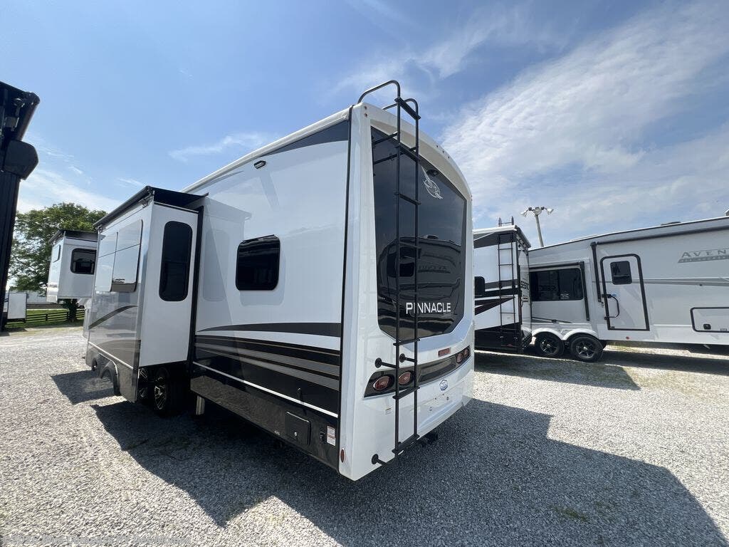 Triples slides, a desk/coffee bar, fireplace, and a huge master bath in front all indicate the kind of vacation you will experience in this Pinnacle Fifth Wheel! As you enter, a convenient half bath is located straight ahead. Slightly to your left, a nice seating area for gathering with family or friends to relax and watch TV, enjoy the fireplace while reading a book or watching a movie, and the dining table with chairs. The dinette slide also houses a 21 cu. ft. residential refrigerator and pantry. The rear kitchen features a u-shaped counter, all the appliances you need to cook like at home, even a pull-out butcher block space for chopping up your veggies. Back through and up the steps to your right in front, the master bedroom will make you feel like royalty with its king bed, plus luxurious full rear bath. A huge vanity with dual bath sinks will allow you both to get ready at the same time, plus there is a walk-in shower with a seat for added convenience. Speaking of walk-in, you will also love the spacious walk-in closet that includes washer/dryer prep.