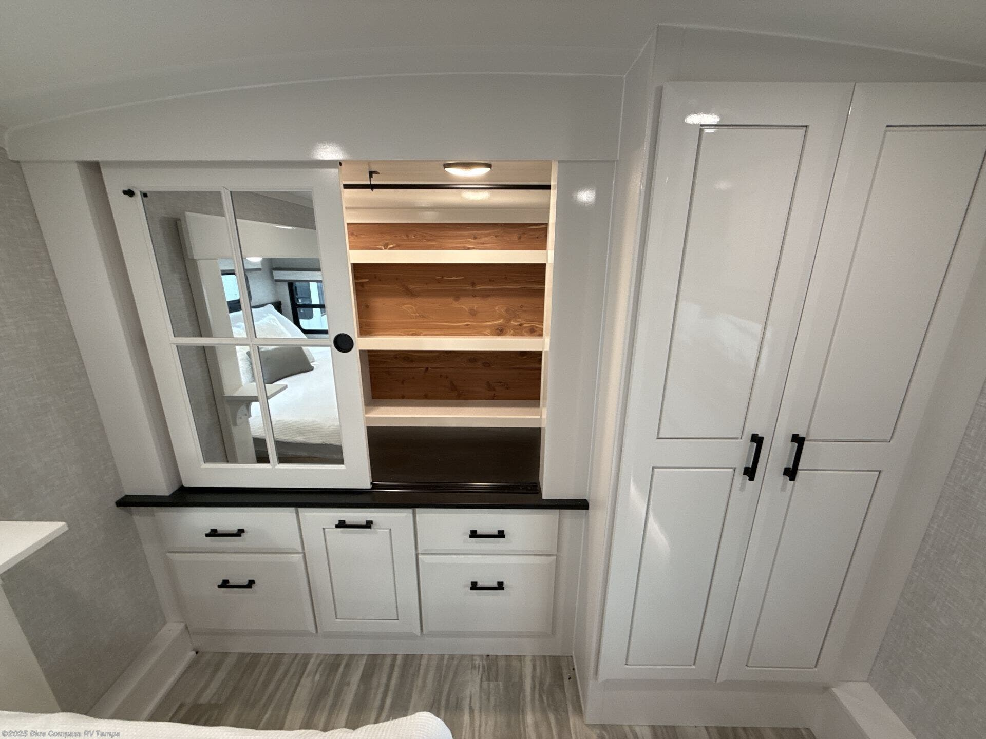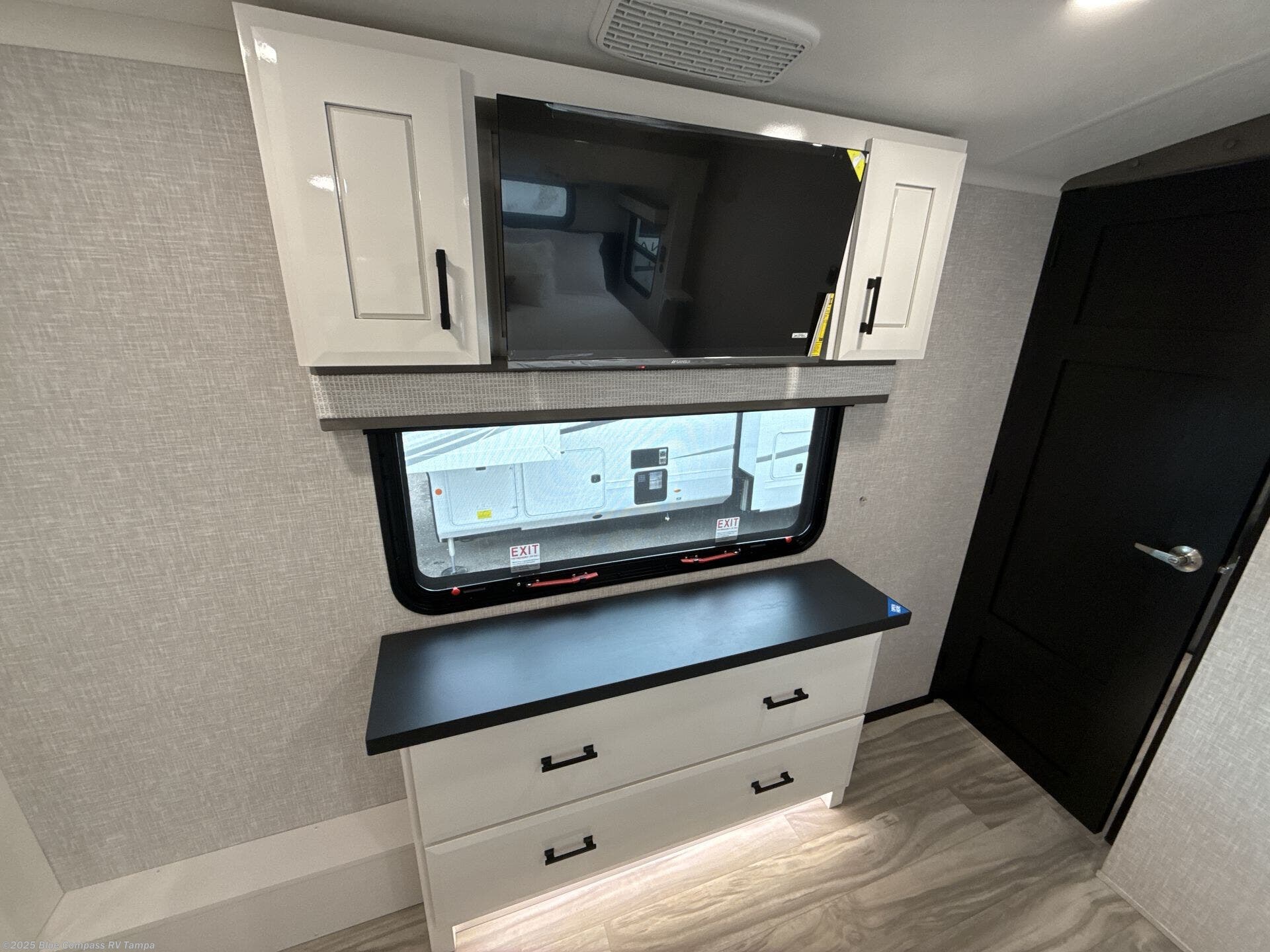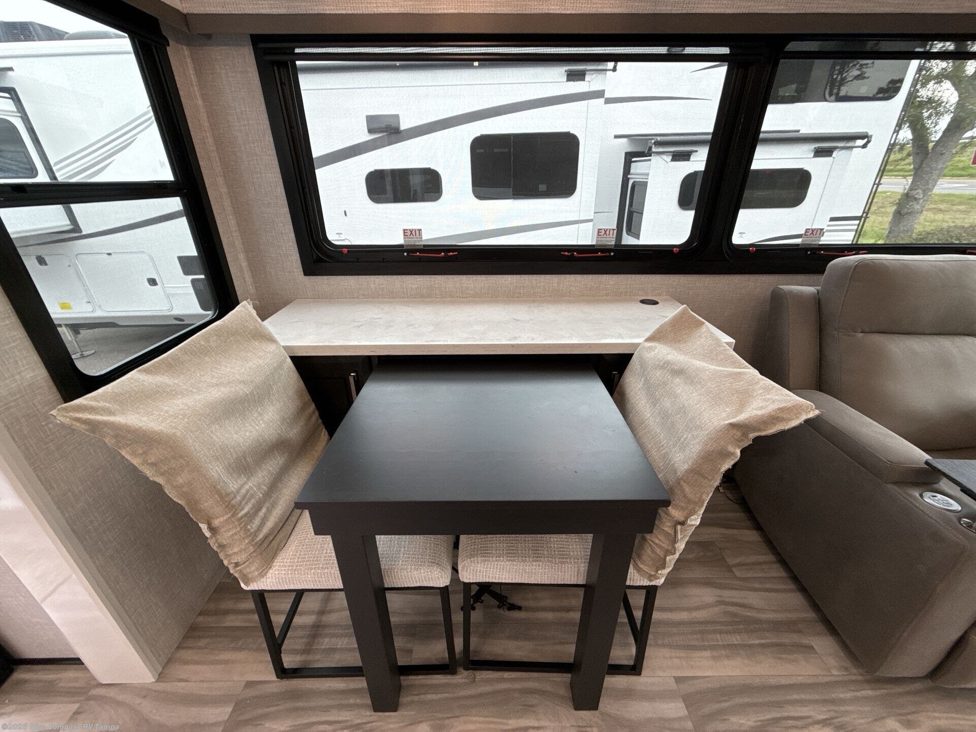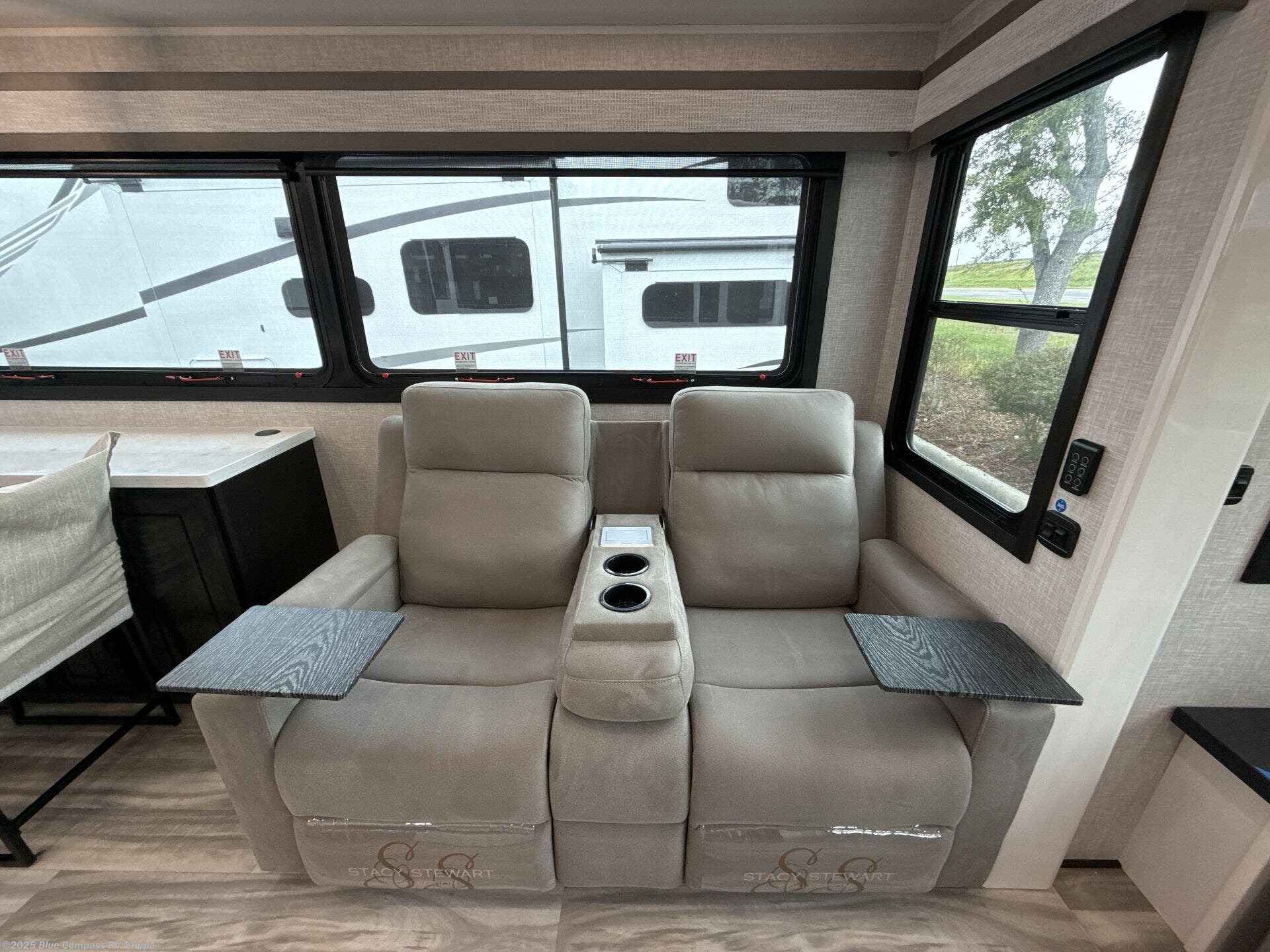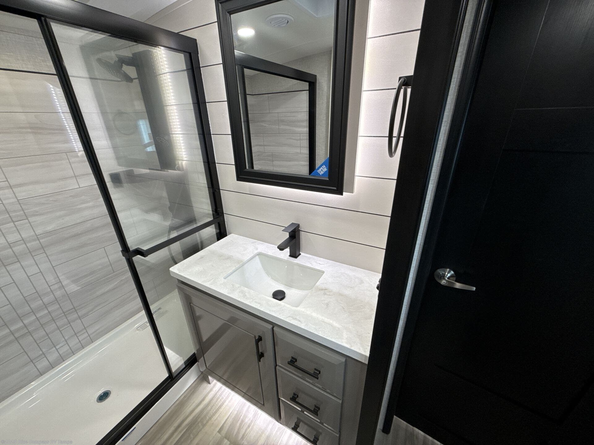 Your search is over now with this perfect luxury fifth wheel for your crew of four. Once you get settled at the campground, take a load off on the theater seat sacross from the TV lift and fireplace. There is also a free-standing table here and a tri-fold sofa that will double as additional seating and sleeping space. The kitchen island includes a pull-out cutting board extension for tons of prep space and even a dishwasher for easy clean up, and a residential range to use for cooking as well as a convection microwave oven with built-in air fryer. Head to the full bath that includes a walk-in shower with a seat, an LED backlit custom framed mirror, plus residential bath backsplash for added luxury. You're gong to love the front private bedroom with its king bed slide out, 32" TV, plus a large front closet complete with a hamper and drawers, and an area that features washer/dryer prep in case you wish to add that convenience as well.