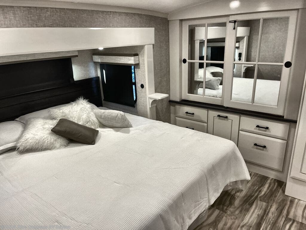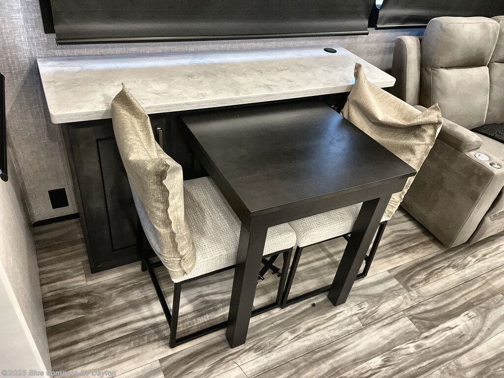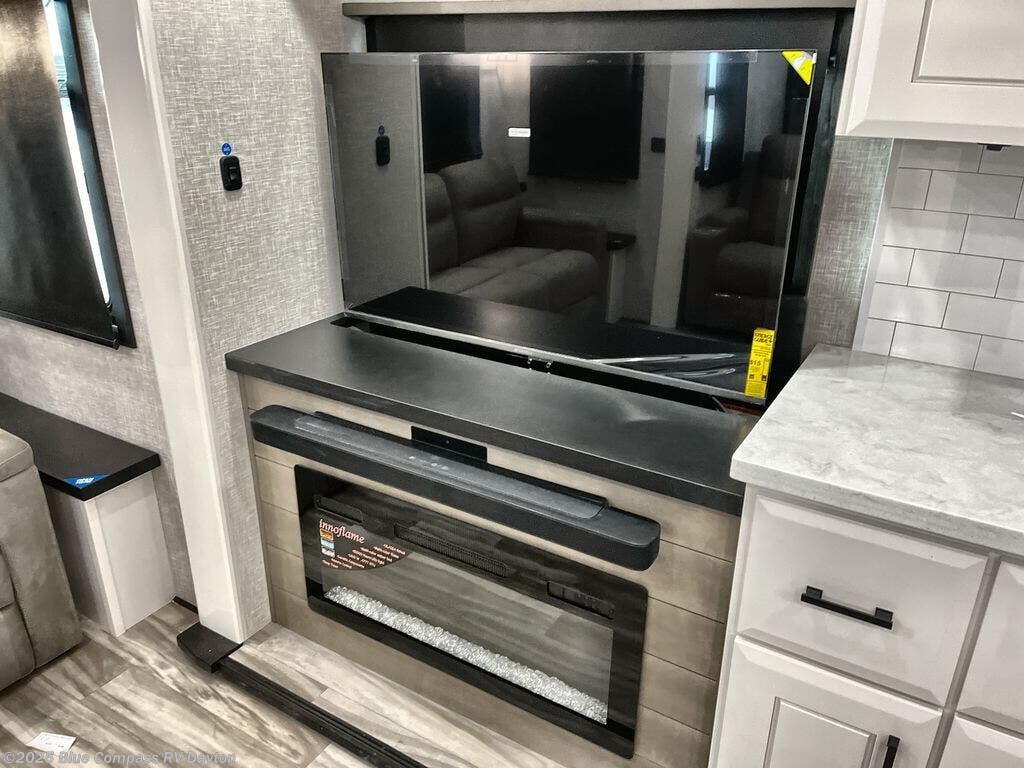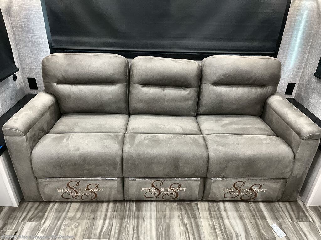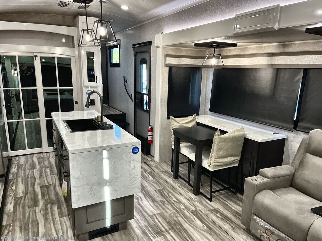 Your search is over now with this perfect luxury fifth wheel for your crew of four. Once you get settled at the campground, take a load off on the theater seat sacross from the TV lift and fireplace. There is also a free-standing table here and a tri-fold sofa that will double as additional seating and sleeping space. The kitchen island includes a pull-out cutting board extension for tons of prep space and even a dishwasher for easy clean up, and a residential range to use for cooking as well as a convection microwave oven with built-in air fryer. Head to the full bath that includes a walk-in shower with a seat, an LED backlit custom framed mirror, plus residential bath backsplash for added luxury. You're gong to love the front private bedroom with its king bed slide out, 32" TV, plus a large front closet complete with a hamper and drawers, and an area that features washer/dryer prep in case you wish to add that convenience as well.