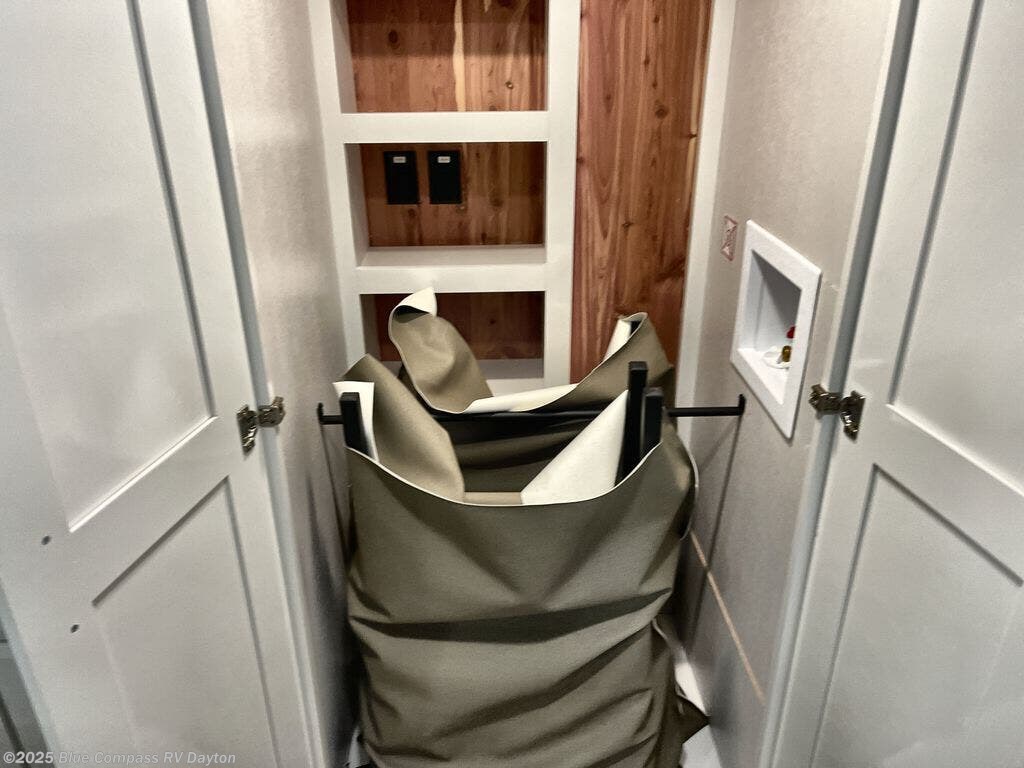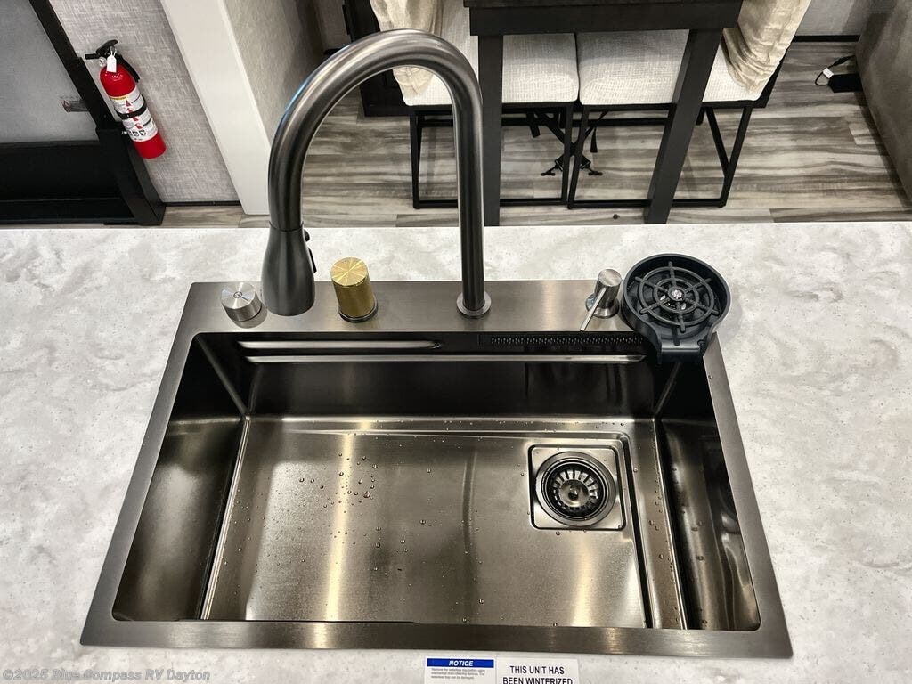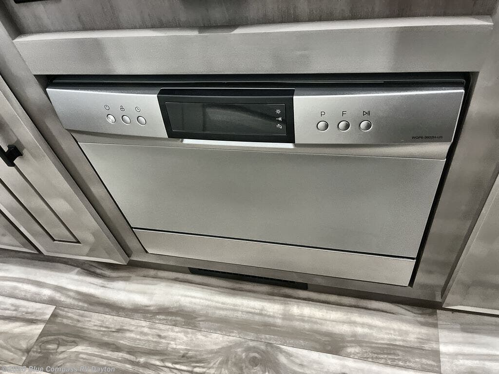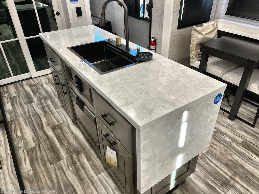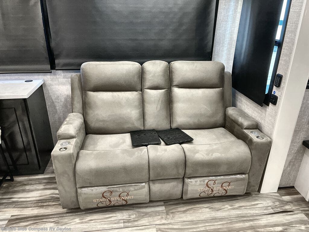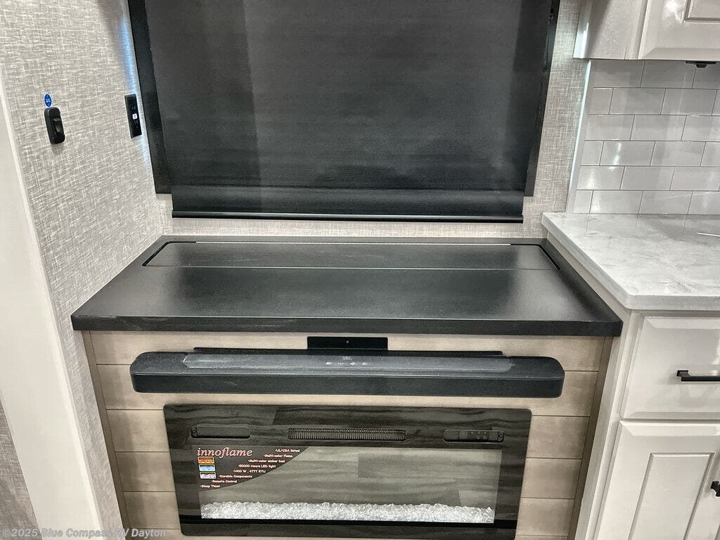 Your search is over now with this perfect luxury fifth wheel for your crew of four. Once you get settled at the campground, take a load off on the theater seat sacross from the TV lift and fireplace. There is also a free-standing table here and a tri-fold sofa that will double as additional seating and sleeping space. The kitchen island includes a pull-out cutting board extension for tons of prep space and even a dishwasher for easy clean up, and a residential range to use for cooking as well as a convection microwave oven with built-in air fryer. Head to the full bath that includes a walk-in shower with a seat, an LED backlit custom framed mirror, plus residential bath backsplash for added luxury. You're gong to love the front private bedroom with its king bed slide out, 32" TV, plus a large front closet complete with a hamper and drawers, and an area that features washer/dryer prep in case you wish to add that convenience as well.