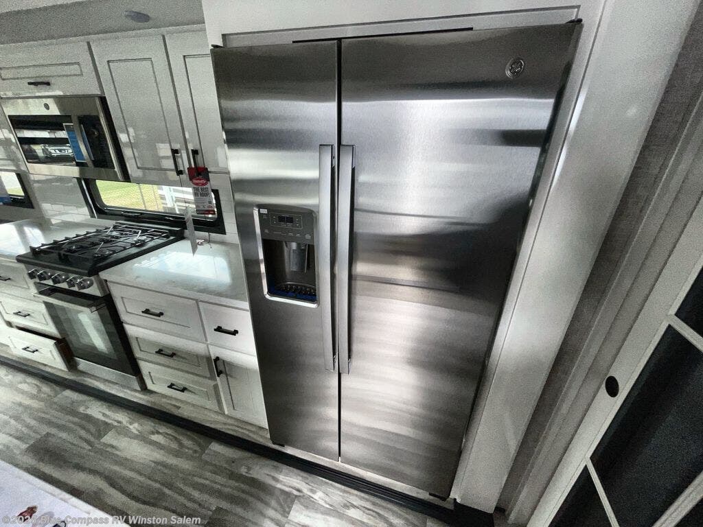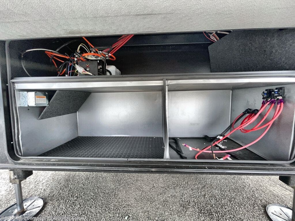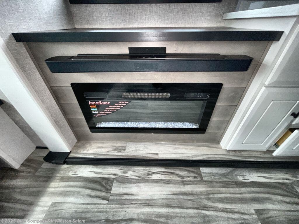 Your search is over now with this perfect luxury fifth wheel for your crew of four. Once you get settled at the campground, take a load off on the theater seat sacross from the TV lift and fireplace. There is also a free-standing table here and a tri-fold sofa that will double as additional seating and sleeping space. The kitchen island includes a pull-out cutting board extension for tons of prep space and even a dishwasher for easy clean up, and a residential range to use for cooking as well as a convection microwave oven with built-in air fryer. Head to the full bath that includes a walk-in shower with a seat, an LED backlit custom framed mirror, plus residential bath backsplash for added luxury. You're gong to love the front private bedroom with its king bed slide out, 32" TV, plus a large front closet complete with a hamper and drawers, and an area that features washer/dryer prep in case you wish to add that convenience as well.