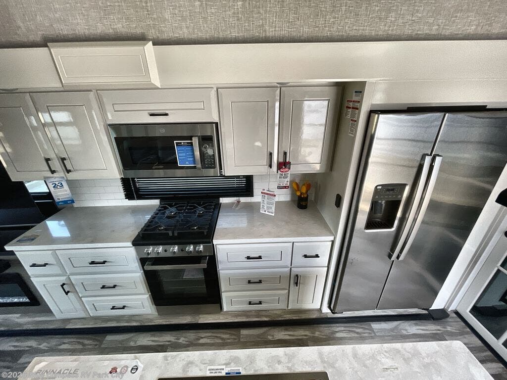 Each Pinnacle fifth wheel features Stronghold VBL lamination for the lightest, yet strongest construction in the RV industry. Add that to the Magnum Truss XL6 roof system and Climate Shield zero-degree tested weather protection and you'll be enjoying your fifth wheel for years to come. Some of the exterior conveniences you will appreciate are the Keyed-Alike lock system, the fully enclosed, universal docking center, and the 6-point hydraulic auto-leveling system for quick and easy set up. The 5 Star Handling Package will make towing a fifth wheel a walk in the park, and the two Whisper Quiet A/C units will keep you comfortable during the hot summer months. Inside, you'll enjoy the residential "Do it all" sink with pull-out kitchen faucet, glass rinse, and vegetable rinse, the handcrafted hardwood glazed cabinetry, the vinyl flooring throughout, plus many more comforts. There is even a central vacuum system, a wireless remote control system, USB ports throughout, plus many more conveniences to make each trip enjoyable.