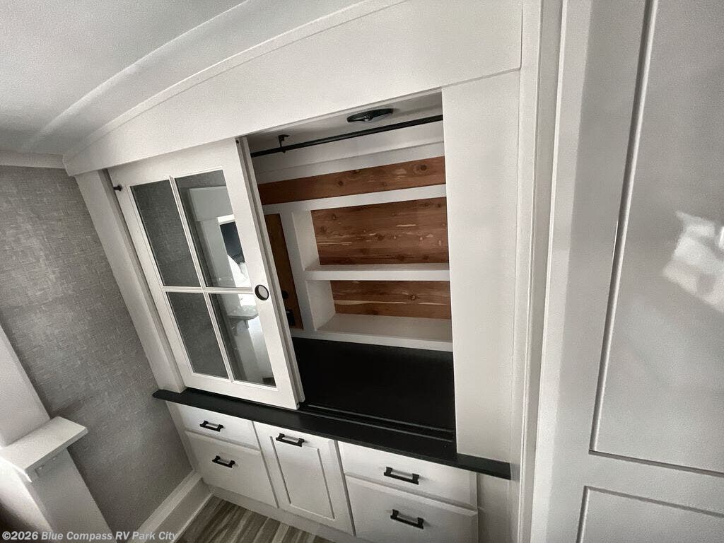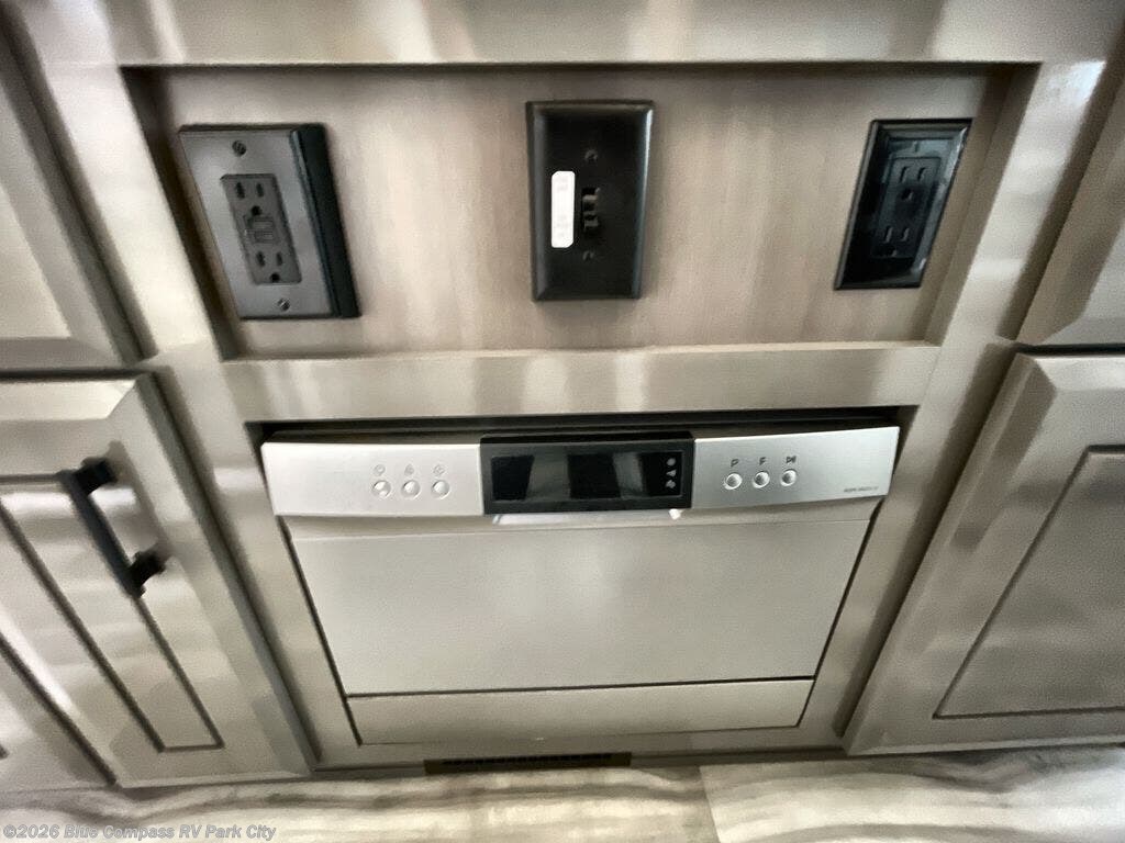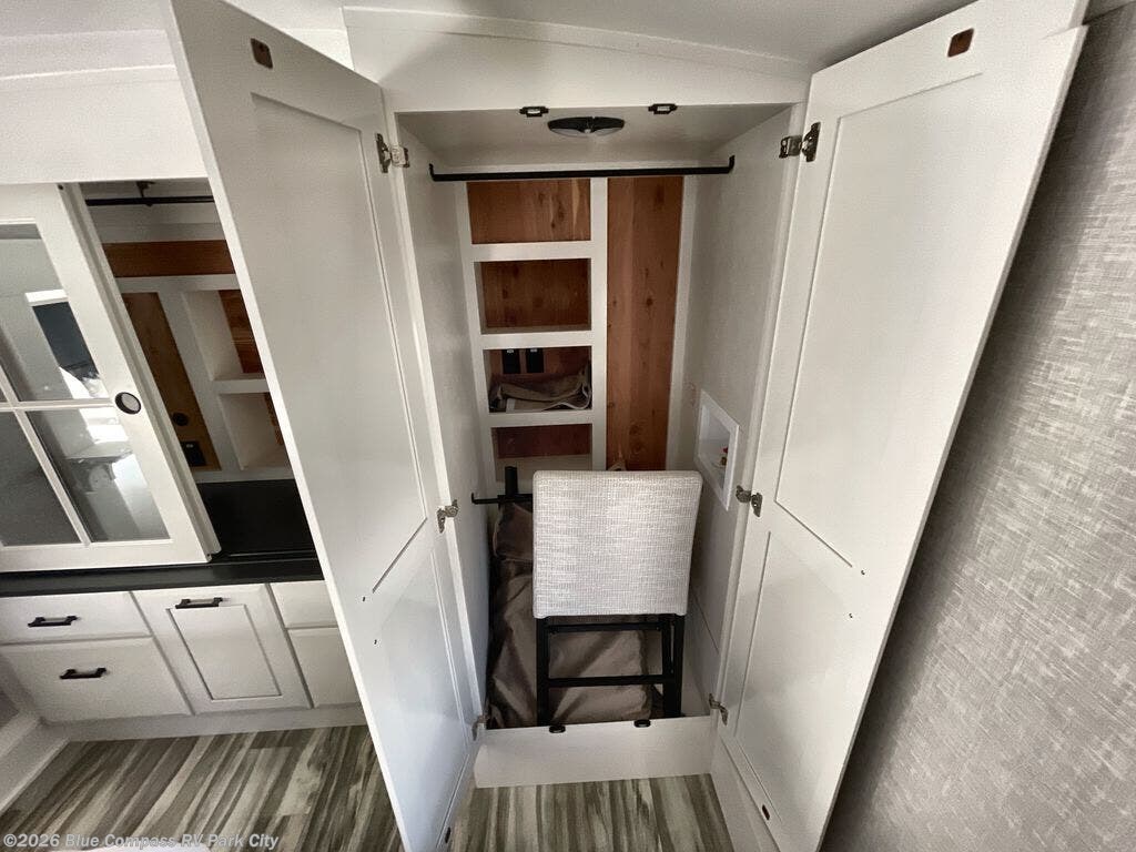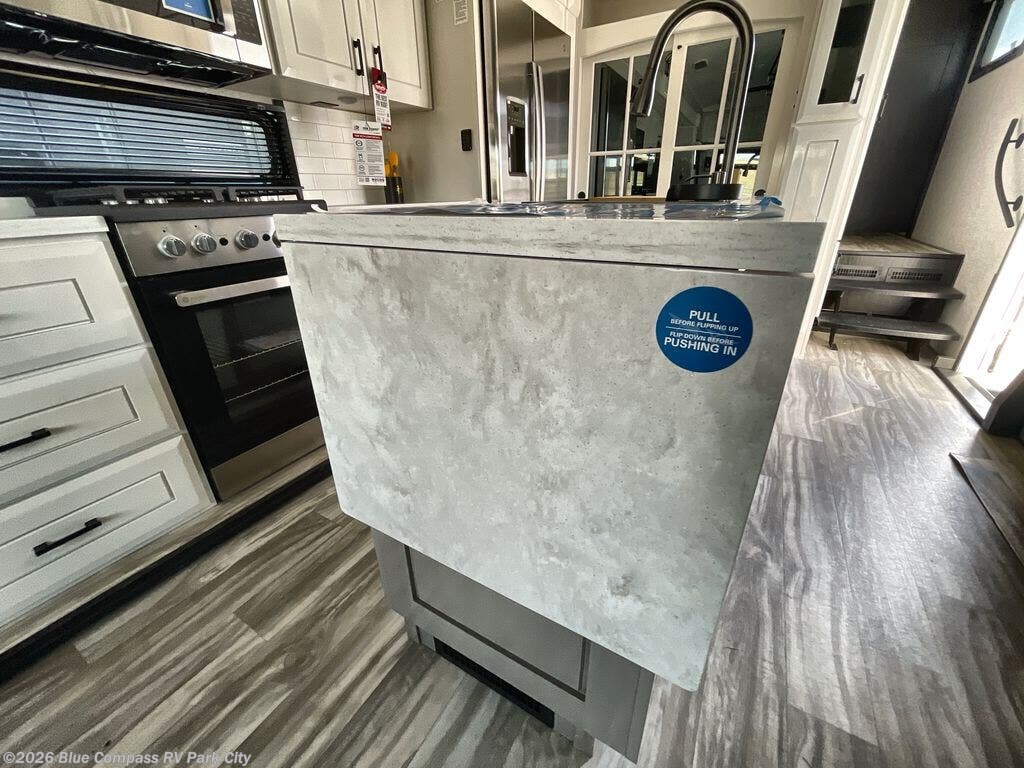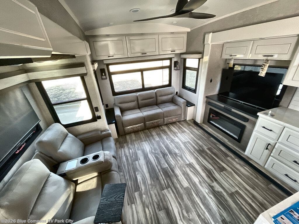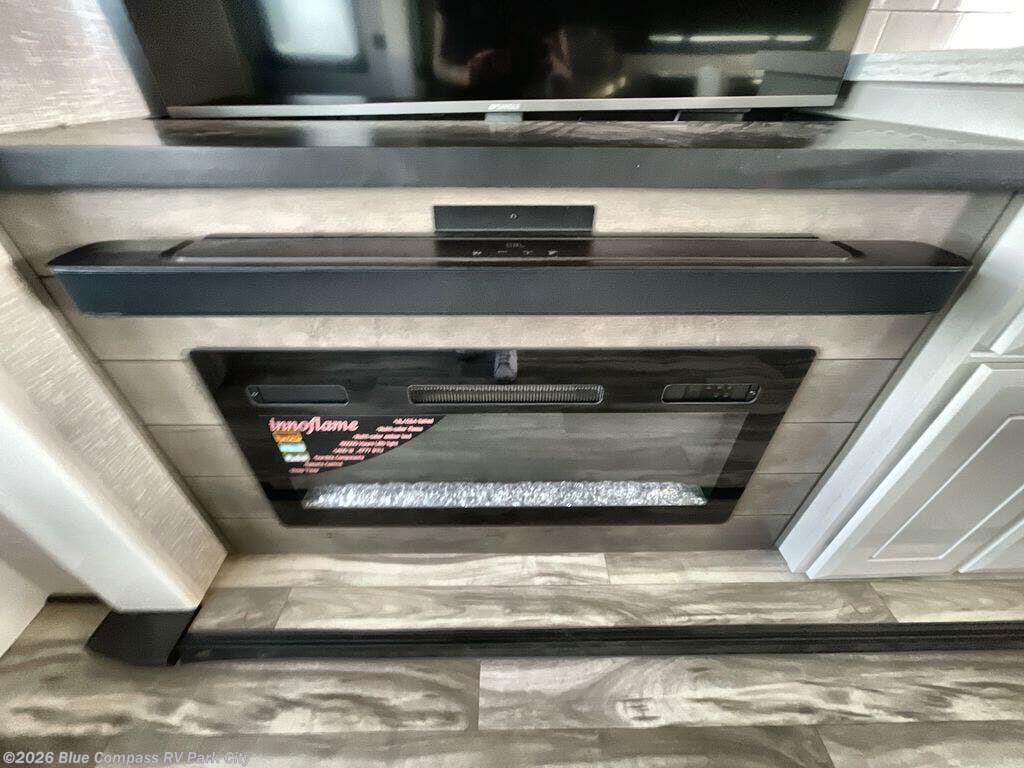 Your search is over now with this perfect luxury fifth wheel for your crew of four. Once you get settled at the campground, take a load off on the theater seat sacross from the TV lift and fireplace. There is also a free-standing table here and a tri-fold sofa that will double as additional seating and sleeping space. The kitchen island includes a pull-out cutting board extension for tons of prep space and even a dishwasher for easy clean up, and a residential range to use for cooking as well as a convection microwave oven with built-in air fryer. Head to the full bath that includes a walk-in shower with a seat, an LED backlit custom framed mirror, plus residential bath backsplash for added luxury. You're gong to love the front private bedroom with its king bed slide out, 32" TV, plus a large front closet complete with a hamper and drawers, and an area that features washer/dryer prep in case you wish to add that convenience as well.