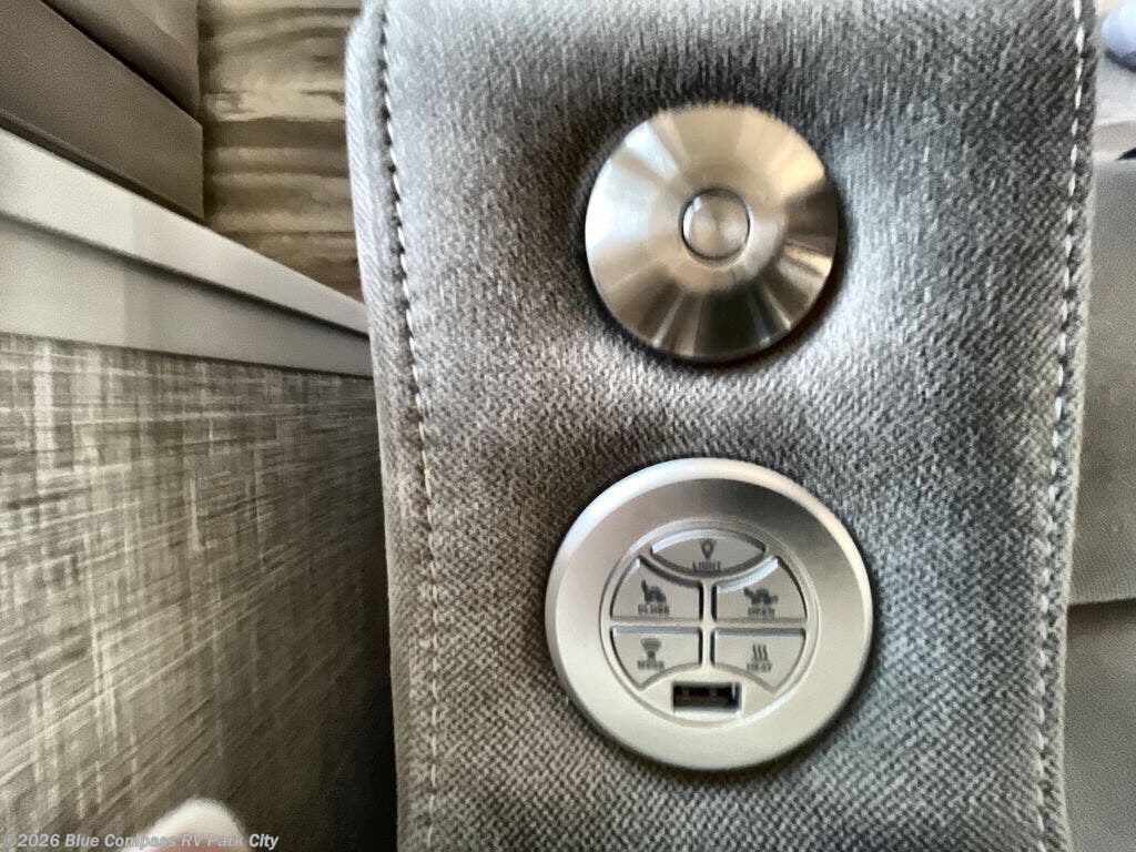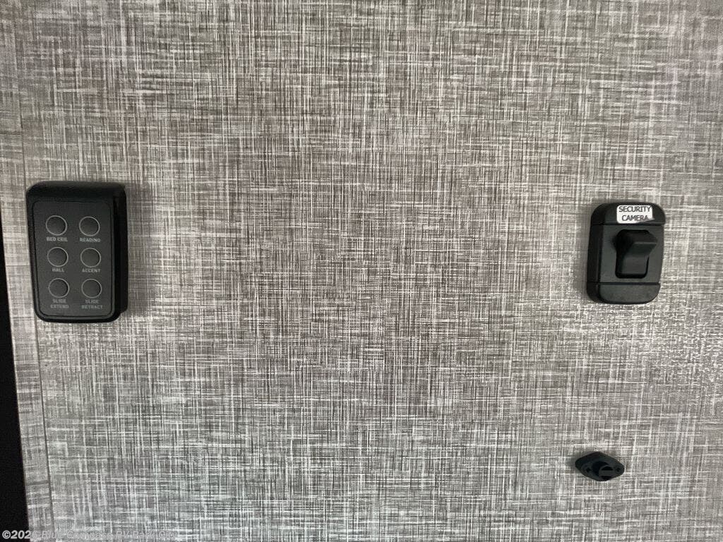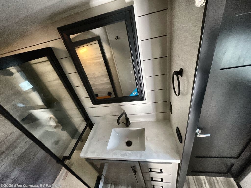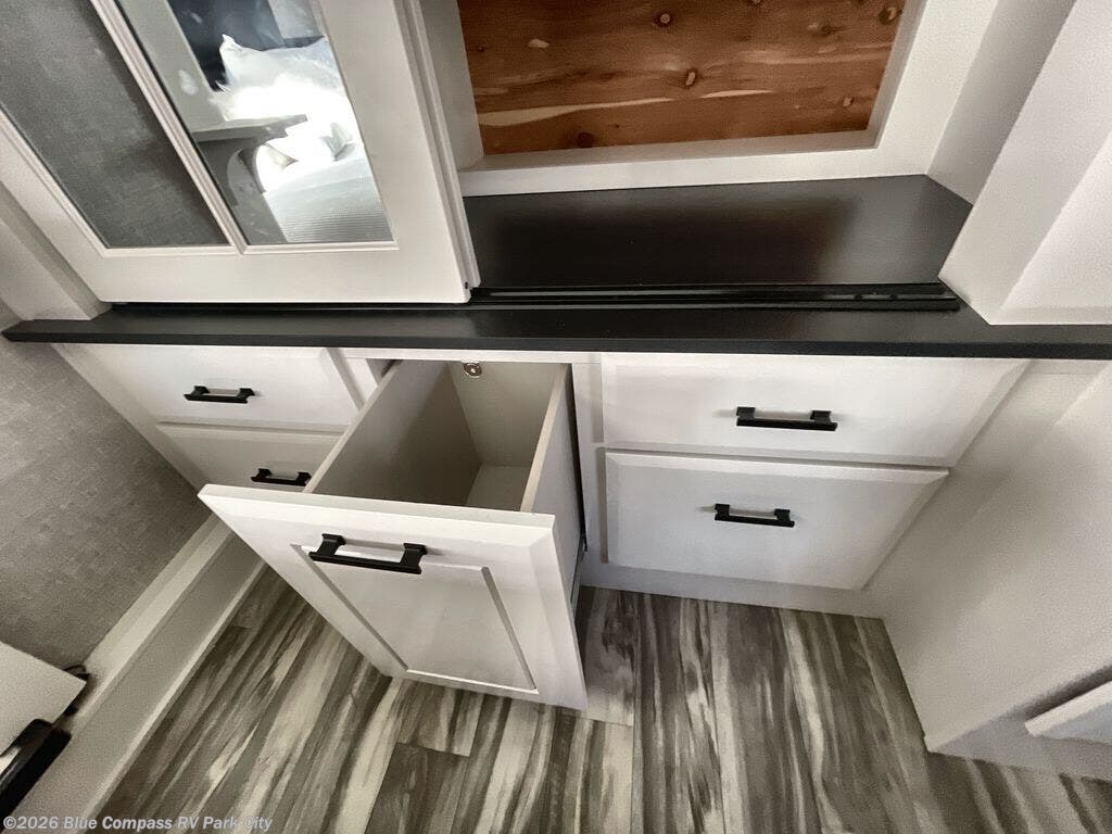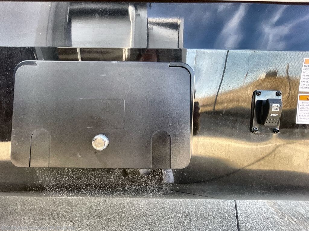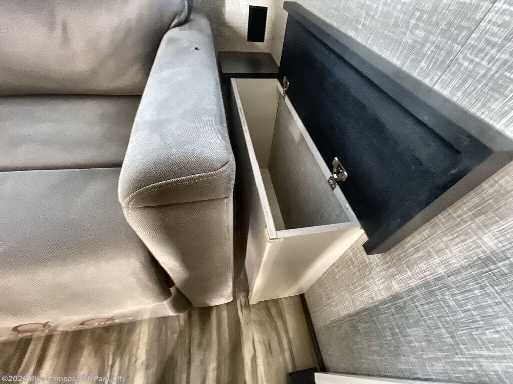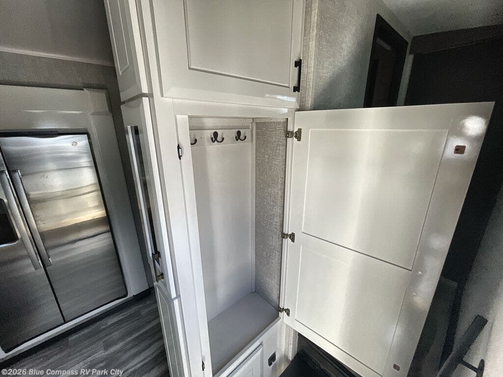 Your search is over now with this perfect luxury fifth wheel for your crew of four. Once you get settled at the campground, take a load off on the theater seat sacross from the TV lift and fireplace. There is also a free-standing table here and a tri-fold sofa that will double as additional seating and sleeping space. The kitchen island includes a pull-out cutting board extension for tons of prep space and even a dishwasher for easy clean up, and a residential range to use for cooking as well as a convection microwave oven with built-in air fryer. Head to the full bath that includes a walk-in shower with a seat, an LED backlit custom framed mirror, plus residential bath backsplash for added luxury. You're gong to love the front private bedroom with its king bed slide out, 32" TV, plus a large front closet complete with a hamper and drawers, and an area that features washer/dryer prep in case you wish to add that convenience as well.