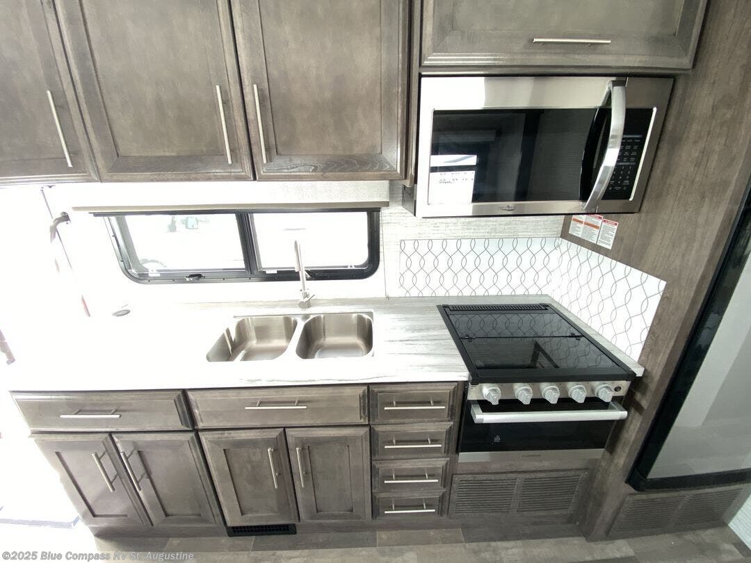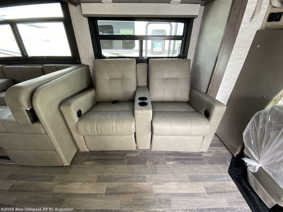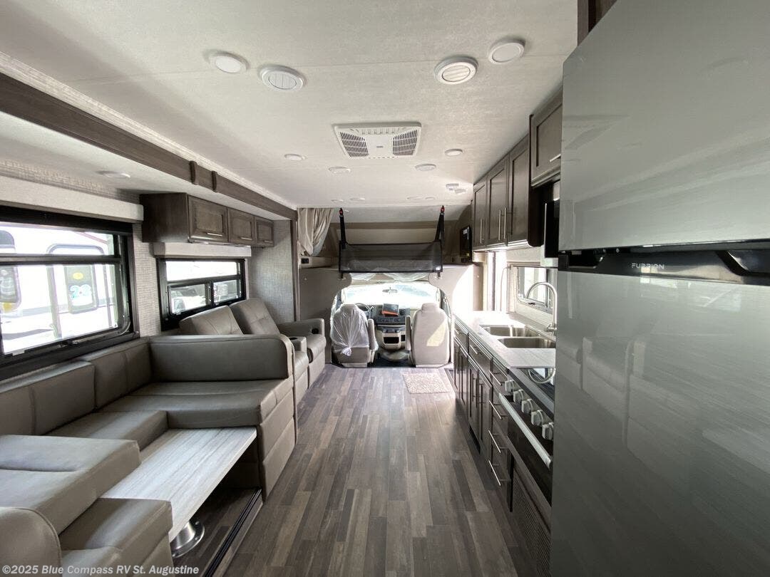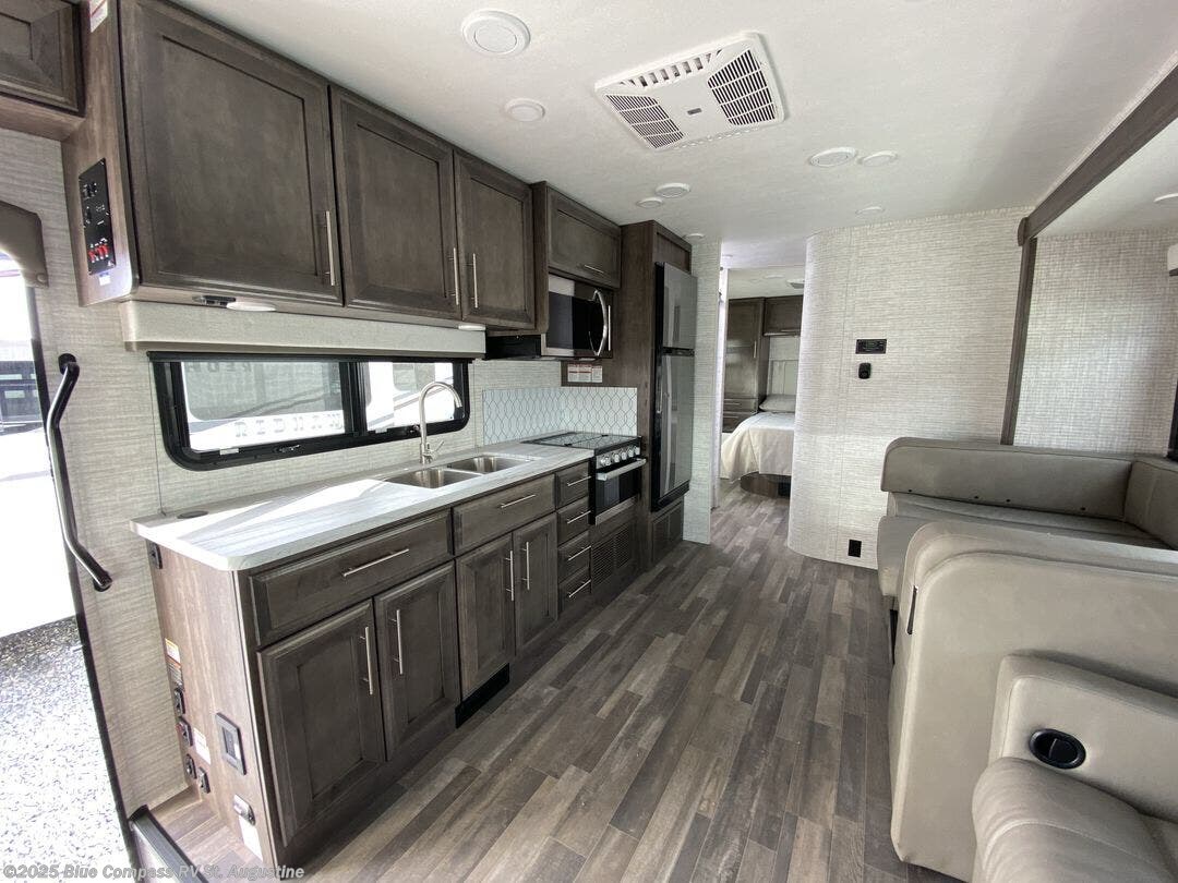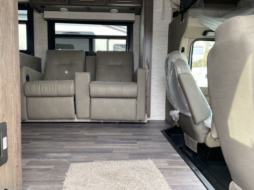 Explore new places as you travel in this coach with the comforts of home and the conveniences you are accustom to. In the rear bedroom, you will appreciate privacy when you close the divider to enjoy the walk-around queen bed with storage for your clothes. There is a private toilet and sink with the shower right across the hall so two people can freshen up at once. The chef will love the galley kitchen which is spacious thanks to the furniture slide out. The Furrion all-in-one cooktop along with the residential-size microwave, plus the 10 cu. ft. refrigerator will give the cook everything for warm meals for two or more. The driver and passenger seats swivel to become a part of the living area seating, and the cab-over bunk her will be a big plus for the little ones. You can also choose the optional theater seating in place of the sofa if you're not needing the additional sleeping space.