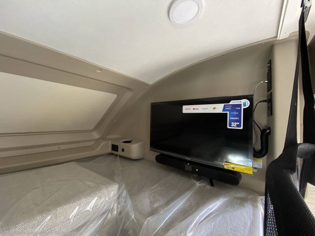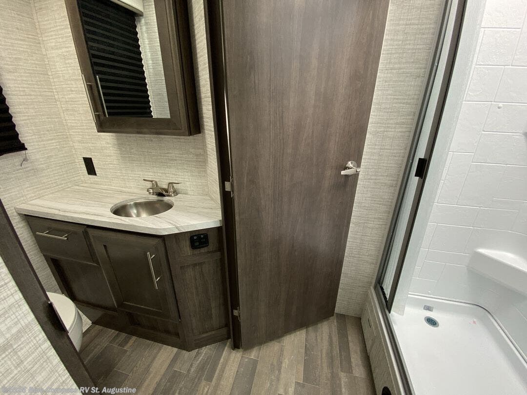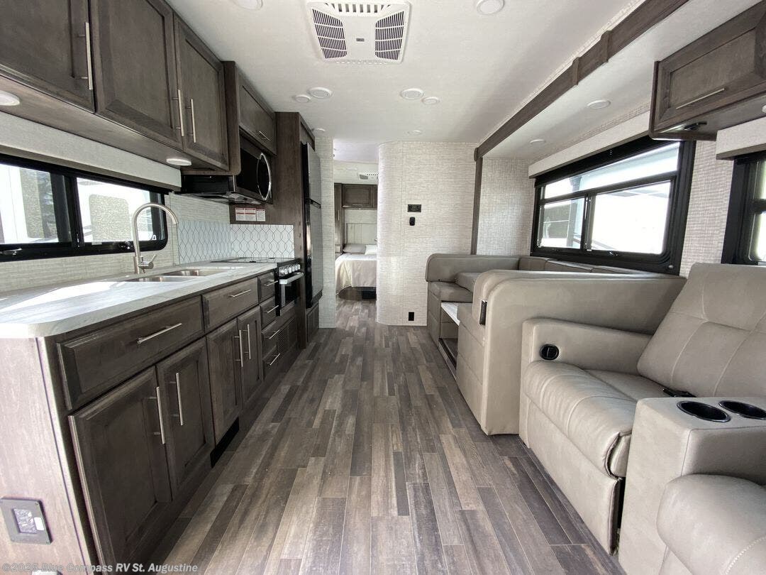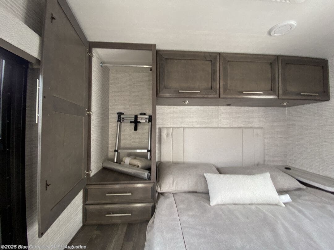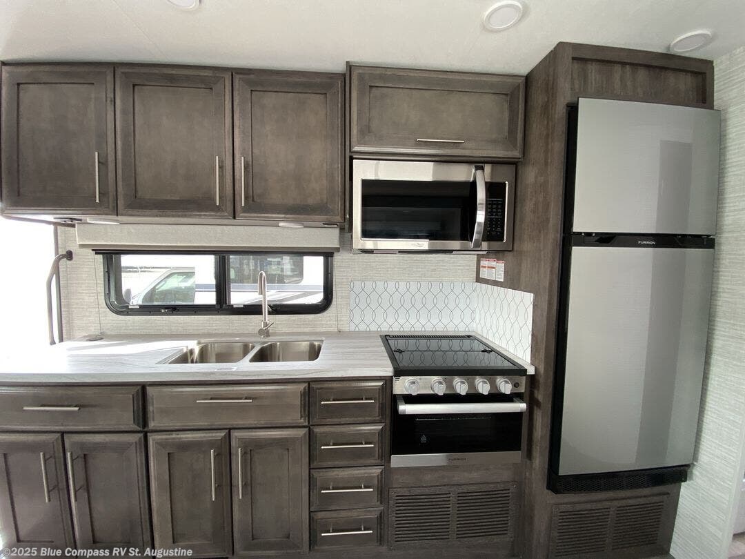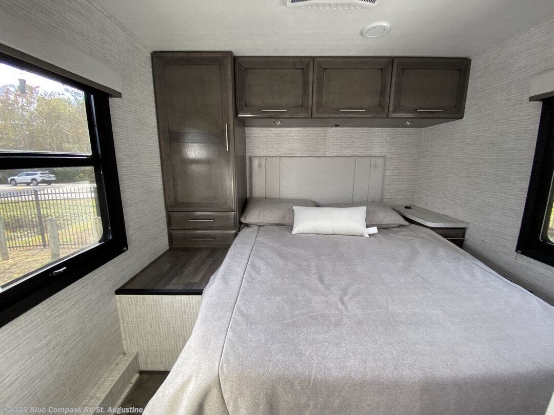 Explore new places as you travel in this coach with the comforts of home and the conveniences you are accustom to. In the rear bedroom, you will appreciate privacy when you close the divider to enjoy the walk-around queen bed with storage for your clothes. There is a private toilet and sink with the shower right across the hall so two people can freshen up at once. The chef will love the galley kitchen which is spacious thanks to the furniture slide out. The Furrion all-in-one cooktop along with the residential-size microwave, plus the 10 cu. ft. refrigerator will give the cook everything for warm meals for two or more. The driver and passenger seats swivel to become a part of the living area seating, and the cab-over bunk her will be a big plus for the little ones. You can also choose the optional theater seating in place of the sofa if you're not needing the additional sleeping space.
