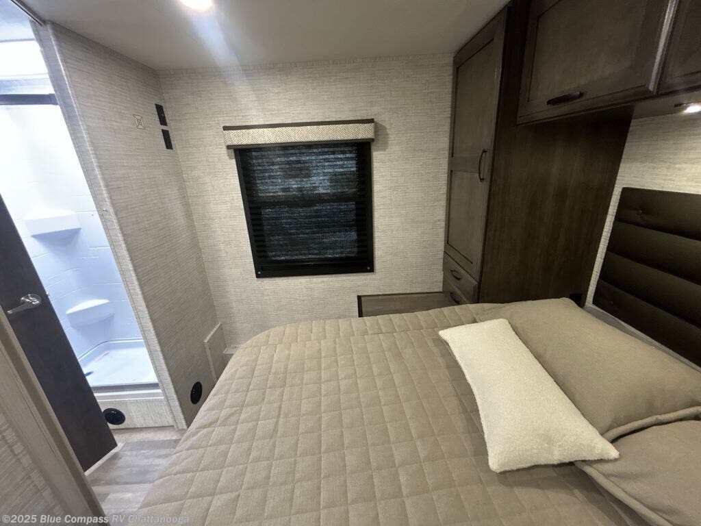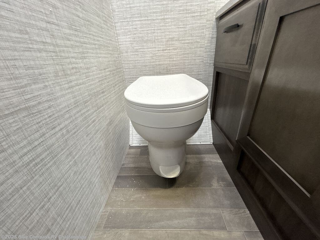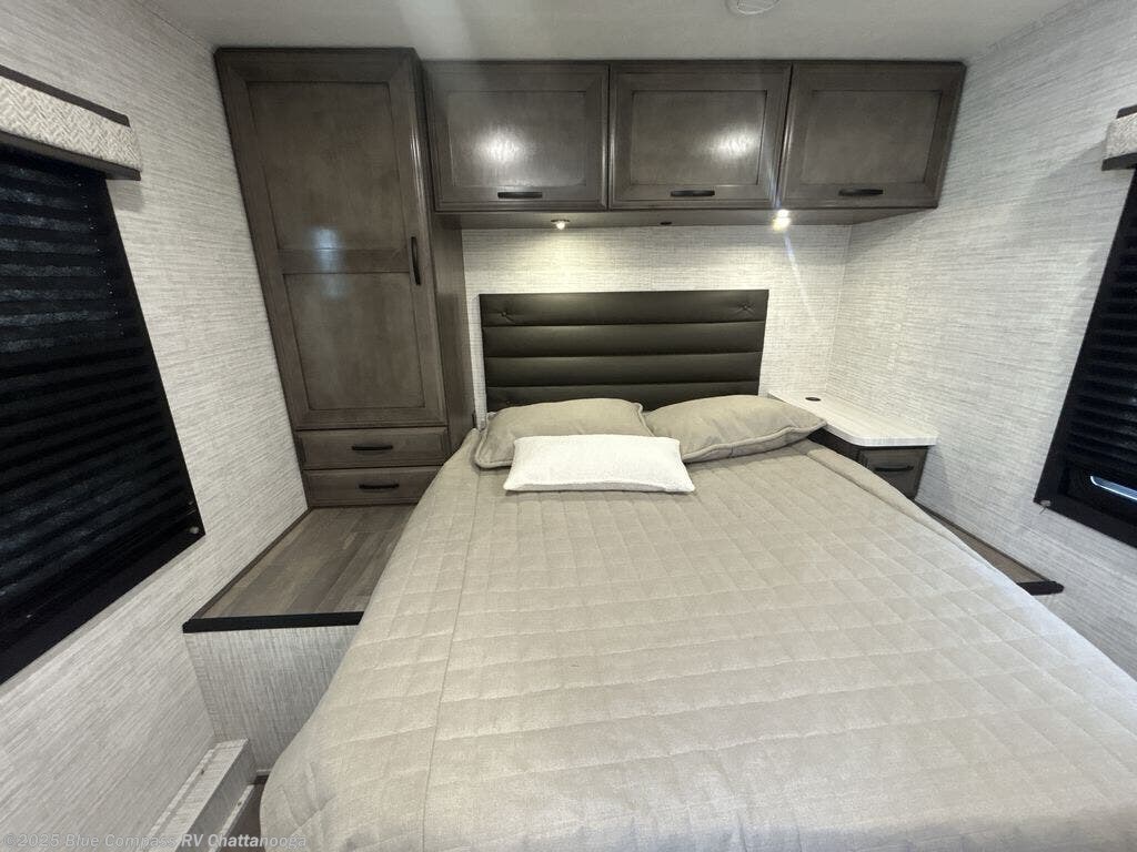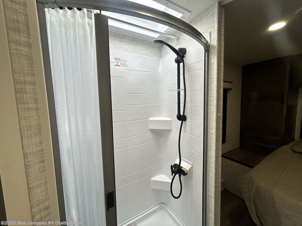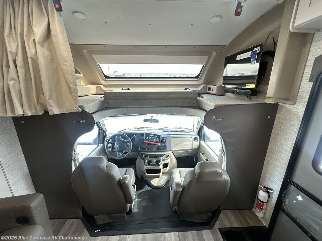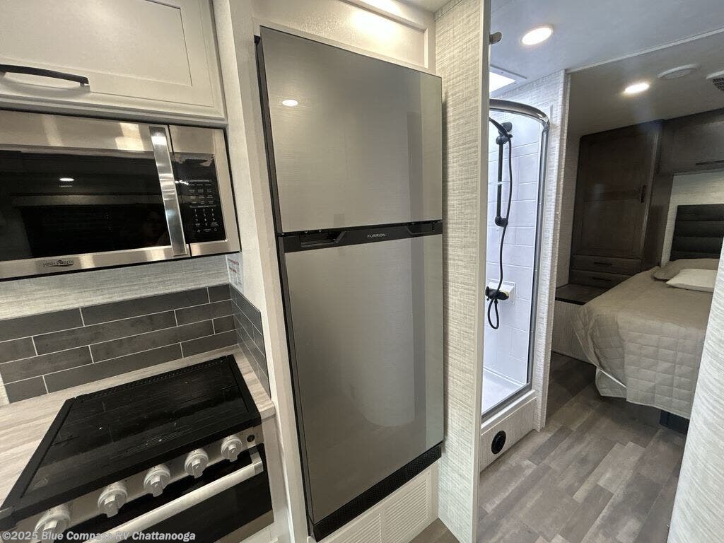 Explore new places as you travel in this coach with the comforts of home and the conveniences you are accustom to. In the rear bedroom, you will appreciate privacy when you close the divider to enjoy the walk-around queen bed with storage for your clothes. There is a private toilet and sink with the shower right across the hall so two people can freshen up at once. The chef will love the galley kitchen which is spacious thanks to the furniture slide out. The Furrion all-in-one cooktop along with the residential-size microwave, plus the 10 cu. ft. refrigerator will give the cook everything for warm meals for two or more. The driver and passenger seats swivel to become a part of the living area seating, and the cab-over bunk her will be a big plus for the little ones. You can also choose the optional theater seating in place of the sofa if you're not needing the additional sleeping space.