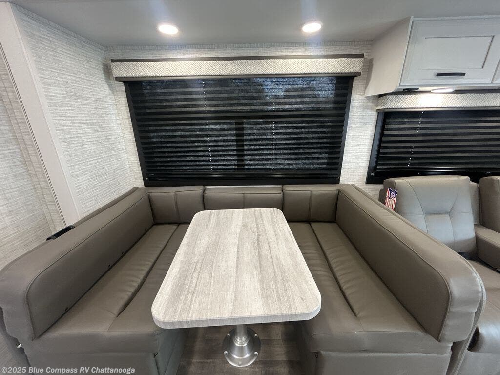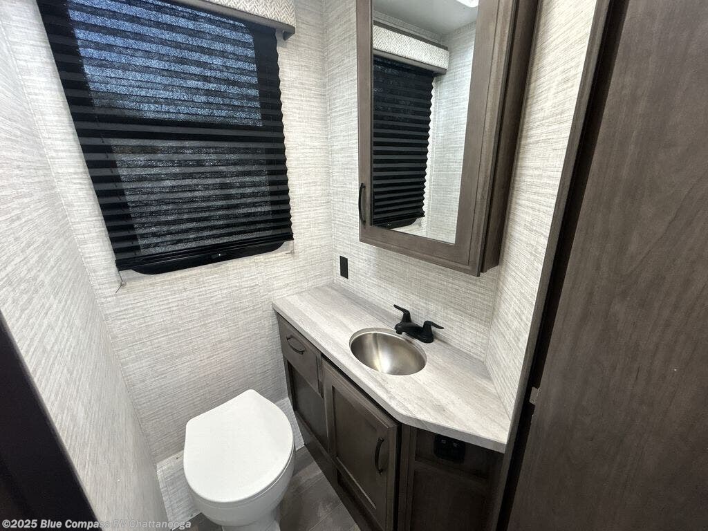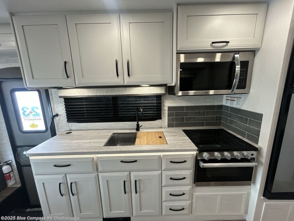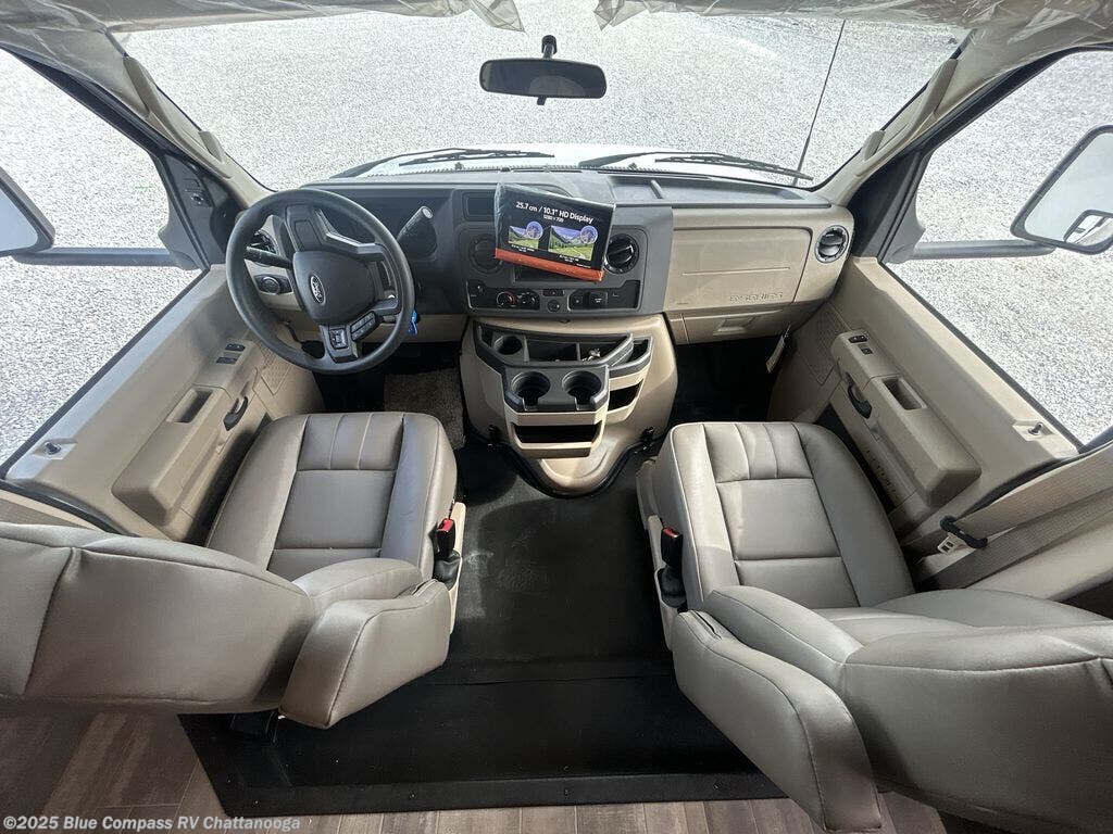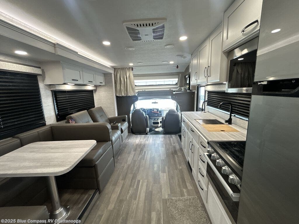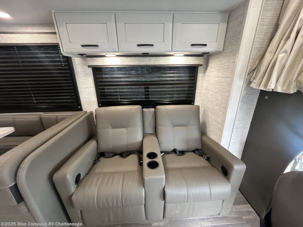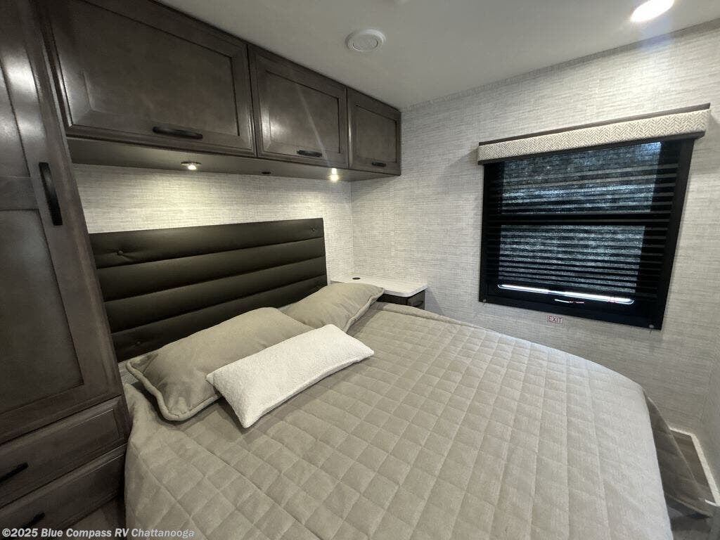 Explore new places as you travel in this coach with the comforts of home and the conveniences you are accustom to. In the rear bedroom, you will appreciate privacy when you close the divider to enjoy the walk-around queen bed with storage for your clothes. There is a private toilet and sink with the shower right across the hall so two people can freshen up at once. The chef will love the galley kitchen which is spacious thanks to the furniture slide out. The Furrion all-in-one cooktop along with the residential-size microwave, plus the 10 cu. ft. refrigerator will give the cook everything for warm meals for two or more. The driver and passenger seats swivel to become a part of the living area seating, and the cab-over bunk her will be a big plus for the little ones. You can also choose the optional theater seating in place of the sofa if you're not needing the additional sleeping space.