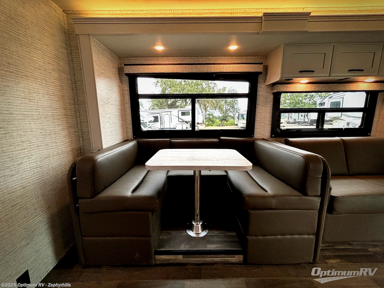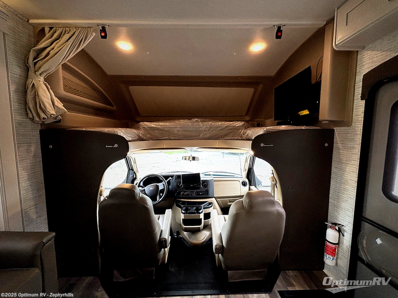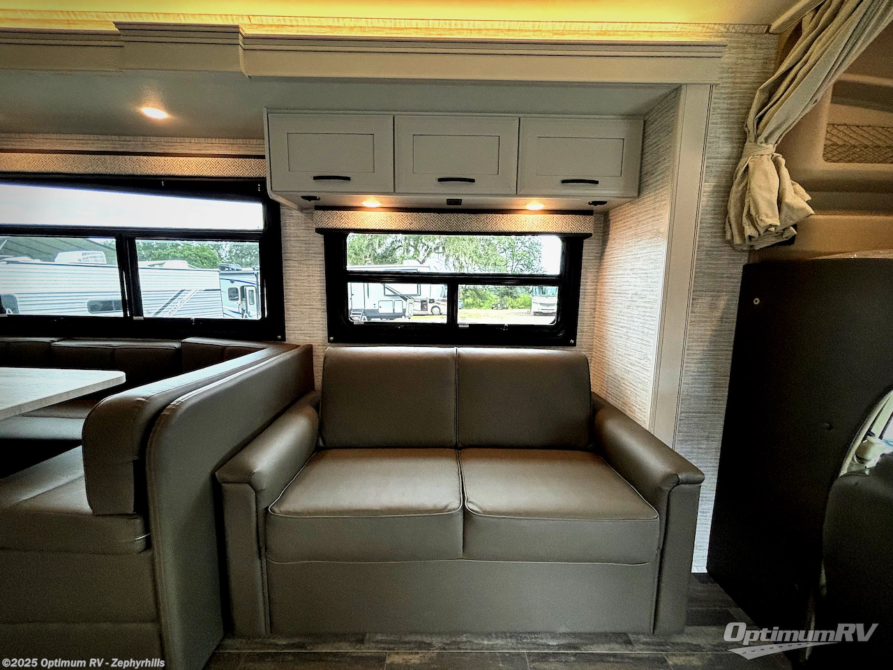 Explore new places as you travel in this coach with the comforts of home and the conveniences you are accustom to. In the rear bedroom, you will appreciate privacy when you close the divider to enjoy the walk-around queen bed with storage for your clothes. There is a private toilet and sink with the shower right across the hall so two people can freshen up at once. The chef will love the galley kitchen which is spacious thanks to the furniture slide out. The Furrion all-in-one cooktop along with the residential-size microwave, plus the 10 cu. ft. refrigerator will give the cook everything for warm meals for two or more. The driver and passenger seats swivel to become a part of the living area seating, and the cab-over bunk her will be a big plus for the little ones. You can also choose the optional theater seating in place of the sofa if you're not needing the additional sleeping space.