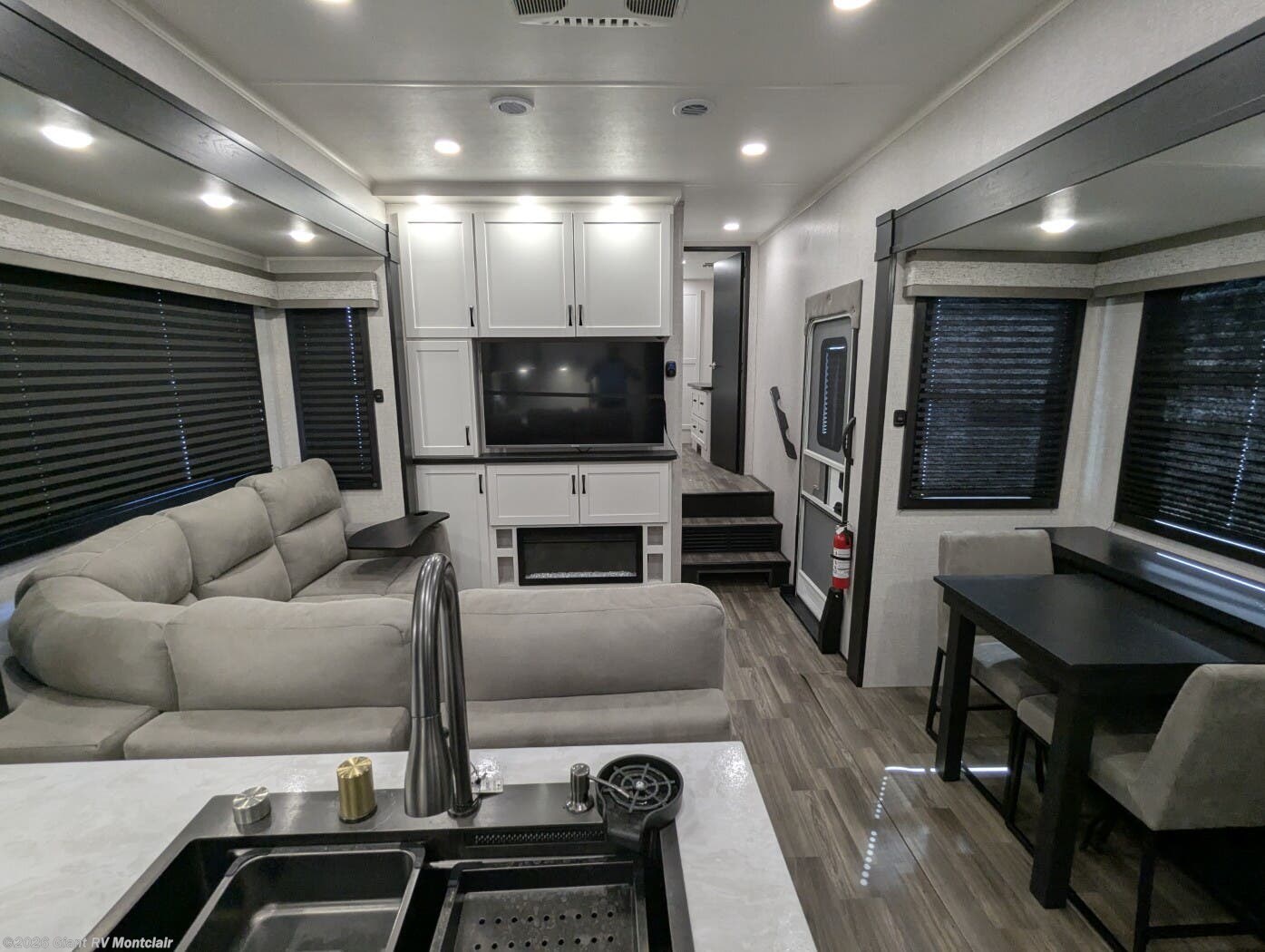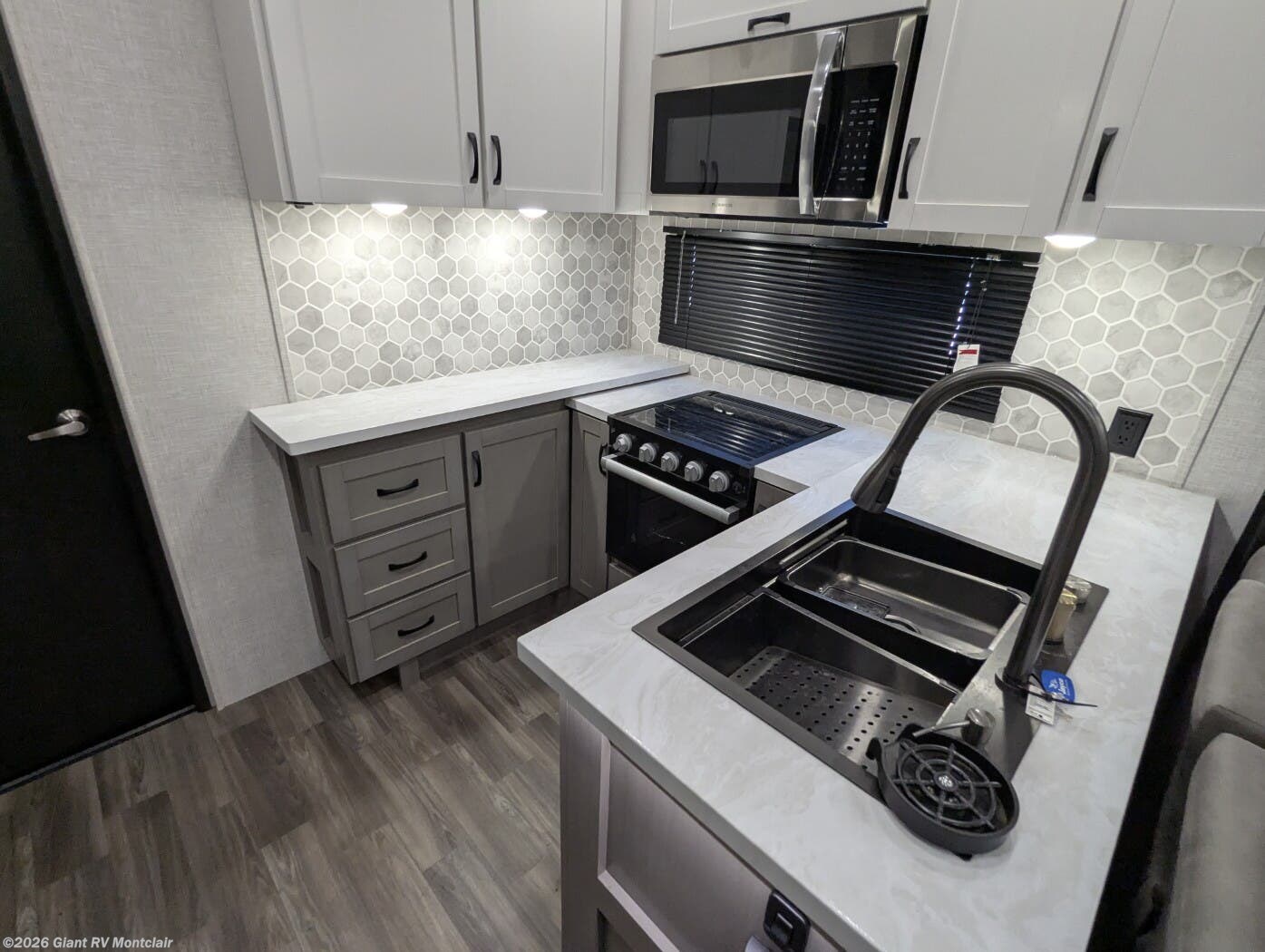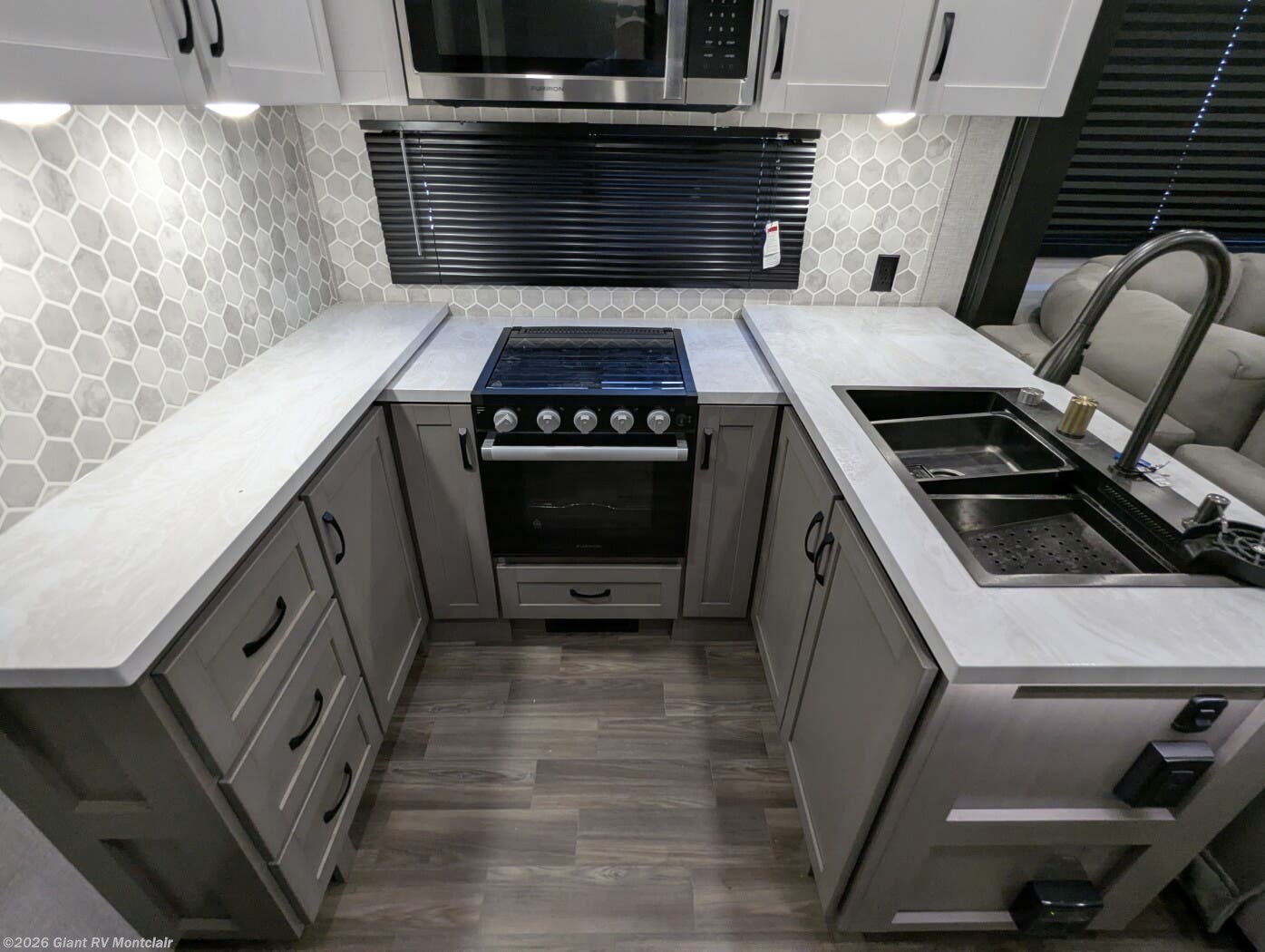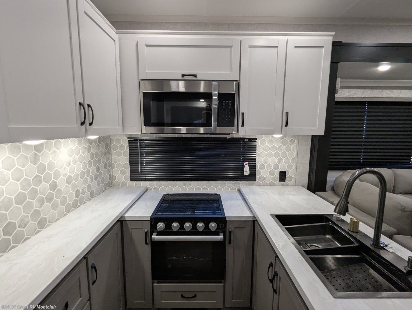 - Modern Kitchen: Features a 16 cu. ft. 12V refrigerator, 21" oven, 30" microwave, and residential sink for gourmet meals.