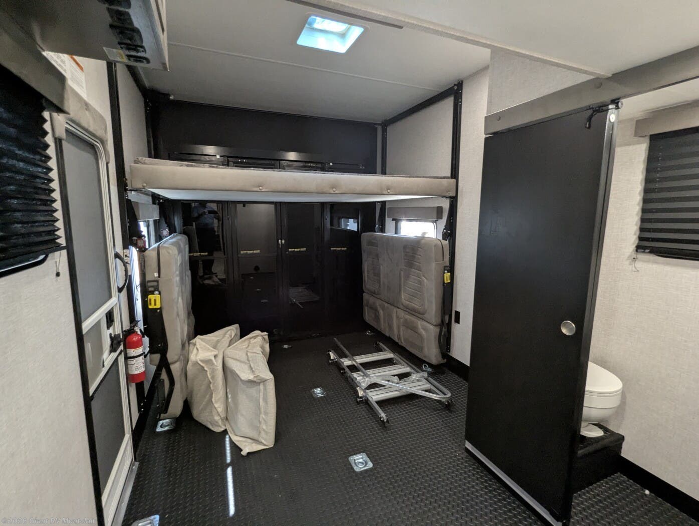 - Spacious Garage: 13'6" toy hauler with a party deck, convertible sofas, queen bed, and half bath for versatile use.