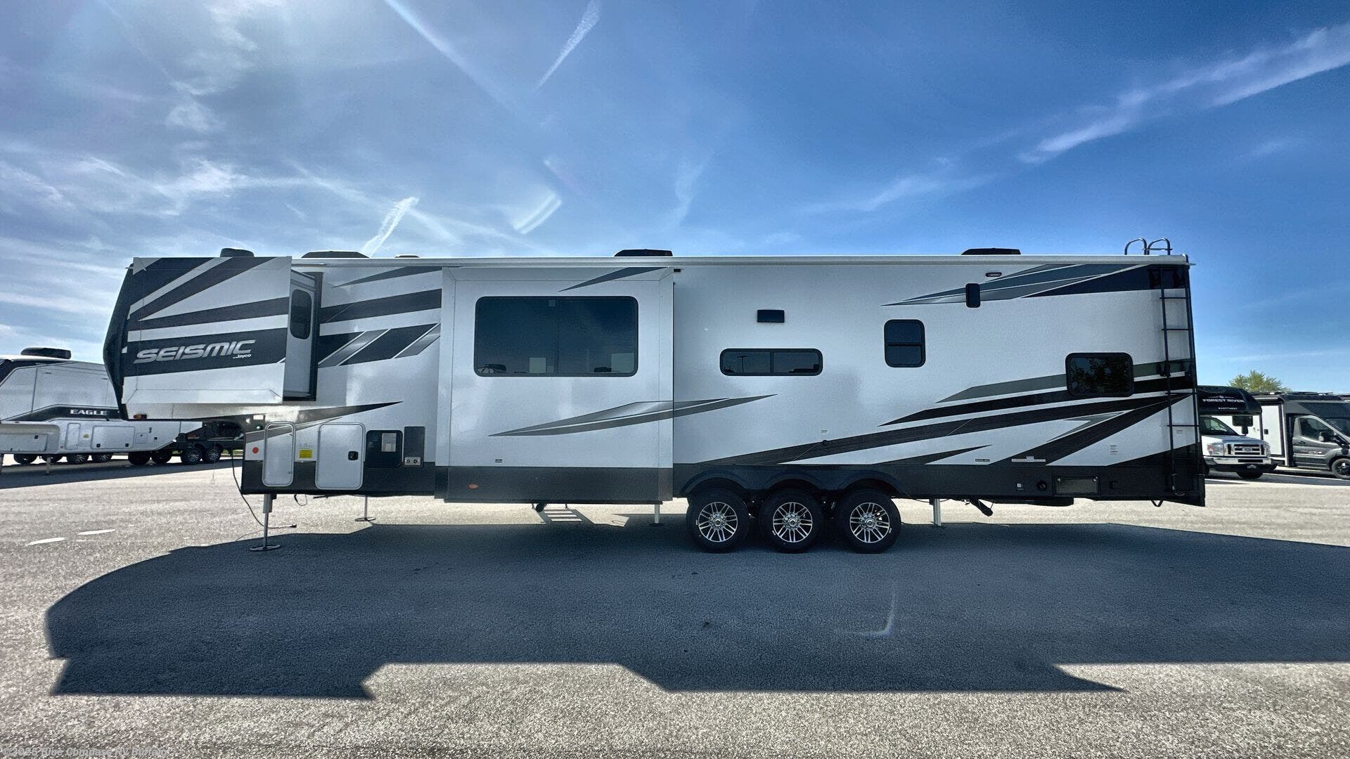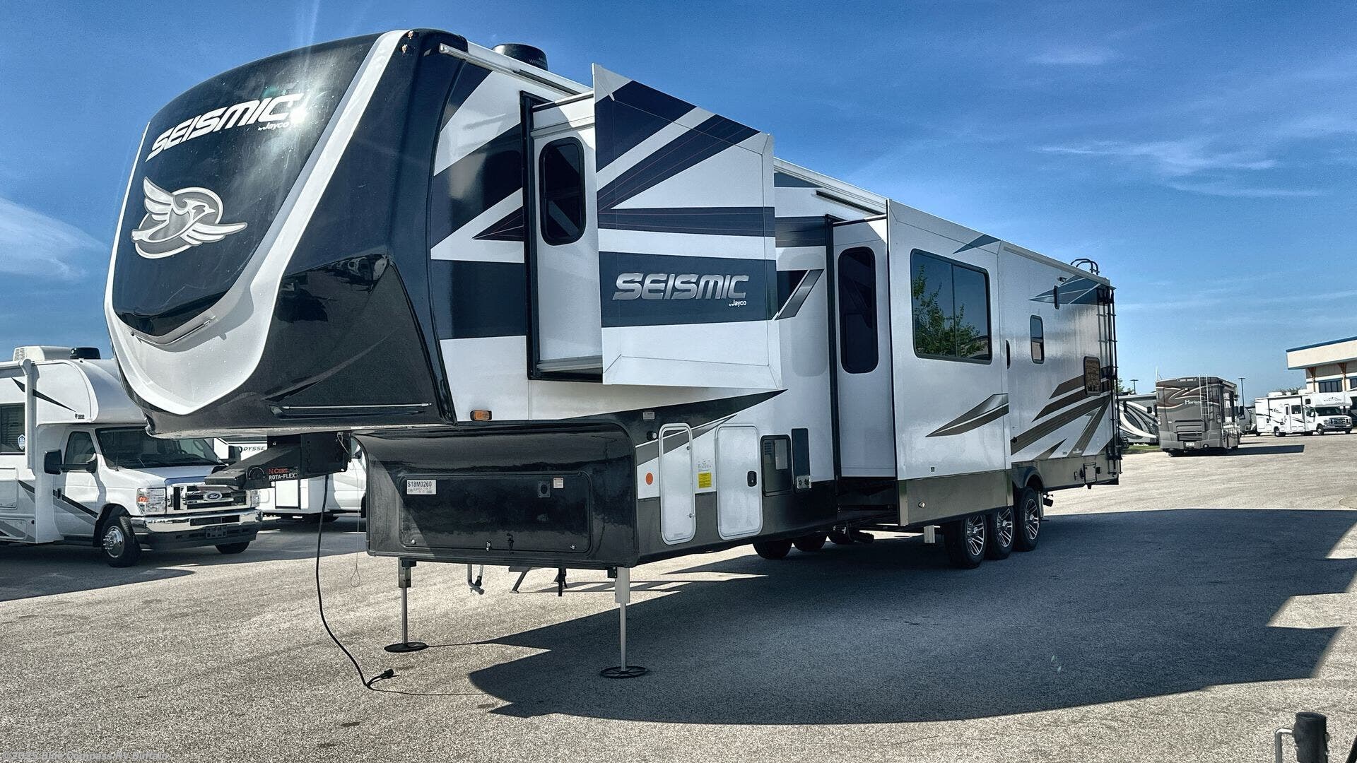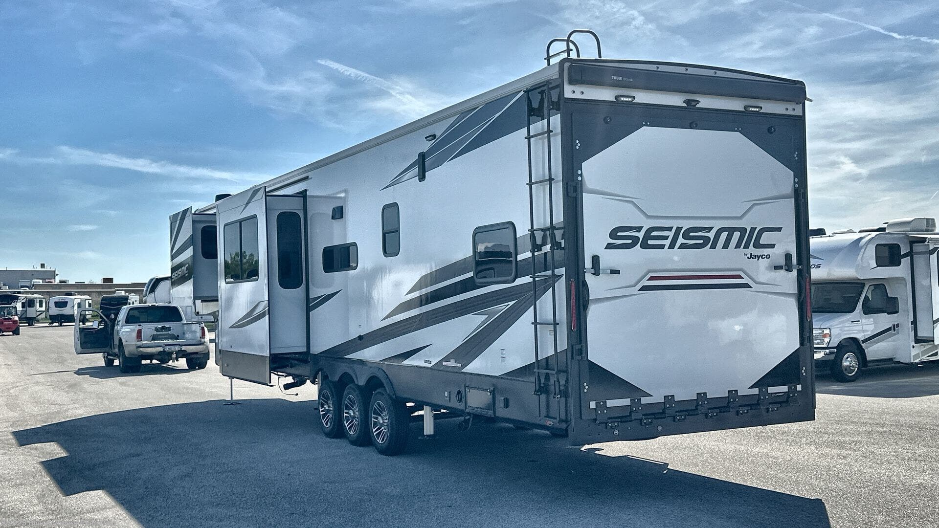 One look at the Seismic toy haulers by Jayco, and you'll never go back! Each model features a custom automotive-grade vinyl exterior graphics package, a painted fiberglass front cap with built-in LED lighting, and 102" wide-body structural steel I-beam construction. You'll find the pass-through storage with Slam-Latch baggage doors will make unpacking easier than ever, and the rear ramp door/patio with anti-slip, non-skid flooring will allow you to unload your toys with no trouble at all. These toy haulers feature a three seasons garage wall/doors, a 30 gallon fuel tank with a timer, and exterior marine-grade speakers to keep the party going. The Climate Shield zero degree tested weather protection includes a 35,000 BTU furnace, PEX plumbing, and a fully enclosed and heated underbelly so you can enjoy your adventures year around. And we haven't even touched on the interior luxuries you'll find, like solid hardwood cabinet doors, residential vinyl flooring made in the USA, night shades, and more!