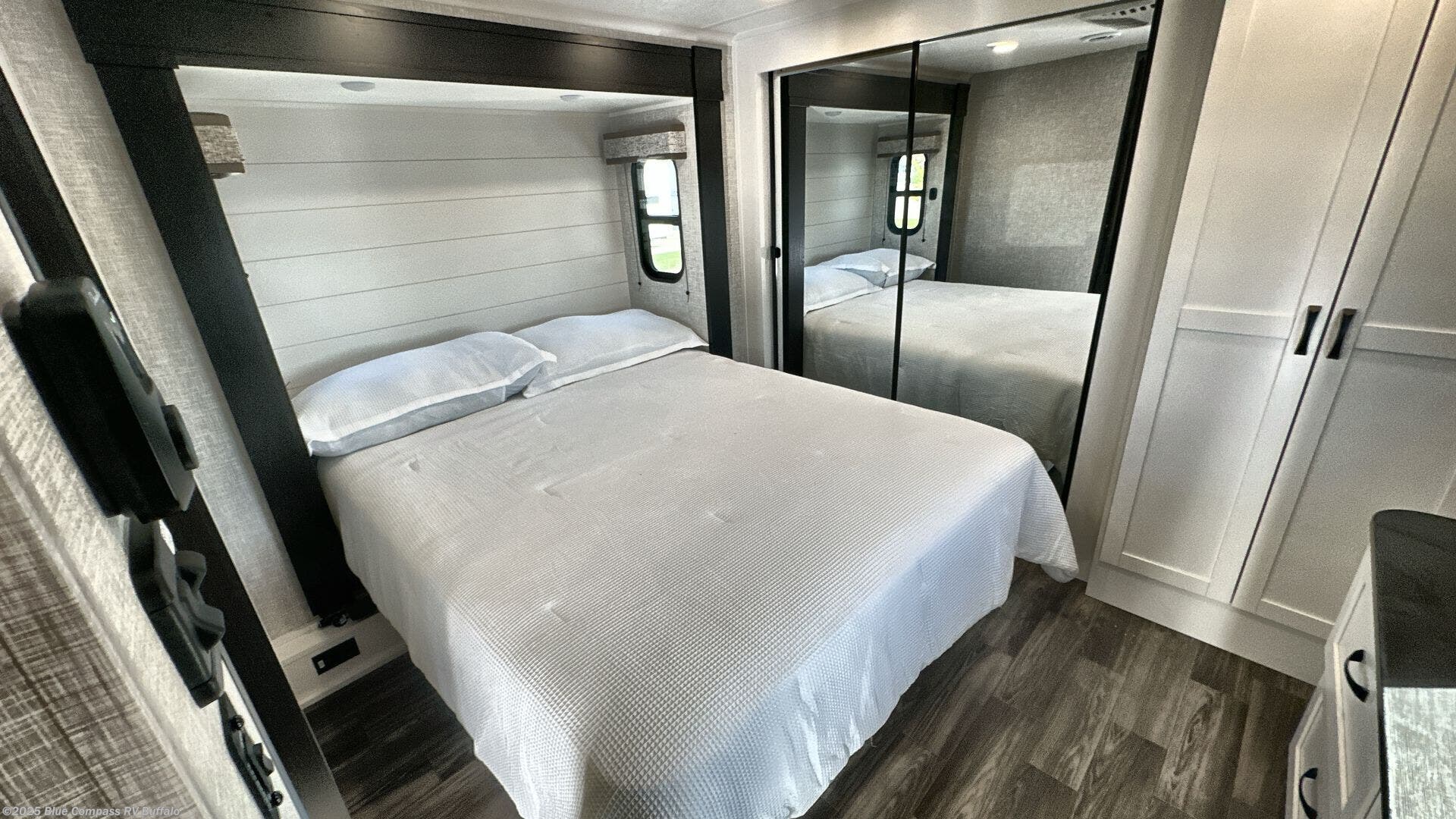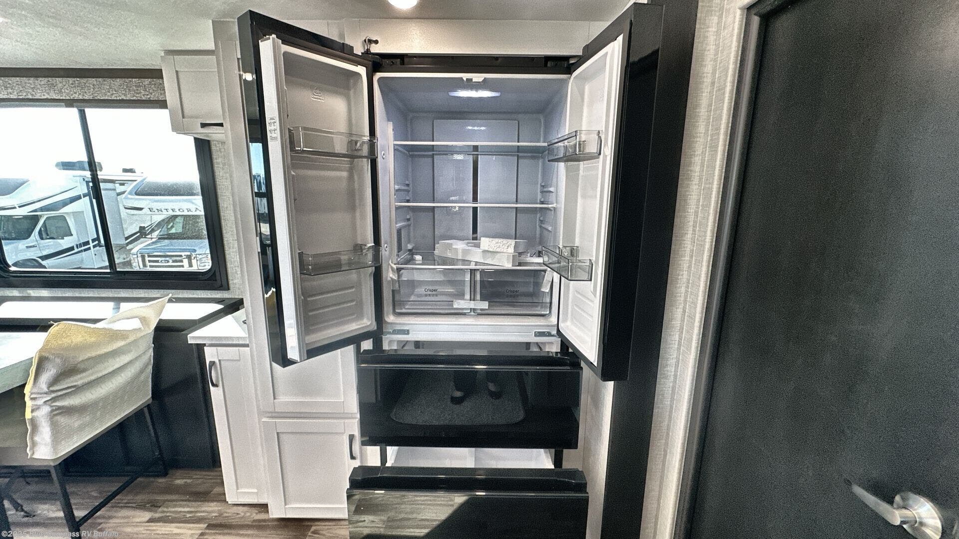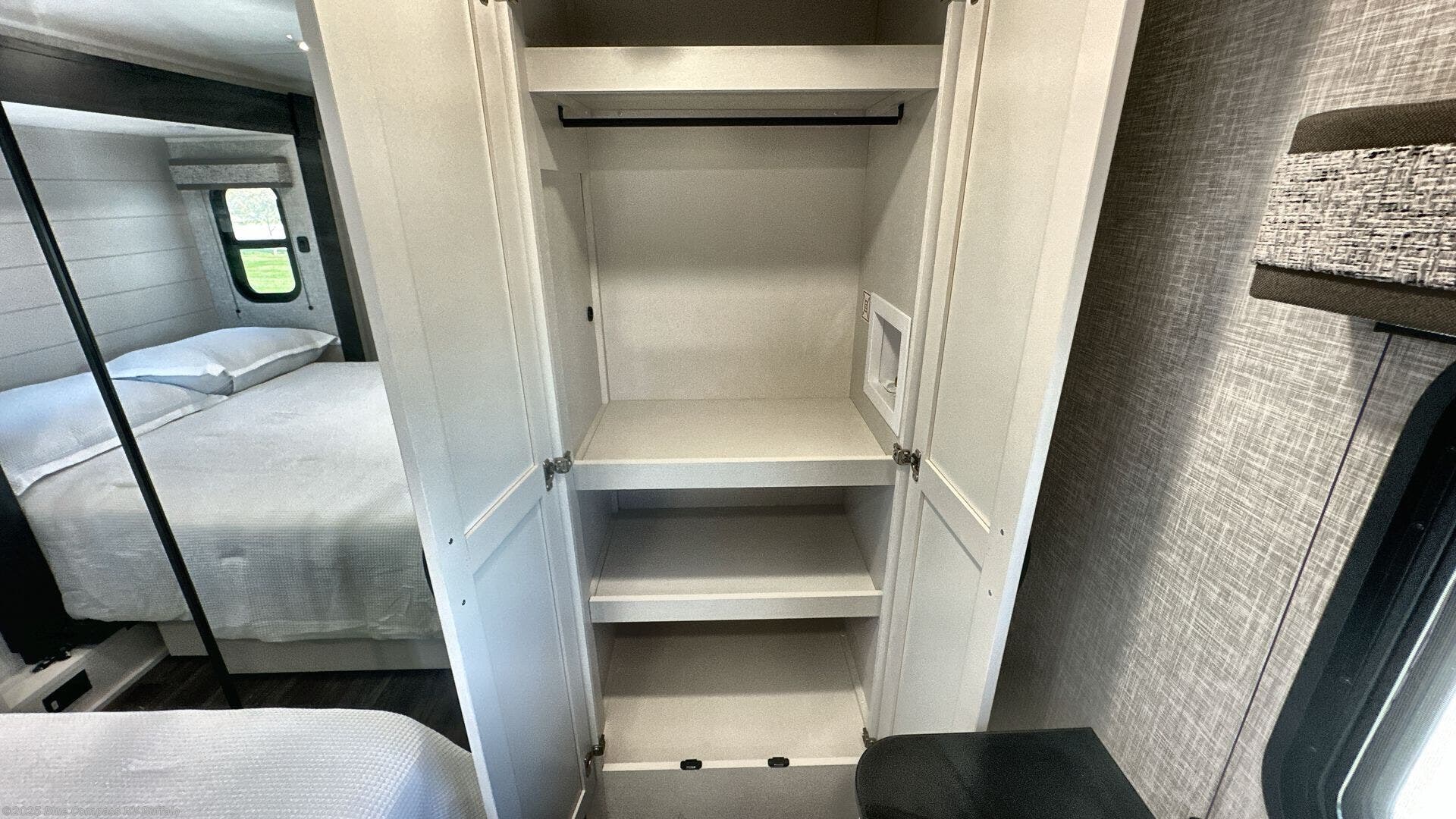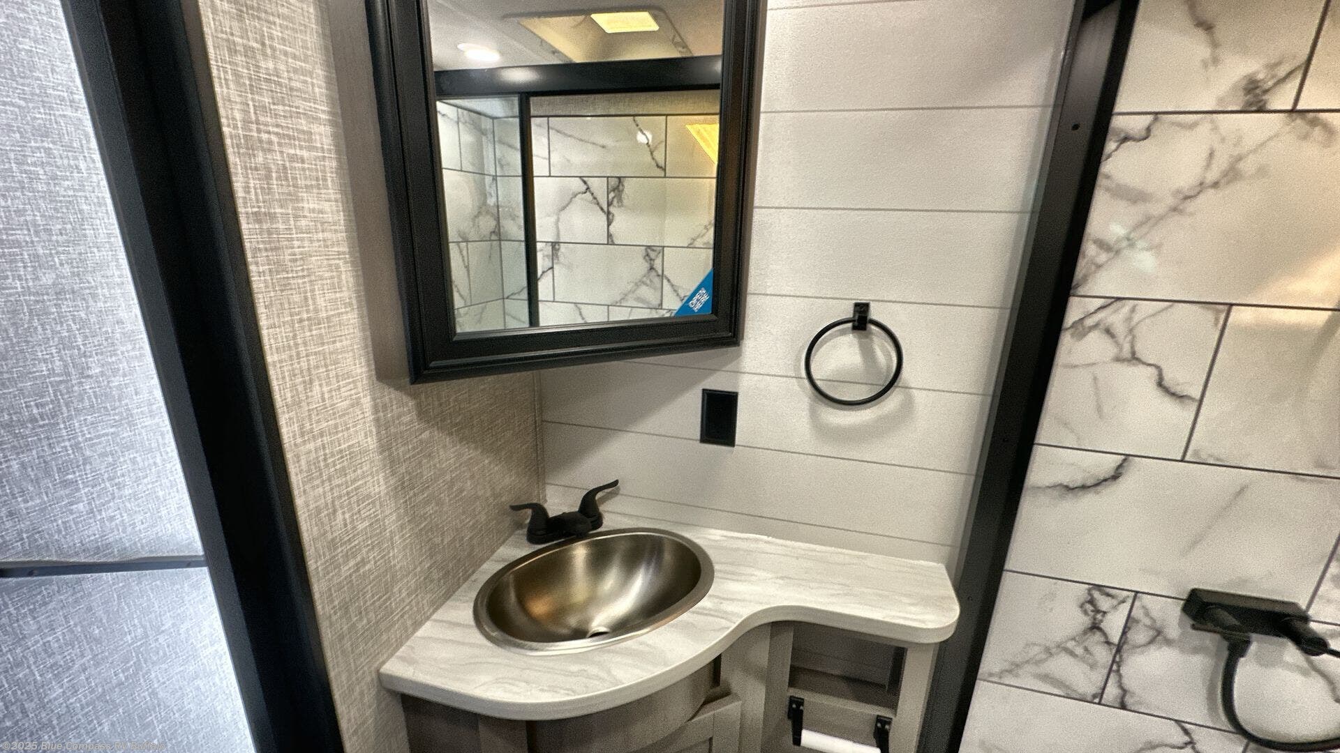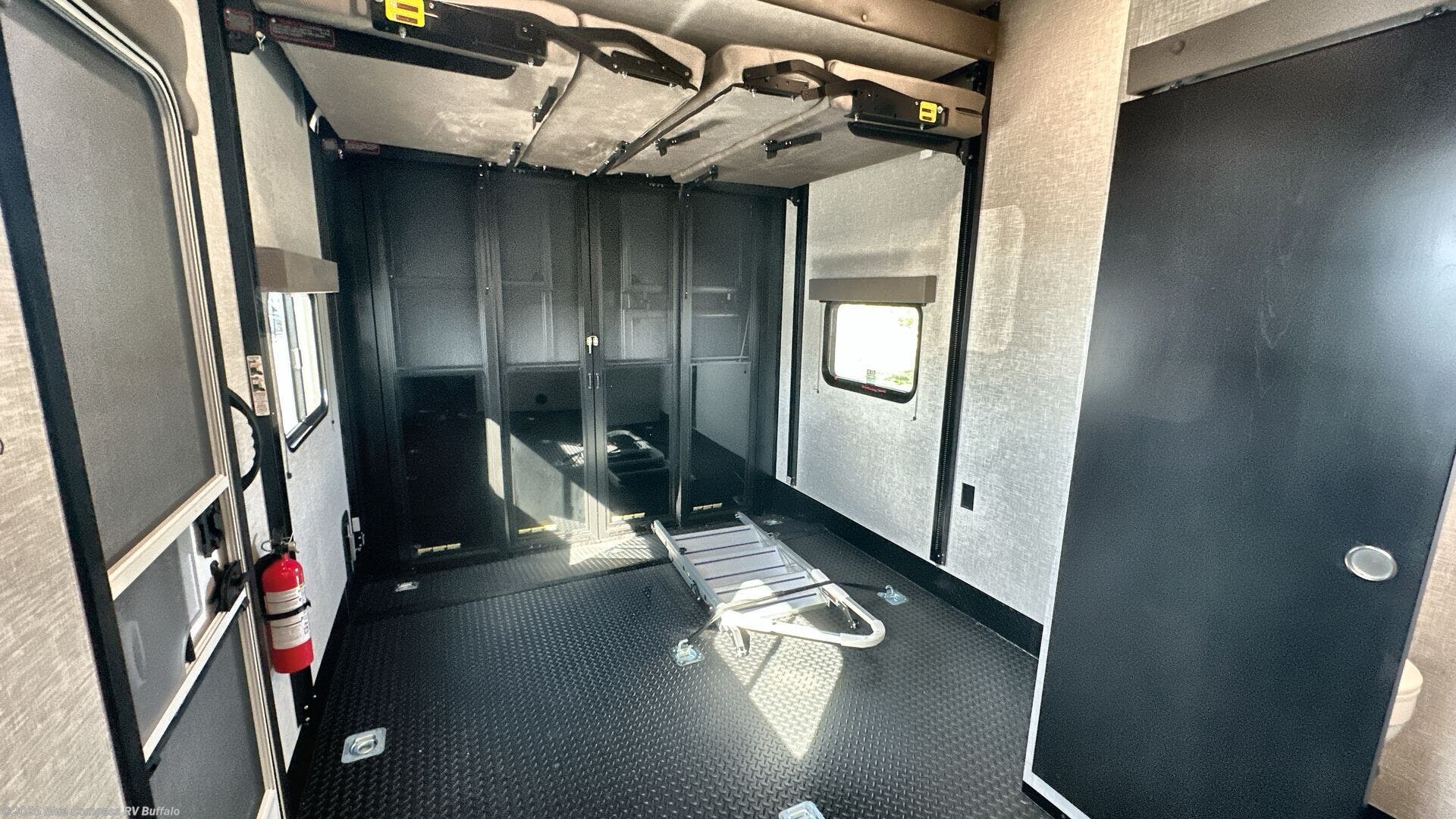 Get ready for outdoor adventures in this spacious toy hauler. Your guests will have the 13' 6" garage with queen bed with convertible sofa and a loft for added sleeping space, plus there is overhead storage for your things and a side man door to come and go easily. The main living area includes dual opposing slides with an L-shaped tri-fold sofa along the roadside and your dinette and refrigerator plus pantry in the curbside slide. Head up the steps to your front private bedroom with the dual entry bath accessible from the hall and inside the master bedroom. Here you will all enjoy a walk-in shower, toilet, and vanity with a sink, plus overhead storage. The bedroom features a third slide out housing a queen bed for added floor space, plus a full front walk-in closet, a dresser, and washer/dryer prep!