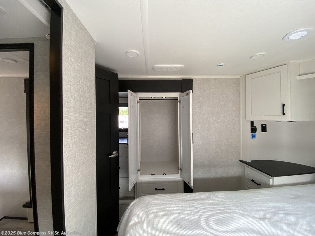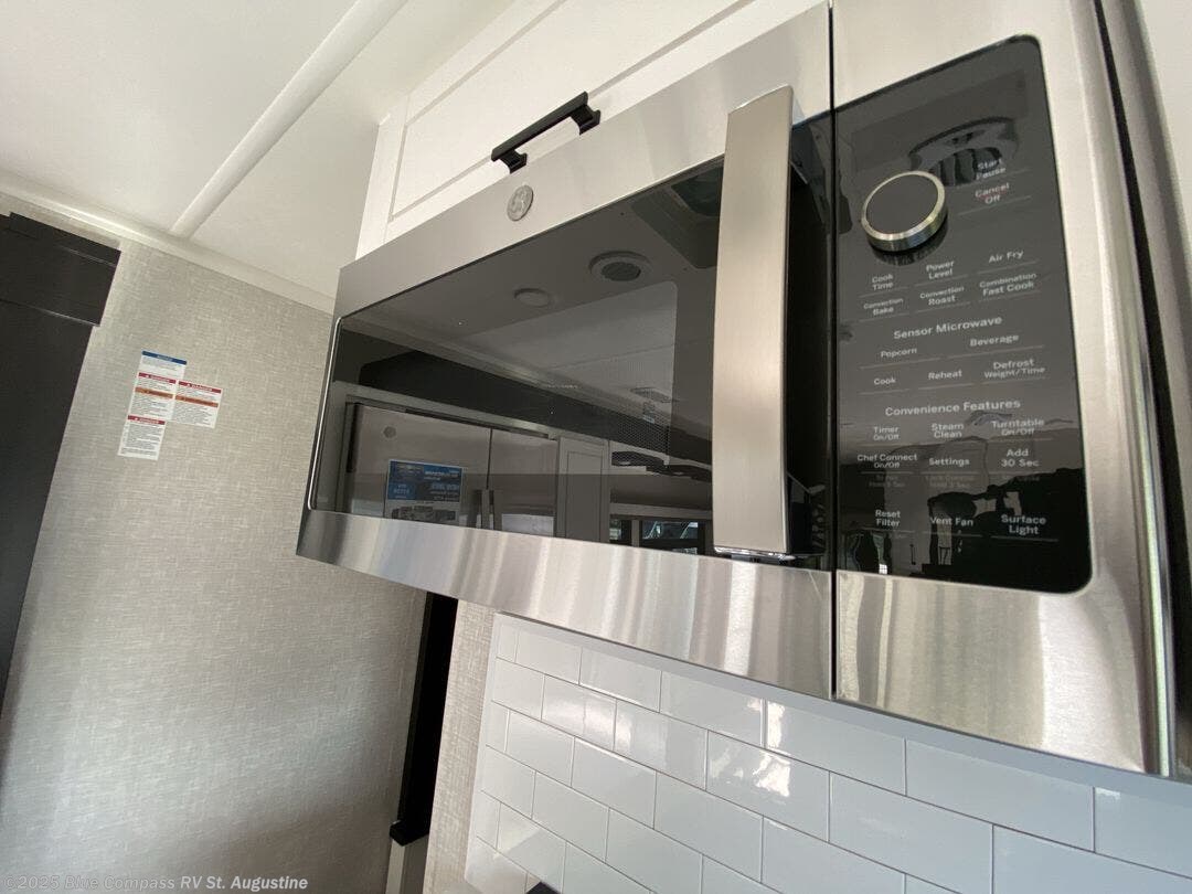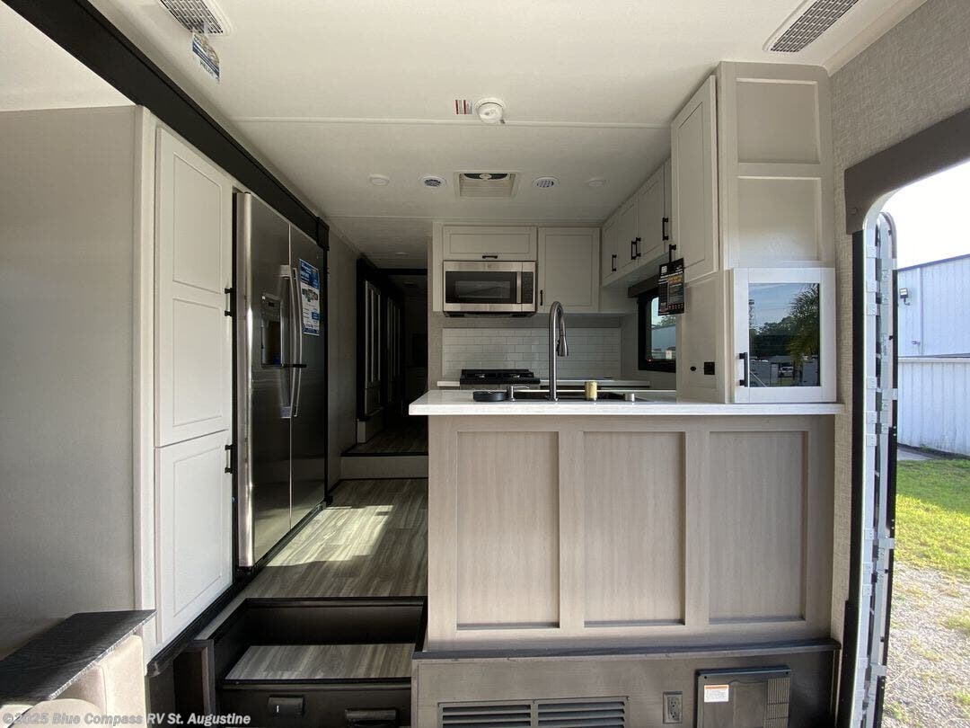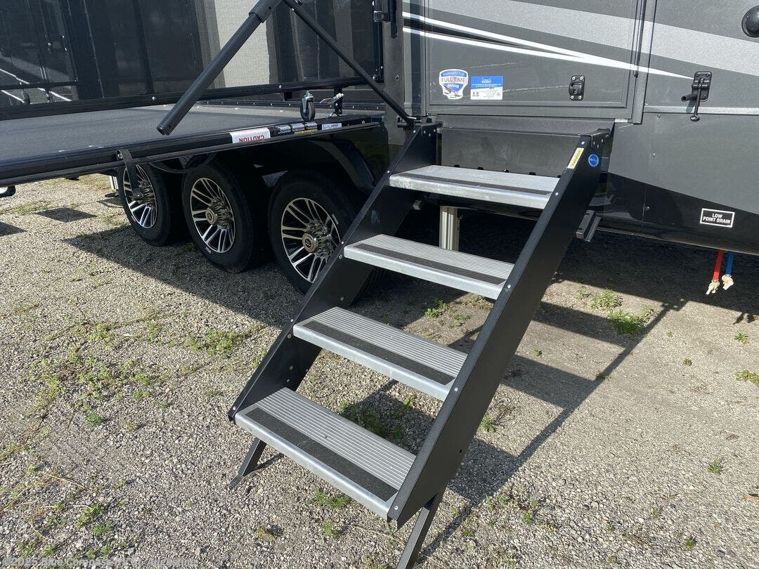 It's time to enjoy your toys and outdoor fun in this toy hauler! This separate garage offers an electric queen bed above rear convertible sofas, a second entry door, a half bath plus washer and dryer prep if you choose to add those appliances. Your friends can have their own space when they join you. And the party deck will be a popular hangout everywhere you go! The separate living and kitchen area offers patio doors to get to the side patio party deck with an exterior TV so you can relax above ground while outdoors. Back inside you will have a SuperSofa with heat, massage, recliners, cupholders and LED lighting to enjoy while watching the Smart LED HDTV with a fireplace below. The chef will have a U-shaped countertop with all the kitchen amenities such as a GE Profile Series 30 in. residential convection microwave with built in air fryer, and the 17 cu.ft. 12V refrigerator is just a few steps away. Everyone can take turns getting cleaned up in the inventive side-aisle bath with a walk-in shower. The front master bedroom has a walk-around king bed for all-around comfort, plus a slide out with a dresser and two wardrobes that stretches into the hallway.
