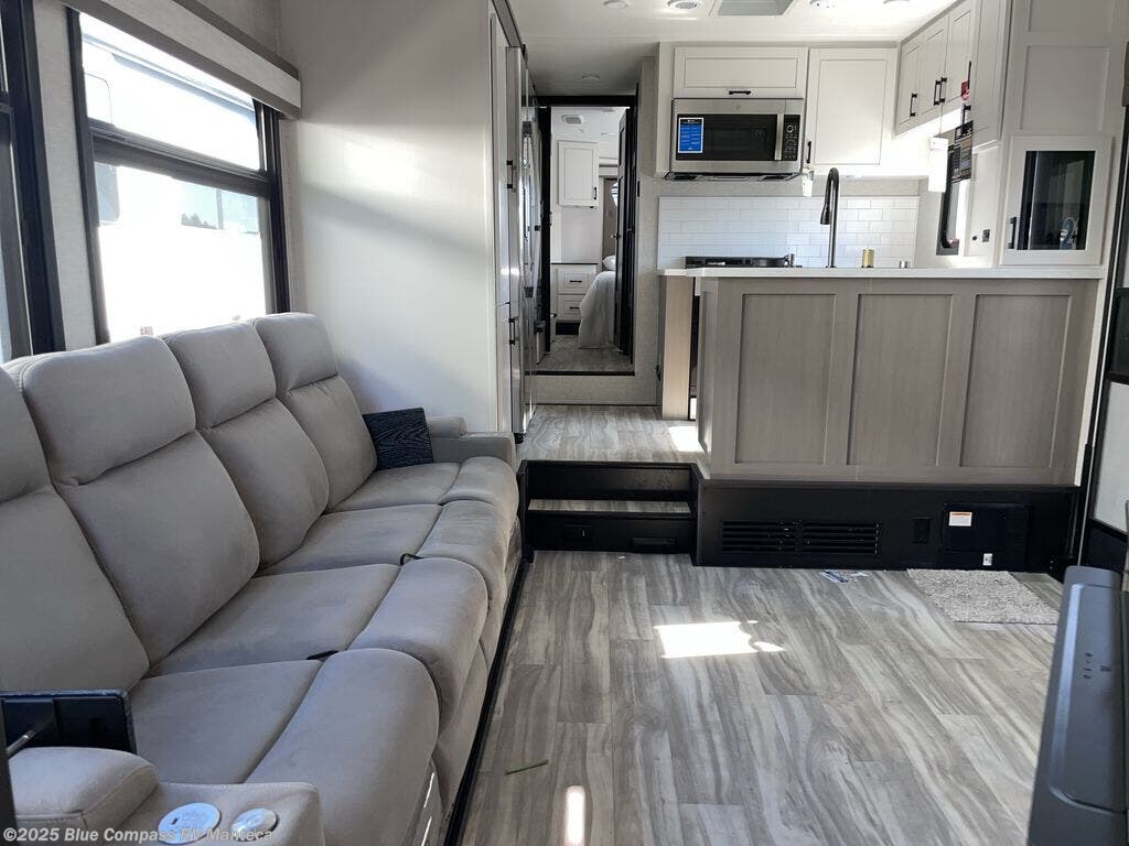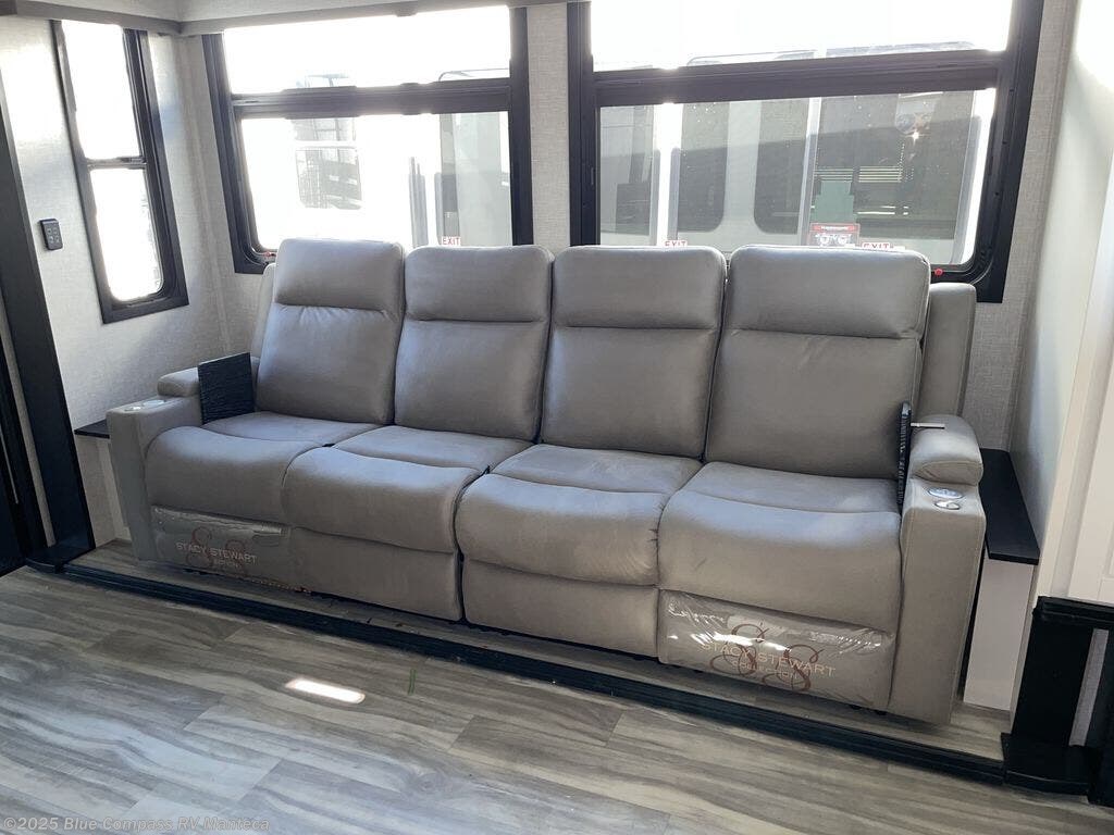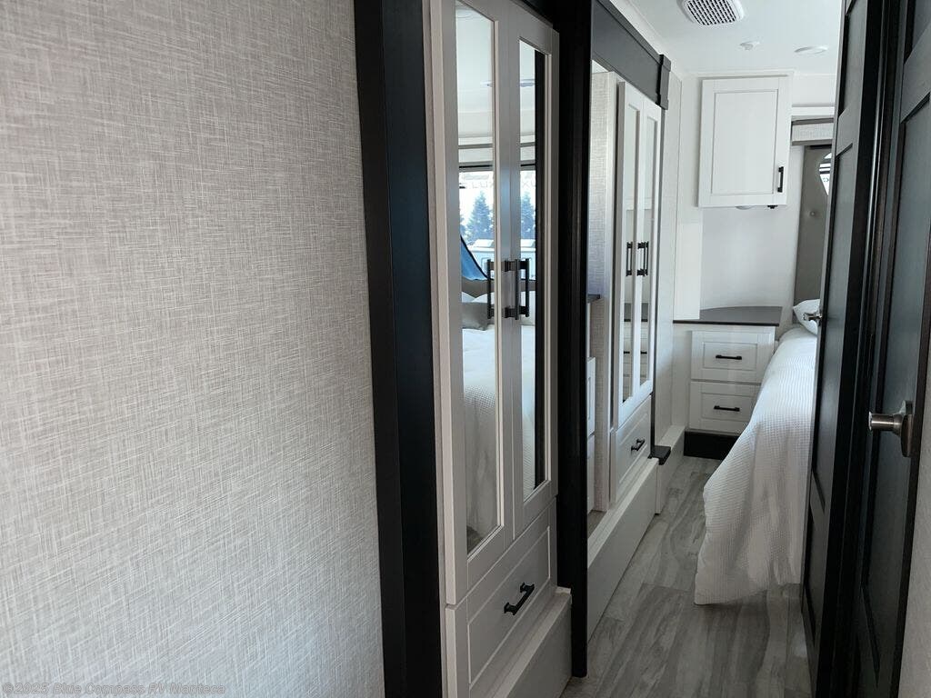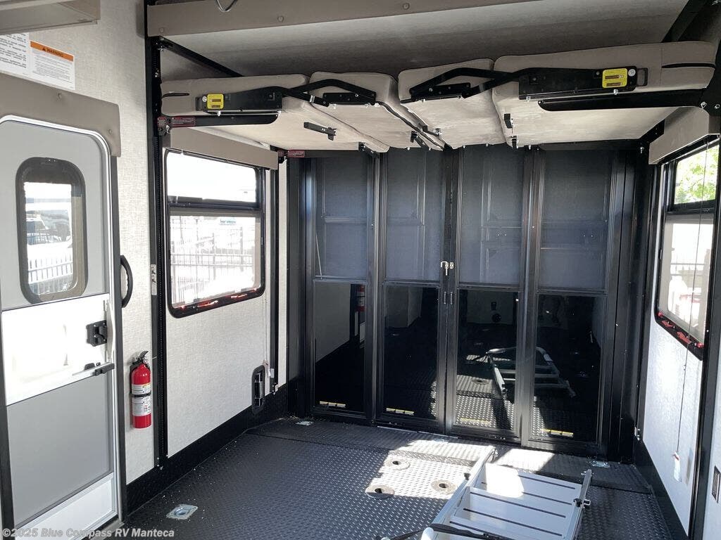 It's time to enjoy your toys and outdoor fun in this toy hauler! This separate garage offers an electric queen bed above rear convertible sofas, a second entry door, a half bath plus washer and dryer prep if you choose to add those appliances. Your friends can have their own space when they join you. And the party deck will be a popular hangout everywhere you go! The separate living and kitchen area offers patio doors to get to the side patio party deck with an exterior TV so you can relax above ground while outdoors. Back inside you will have a SuperSofa with heat, massage, recliners, cupholders and LED lighting to enjoy while watching the Smart LED HDTV with a fireplace below. The chef will have a U-shaped countertop with all the kitchen amenities such as a GE Profile Series 30 in. residential convection microwave with built in air fryer, and the 17 cu.ft. 12V refrigerator is just a few steps away. Everyone can take turns getting cleaned up in the inventive side-aisle bath with a walk-in shower. The front master bedroom has a walk-around king bed for all-around comfort, plus a slide out with a dresser and two wardrobes that stretches into the hallway.