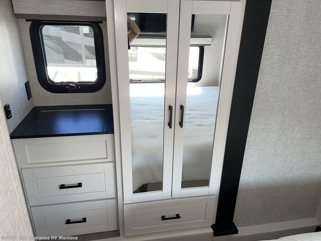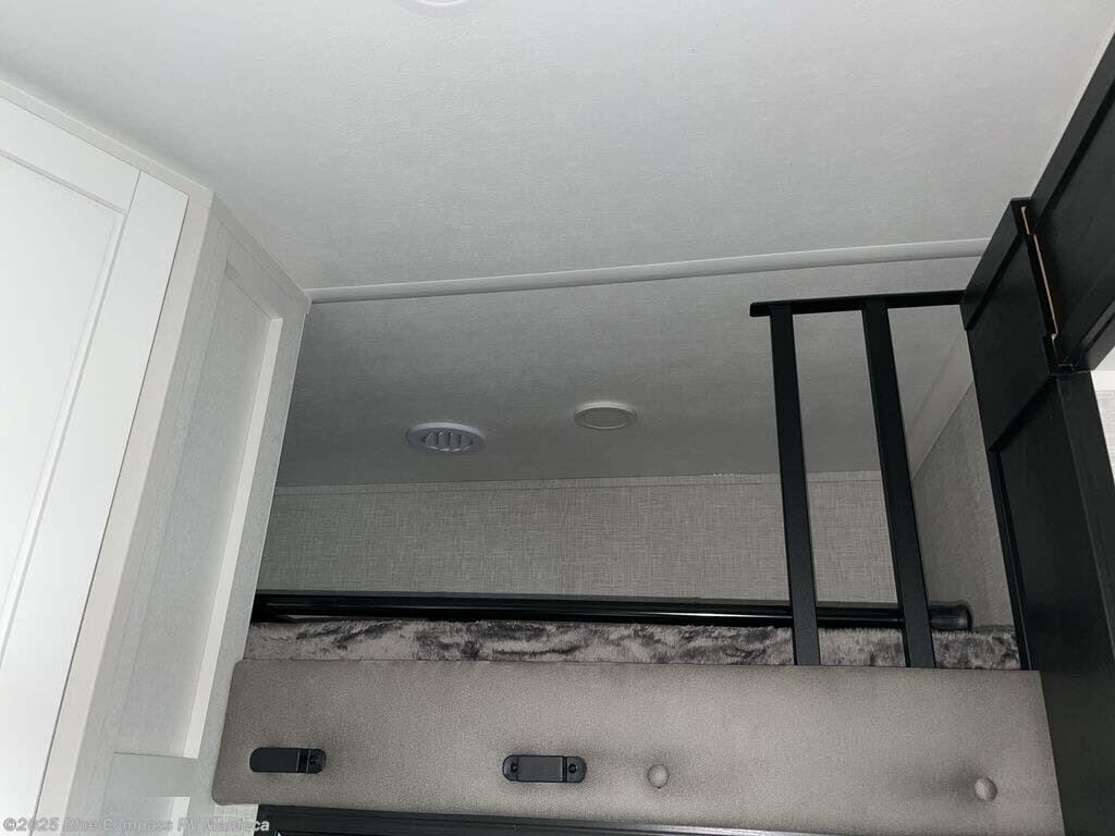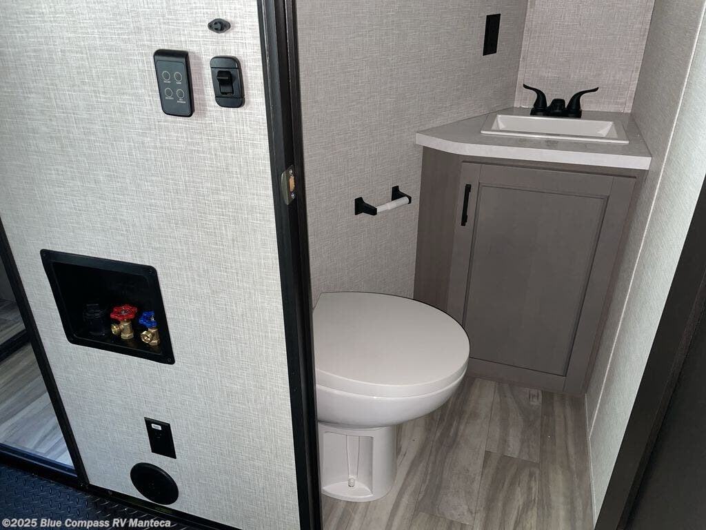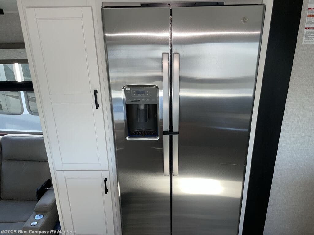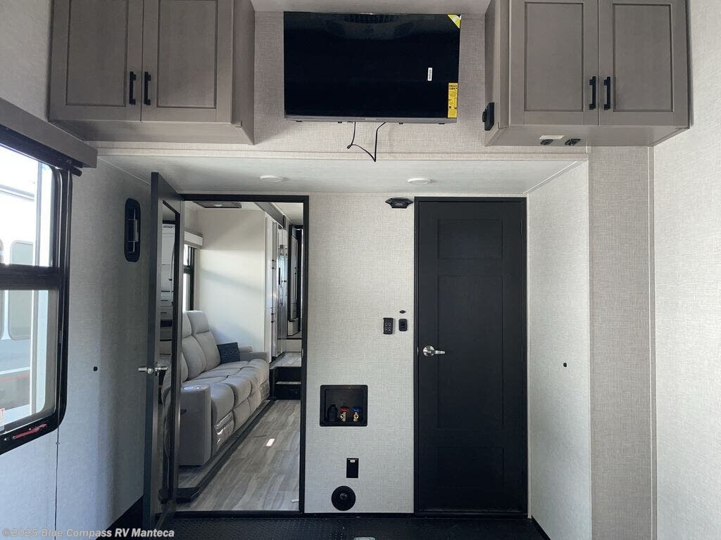 It's time to enjoy your toys and outdoor fun in this toy hauler! This separate garage offers an electric queen bed above rear convertible sofas, a second entry door, a half bath plus washer and dryer prep if you choose to add those appliances. Your friends can have their own space when they join you. And the party deck will be a popular hangout everywhere you go! The separate living and kitchen area offers patio doors to get to the side patio party deck with an exterior TV so you can relax above ground while outdoors. Back inside you will have a SuperSofa with heat, massage, recliners, cupholders and LED lighting to enjoy while watching the Smart LED HDTV with a fireplace below. The chef will have a U-shaped countertop with all the kitchen amenities such as a GE Profile Series 30 in. residential convection microwave with built in air fryer, and the 17 cu.ft. 12V refrigerator is just a few steps away. Everyone can take turns getting cleaned up in the inventive side-aisle bath with a walk-in shower. The front master bedroom has a walk-around king bed for all-around comfort, plus a slide out with a dresser and two wardrobes that stretches into the hallway.