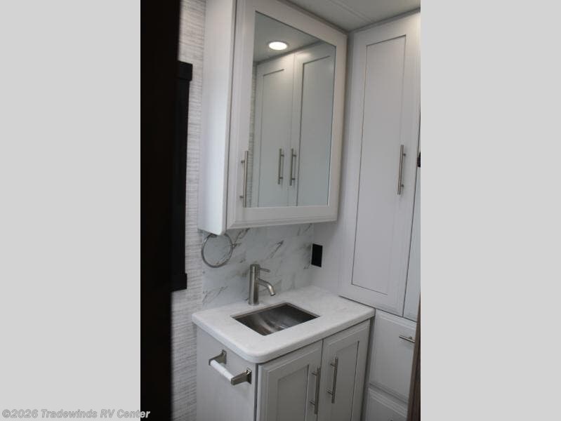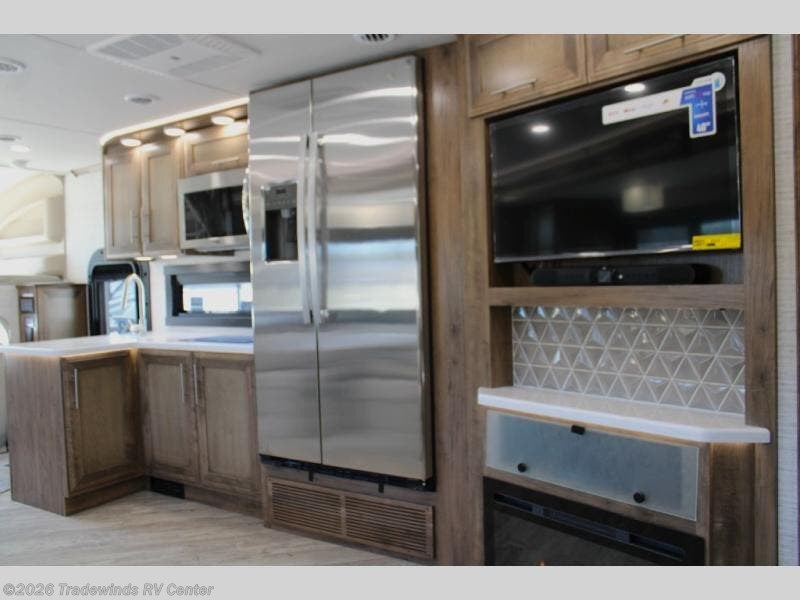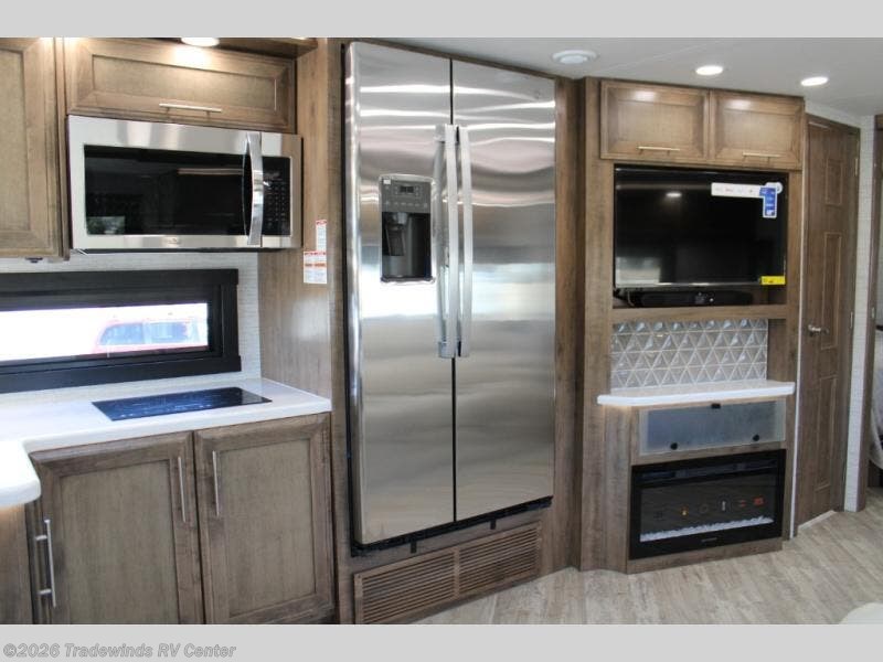 You will find lots to love with this motorhome! From the bath and a half to the bunk over cab and outside entertainment center. The chef can prepare their best meals with the two burner induction cooktop and the residential refrigerator. There's a large pantry next to the booth dinette so you can quickly grab a snack during game night or if you prefer to relax instead then you can enjoy the fireplace and 39" LED HD Smart Fire TV while sitting on the 93" reclining sofa. The master suite has a king bed slide with a power head lift to lay your head on at night, an LED HD Smart TV with a wardrobe and storage area next to it, as well as an area prepped to add an optional washer and dryer. You even have access to the full rear bathroom which has a 30" x 36" shower and a wardrobe to keep your linens close.
