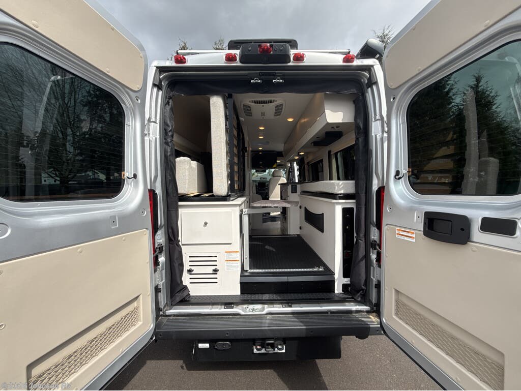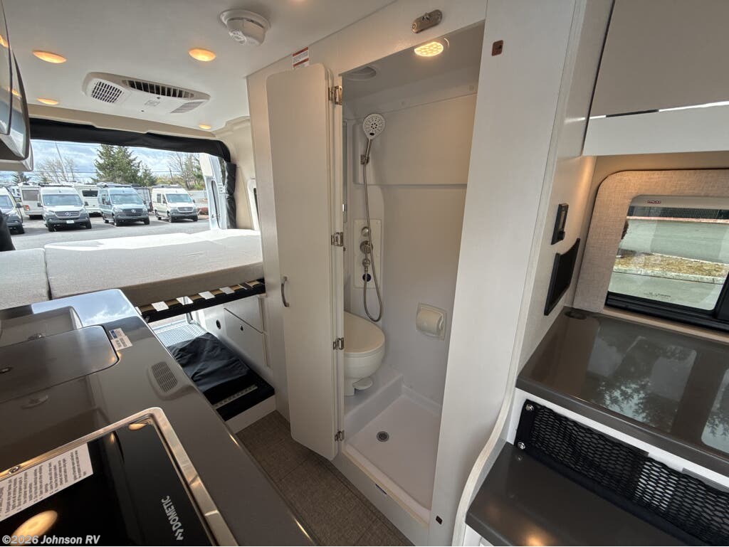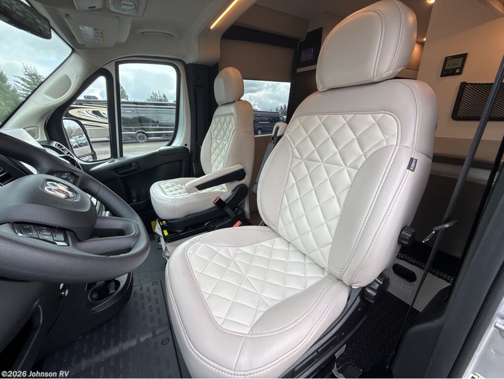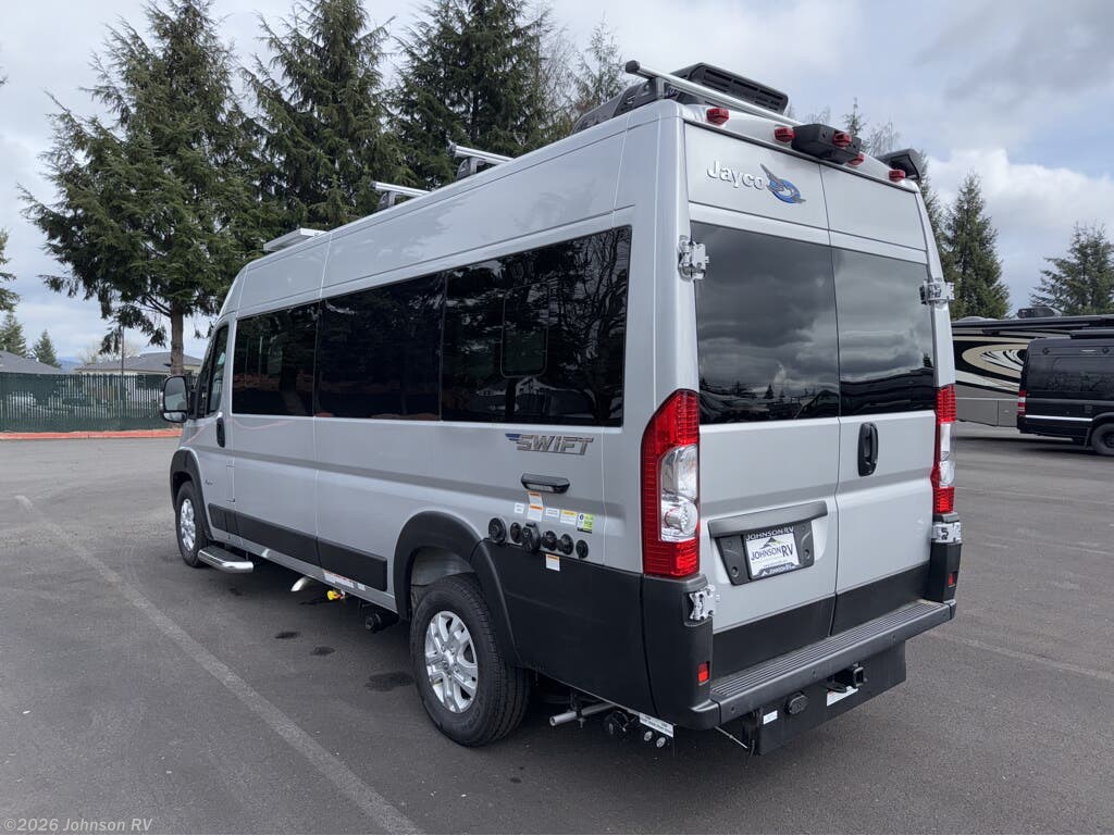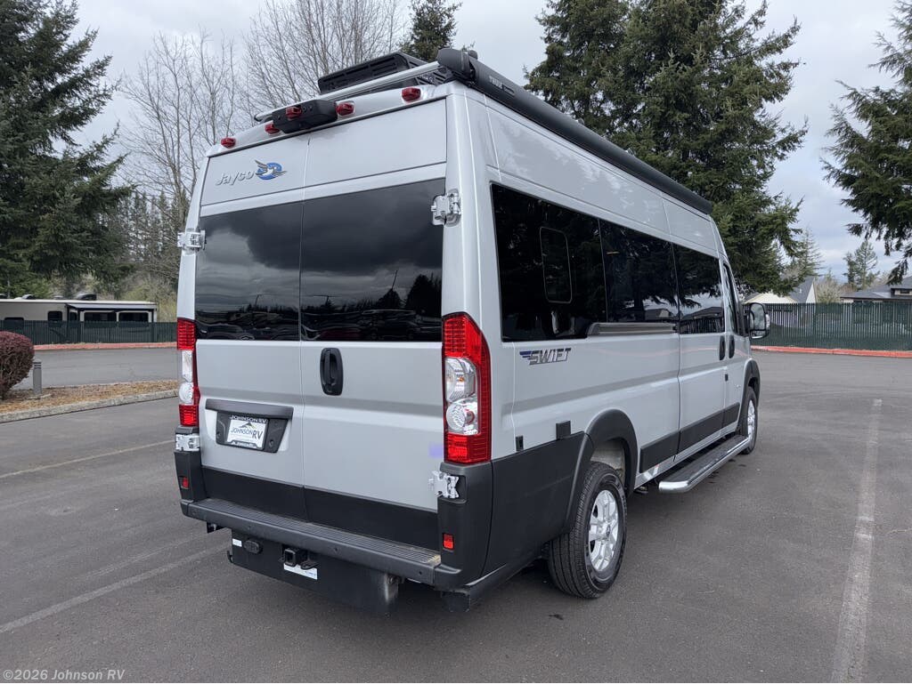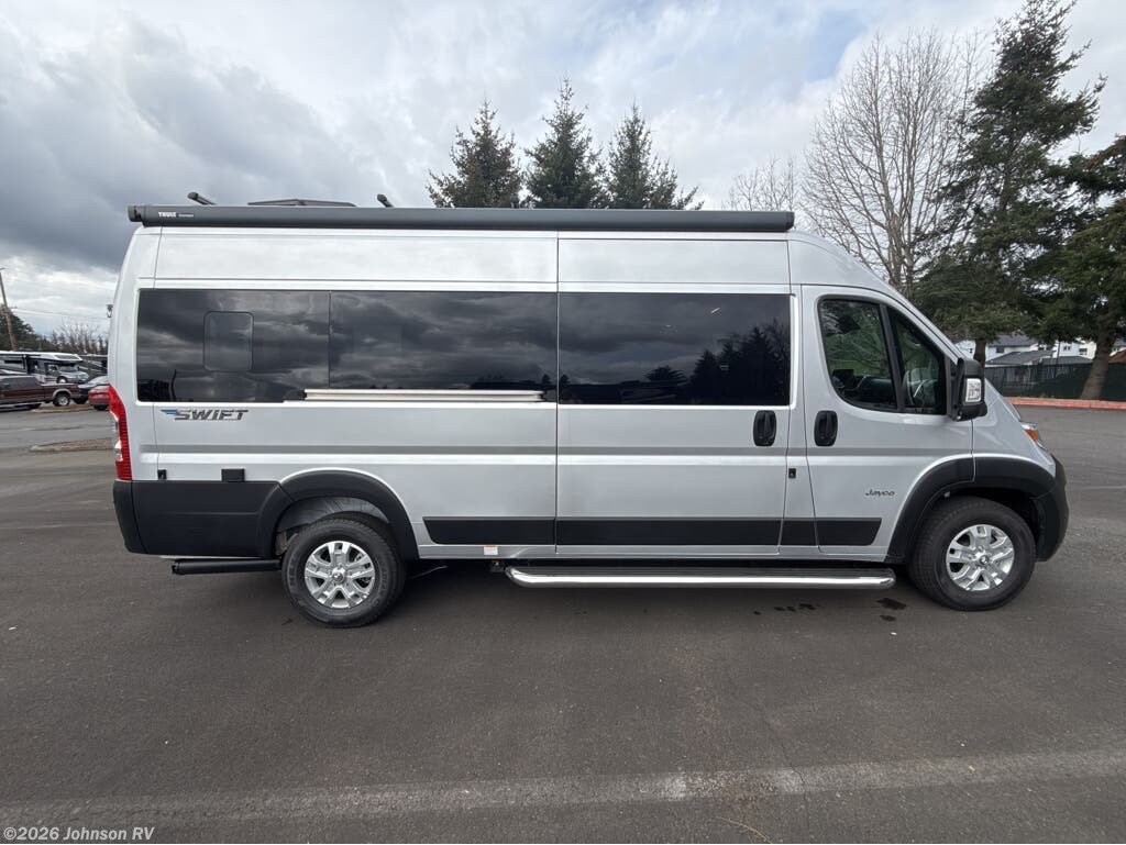 The 2025 Jayco Swift 20E is a Class B motorhome that combines compact design with practical amenities, making it an ideal choice for travelers seeking versatility and comfort. Built on the RAM ProMaster 3500 chassis and powered by a 3.6L V6 engine delivering 276 horsepower, this coach offers a smooth and responsive driving experience. Inside, the Swift 20E features a thoughtfully designed living space with a rear Murphy bed measuring 59" x 73", providing a comfortable sleeping area that can be stowed away to maximize interior space. The well-equipped kitchen includes a two-burner gas cooktop, convection microwave, and a 3.0 cu. ft. DC refrigerator, making meal preparation convenient on the road. The wet bath offers a shower with magnetic curtain surround, toilet with foot flush, and a medicine cabinet with mirror, ensuring the comforts of home wherever you travel. Additional amenities such as the 13-foot Thule® armless patio awning with LED light strip, Tecnoform® European-style high-gloss cabinetry, and JBL® Flip 6 removable wireless Bluetooth speaker enhance the overall travel experience.