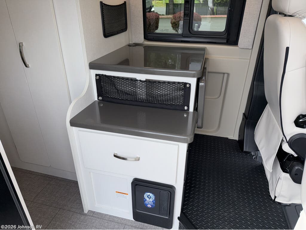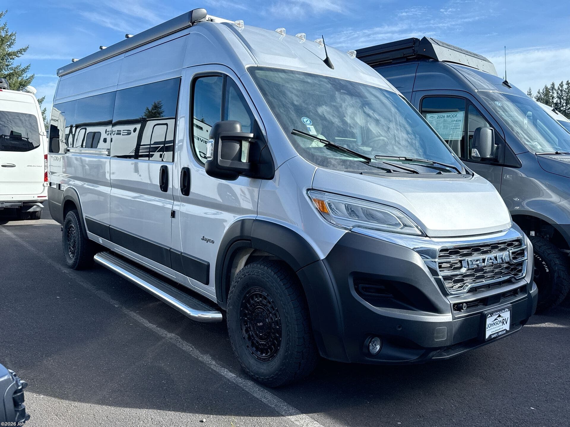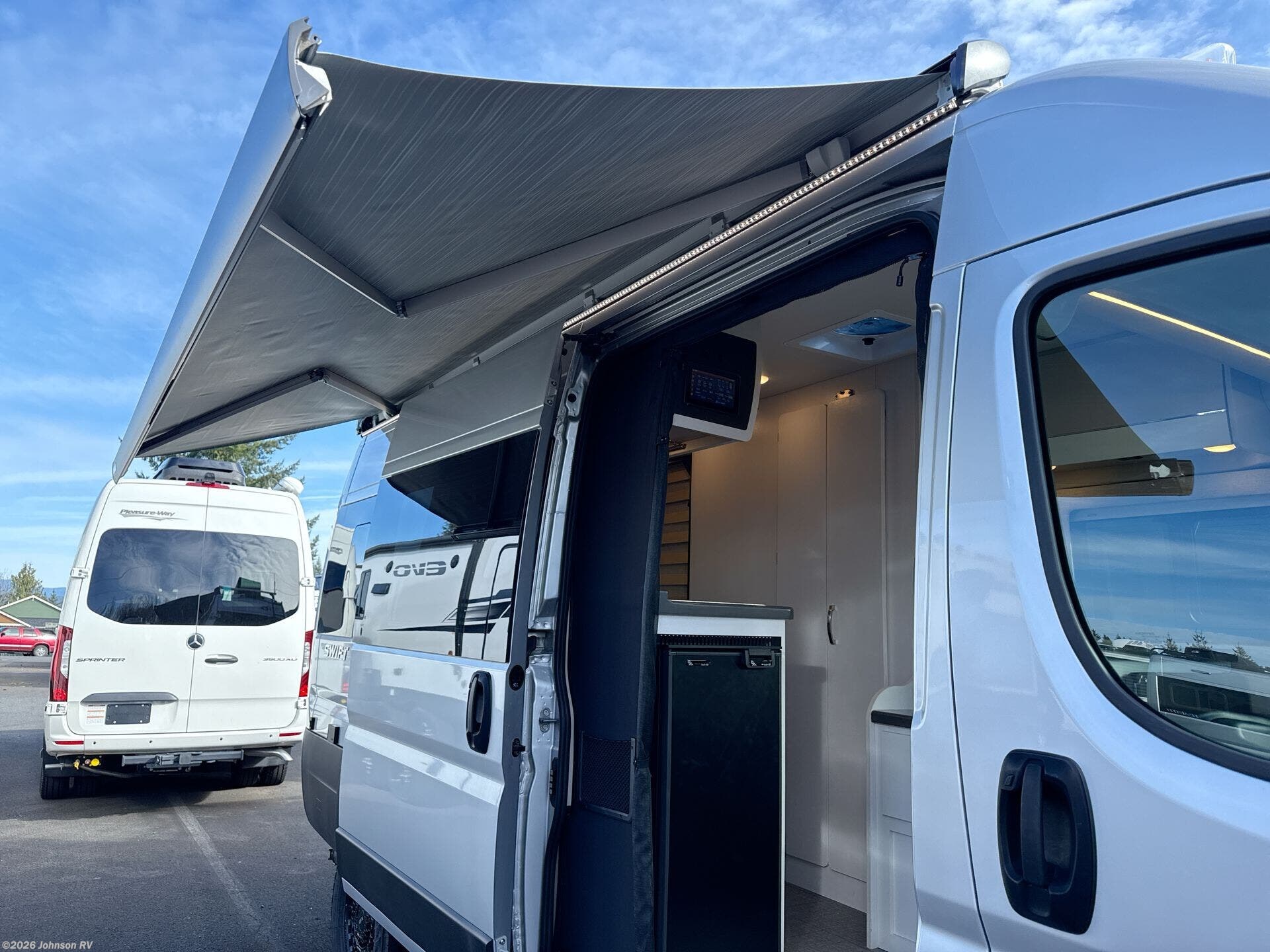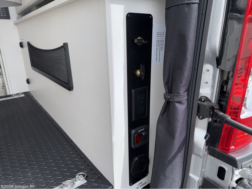 The 2025 Jayco Swift 20E is a Class B motorhome that combines compact design with practical amenities, making it an ideal choice for travelers seeking versatility and comfort. Built on the RAM ProMaster 3500 chassis and powered by a 3.6L V6 engine delivering 276 horsepower, this coach offers a smooth and responsive driving experience. Inside, the Swift 20E features a thoughtfully designed living space with a rear Murphy bed measuring 59" x 73", providing a comfortable sleeping area that can be stowed away to maximize interior space. The well-equipped kitchen includes a two-burner gas cooktop, convection microwave, and a 3.0 cu. ft. DC refrigerator, making meal preparation convenient on the road. The wet bath offers a shower with magnetic curtain surround, toilet with foot flush, and a medicine cabinet with mirror, ensuring the comforts of home wherever you travel. Additional amenities such as the 13-foot Thule® armless patio awning with LED light strip, Tecnoform® European-style high-gloss cabinetry, and JBL® Flip 6 removable wireless Bluetooth speaker enhance the overall travel experience.