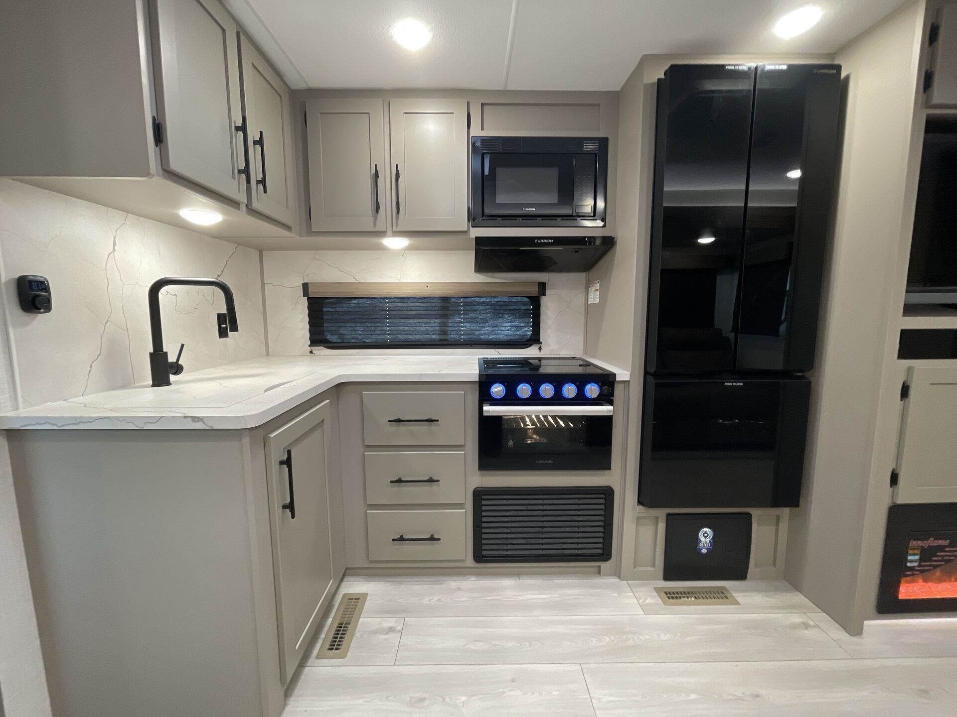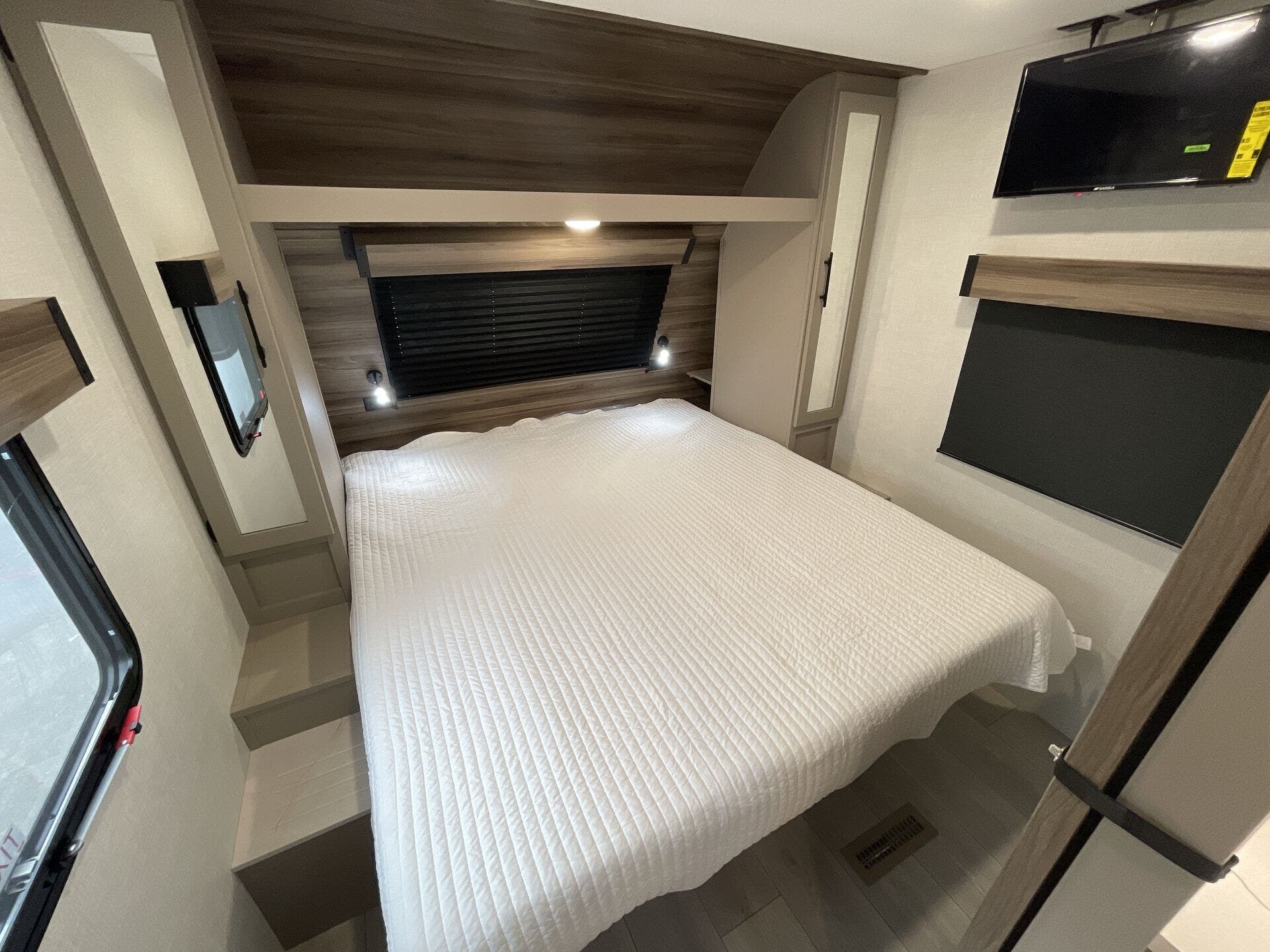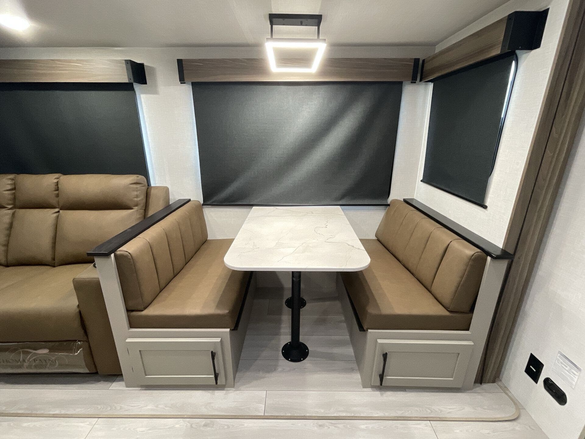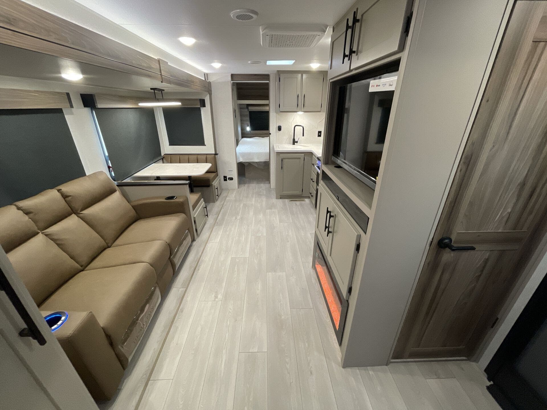 This new model boasts a comprehensive list of amenities to enhance your travel experience. Inside, you'll find a well-equipped kitchen featuring a microwave, oven, refrigerator, and a stove top burner, allowing you to prepare meals with ease. The interior is illuminated with a skylight, creating a bright and inviting atmosphere. For added comfort, a cozy fireplace provides warmth during chilly nights, while the booth dinette offers a space for dining and socializing.