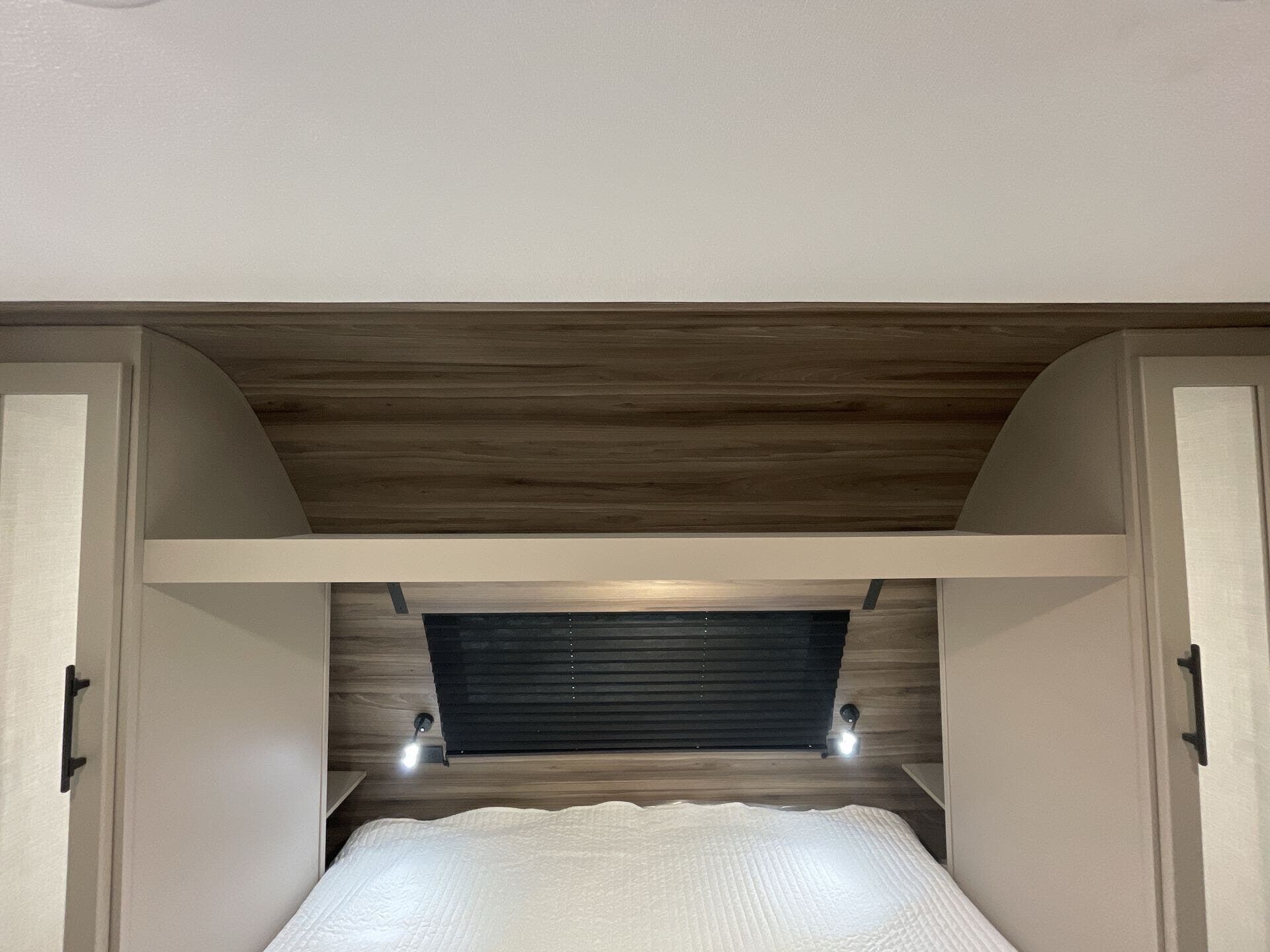 For a restful night's sleep, the trailer is furnished with a king-size bed, ensuring comfort for your entire family. Additional sleeping accommodations are available with the convertible booth dinette. The bathroom includes a shower and toilet, complemented by a medicine cabinet for toiletries, and the trailer features multiple roof vents for proper ventilation.