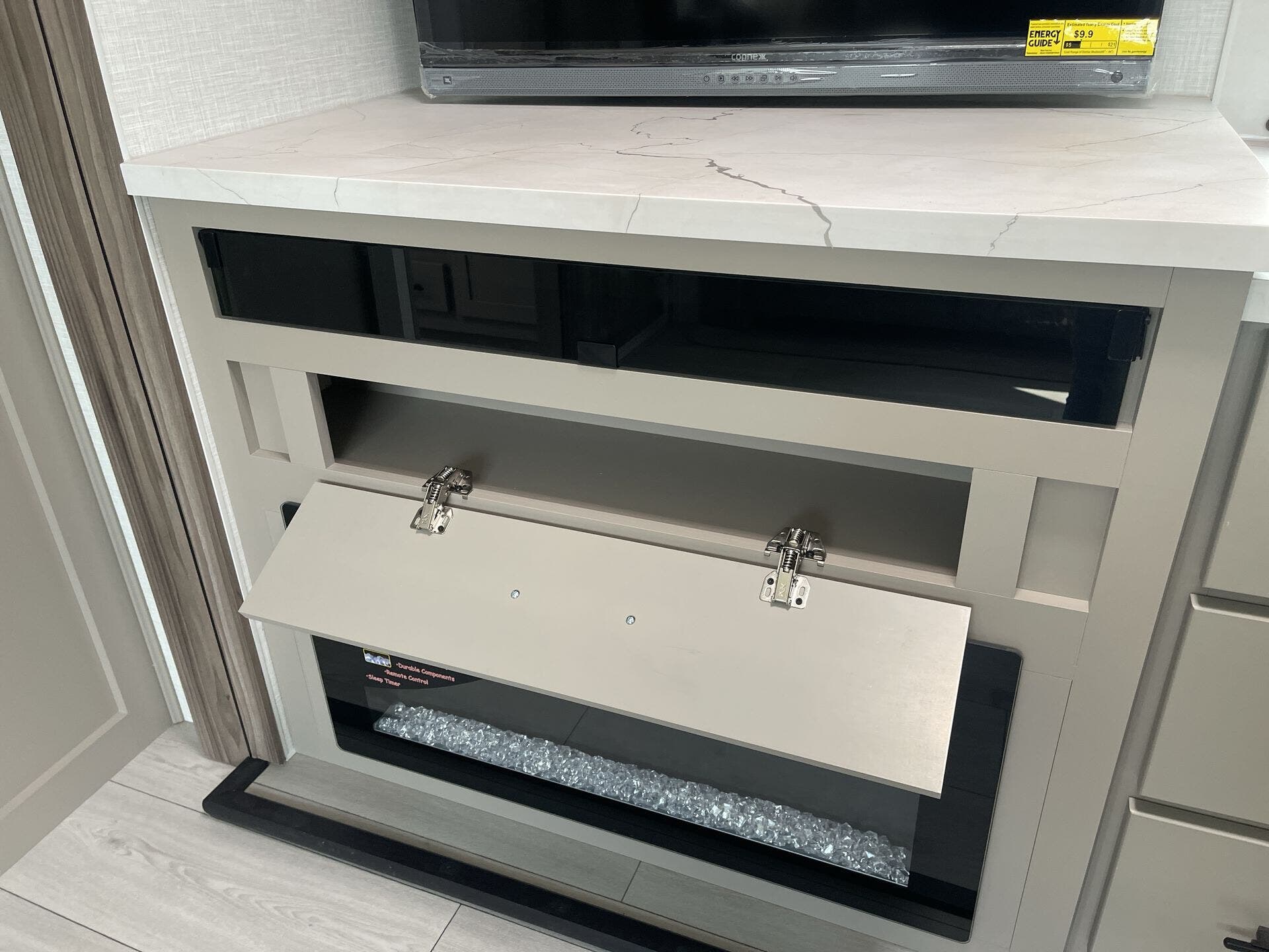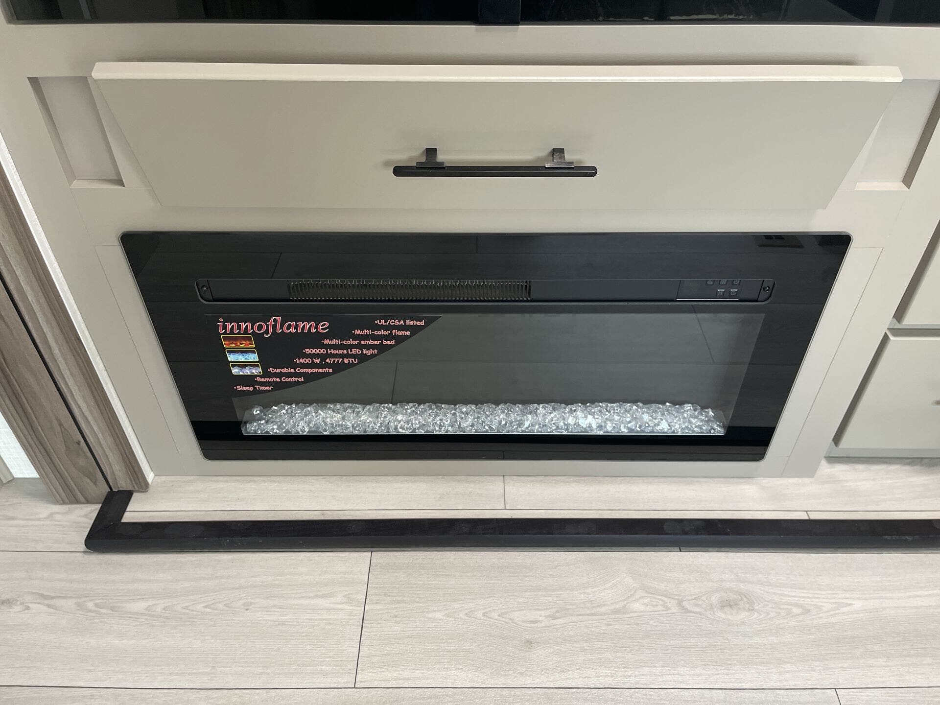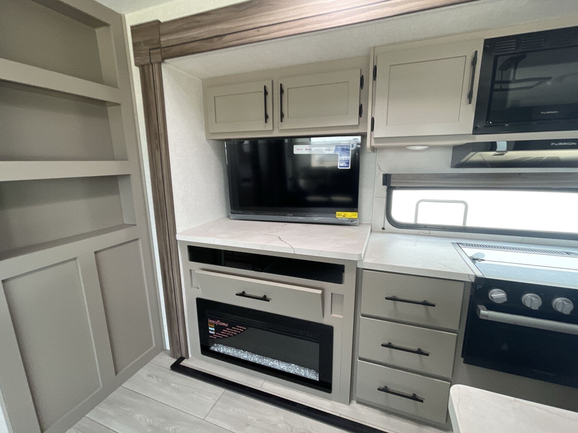 Inside, you’ll find a well-equipped kitchen featuring a microwave, oven, and refrigerator, along with a dedicated water heater for added comfort on longer trips. The living area is designed for relaxation and entertainment, including a TV with antenna access, LED lighting for energy efficiency, and a cozy fireplace ambiance that’s perfect for cooler evenings. A dinette provides a convenient dining area and additional seating, while a shower and toilet offer the essentials for extended stays.