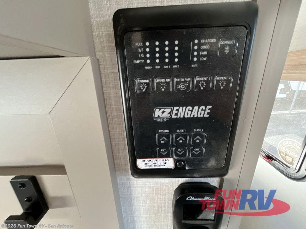 The KZ Connect travel trailer comes with an RV Airflow System which optimizes the airflow for your air conditioner by increasing the airflow by an average of 40%. This improves performance, speeds up cooling times, and reduces noise in your trailer. Some of the other helpful features found on the Connect are the heated, insulated, and enclosed underbelly, the exterior docking station, the fiberglass front cap with front windshield, the 82" interior ceiling height, and the protective front diamond plate. There are some useful technological features, like the two LED motion-sensor lights, the HDMI and USB charge, and the multi-media entertainment system with a DVD player. The KZ Engage is powered by OneControl, and it monitors battery levels and controls slide rooms, the leveling system, the awning, inside/outside lighting, and the TPMS prep.