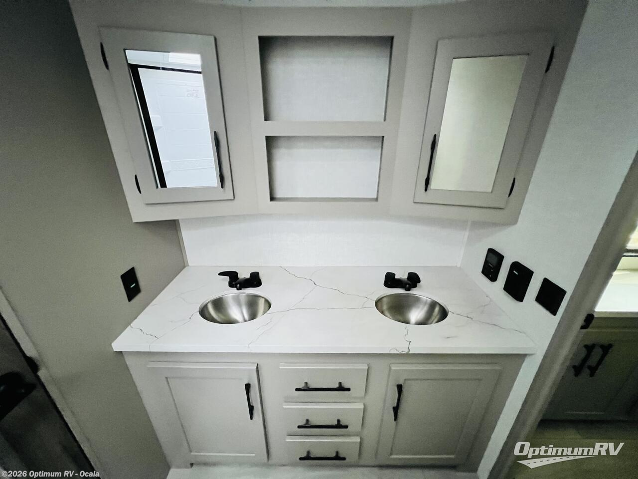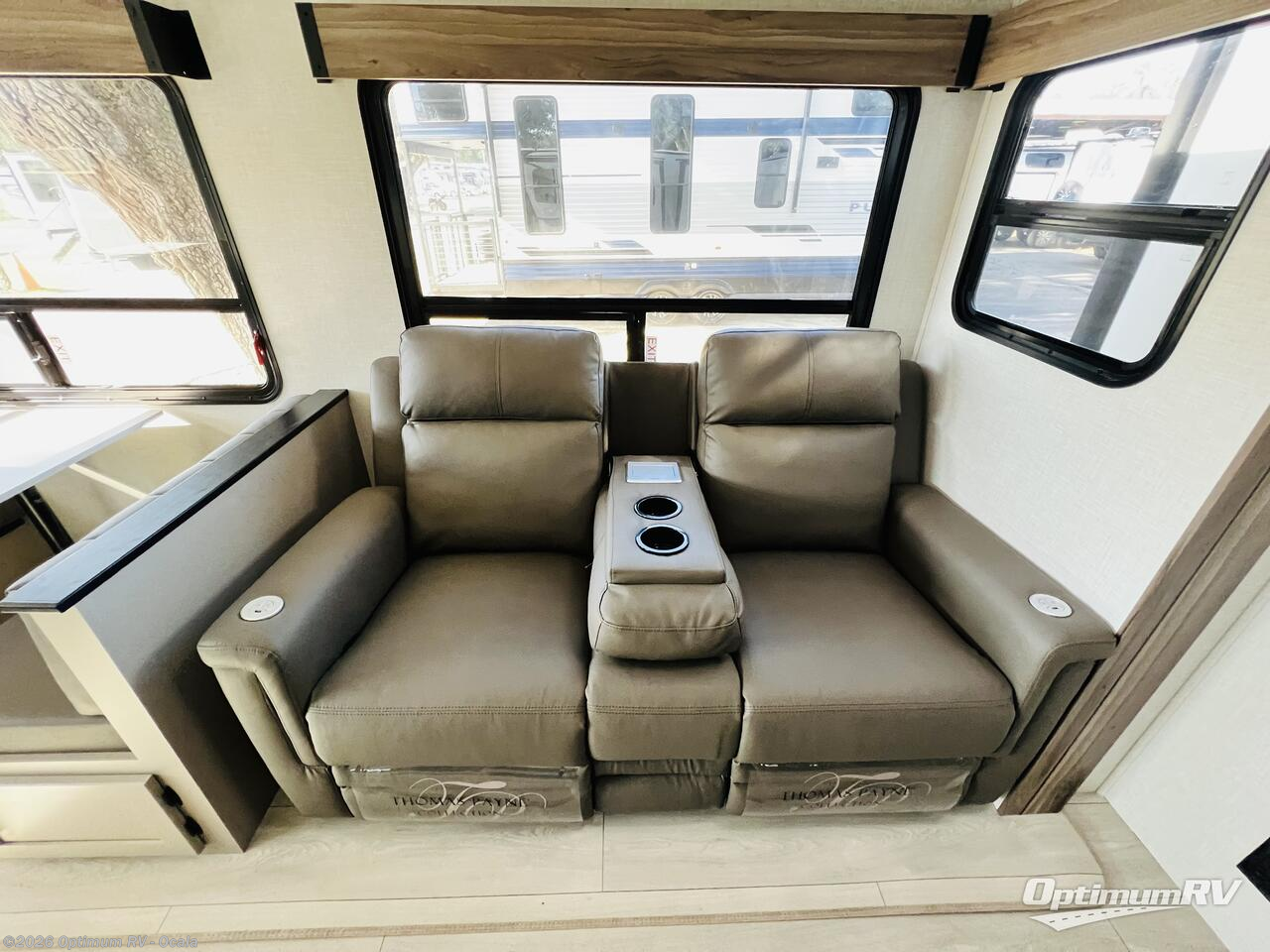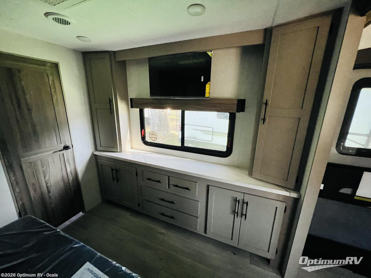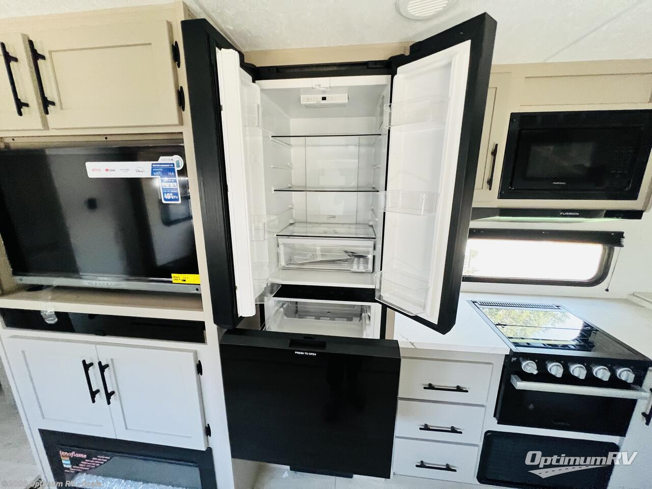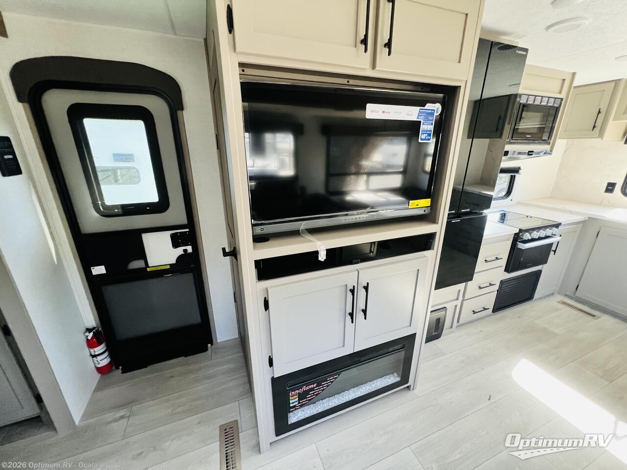 Pack your bags and head to the lake in this cozy travel trailer for five. Once you unload your gear from the pass-through storage, prepare a quick lunch on the mini outside kitchen with a griddle and relax under the patio awning. If the weather is raining on your parade, just head indoors to cook on the three burner cooktop, and you'll find ample counter space in this rear kitchen to set out drinks and sides. Your crew can relax on the hide-a-bed sofa and booth dinette within the large slide out, and there is an LED TV and a 34" fireplace for a more at-home atmosphere. One of your favorite features of this trailer will probably be the master suite with a king bed slide out, a dresser and an entertainment center, plus easy access to the front full bath. Here, you'll find dual bath sinks, a spacious shower, plus a walk-in closet with a closet rod to keep your outfits wrinkle free. There is even a wardrobe in the bedroom with washer and dryer prep so you can keep all those clothes fresh and clean!