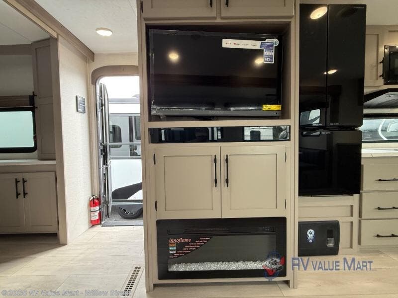 Pack your bags and head to the lake in this cozy travel trailer for five. Once you unload your gear from the pass-through storage, prepare a quick lunch on the mini outside kitchen with a griddle and relax under the patio awning. If the weather is raining on your parade, just head indoors to cook on the three burner cooktop, and you'll find ample counter space in this rear kitchen to set out drinks and sides. Your crew can relax on the hide-a-bed sofa and booth dinette within the large slide out, and there is an LED TV and a 34" fireplace for a more at-home atmosphere. One of your favorite features of this trailer will probably be the master suite with a king bed slide out, a dresser and an entertainment center, plus easy access to the front full bath. Here, you'll find dual bath sinks, a spacious shower, plus a walk-in closet with a closet rod to keep your outfits wrinkle free. There is even a wardrobe in the bedroom with washer and dryer prep so you can keep all those clothes fresh and clean!