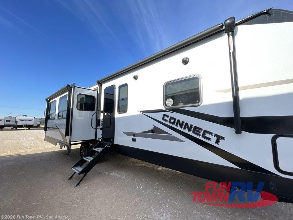 How about a nice afternoon of relaxing on the lake and then rinsing off in the 30" x 36" shower on this Connect travel trailer? After you get clean, you can grab a fresh change of clothes from the front walk-in closet and dresser in the private bedroom. The bedroom also has an area prepped for a washer and dryer and a king bed slide. Out in the main living area, you'll be able to prepare a meal without much effort at all since this trailer has a three-burner range, a microwave, a 10 cu. ft. 12V refrigerator, and a kitchen island for more prep space. You can even have your friends sit on the 70" sofa, theater seating, and booth dinette to chat with you while you finish the meal. You all will also benefit from the two electric awnings with LED lights on the exterior.