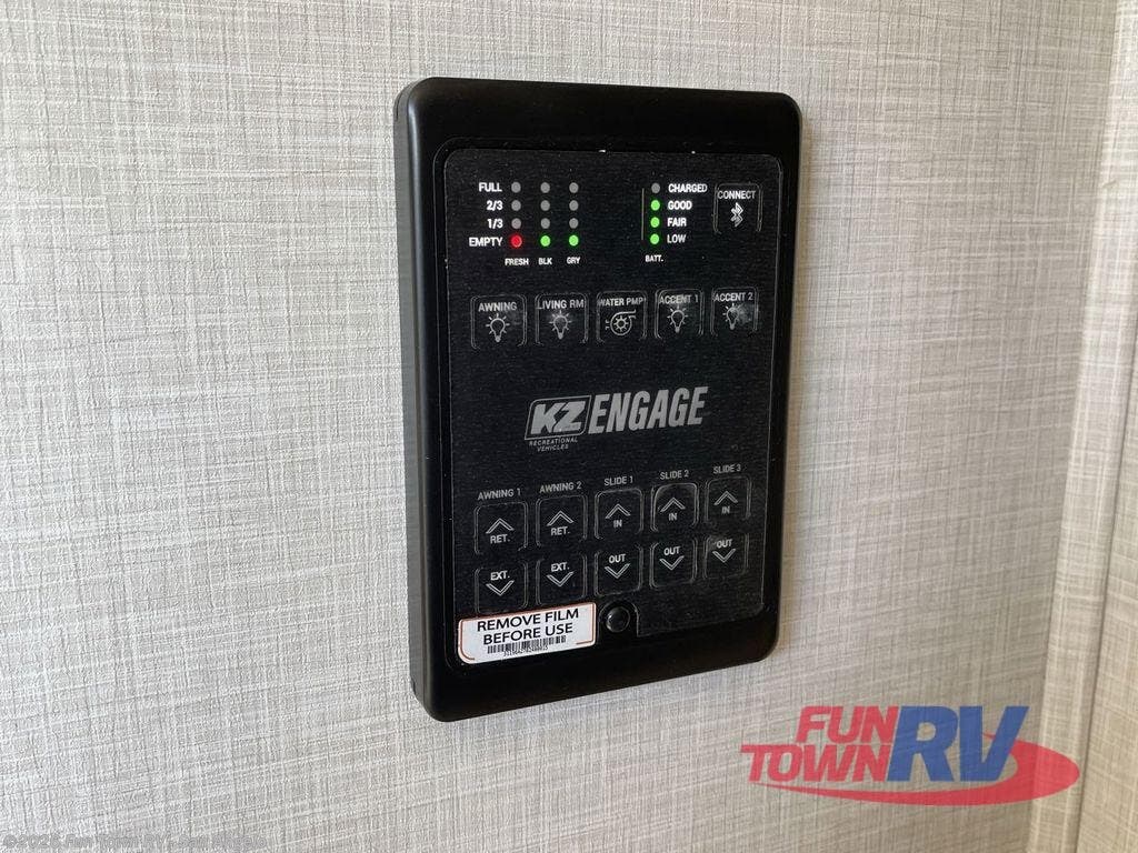 The KZ Connect travel trailer comes with an RV Airflow System which optimizes the airflow for your air conditioner by increasing the airflow by an average of 40%. This improves performance, speeds up cooling times, and reduces noise in your trailer. Some of the other helpful features found on the Connect are the heated, insulated, and enclosed underbelly, the exterior docking station, the fiberglass front cap with front windshield, the 82" interior ceiling height, and the protective front diamond plate. There are some useful technological features, like the two LED motion-sensor lights, the HDMI and USB charge, and the multi-media entertainment system with a DVD player. The KZ Engage is powered by OneControl, and it monitors battery levels and controls slide rooms, the leveling system, the awning, inside/outside lighting, and the TPMS prep.