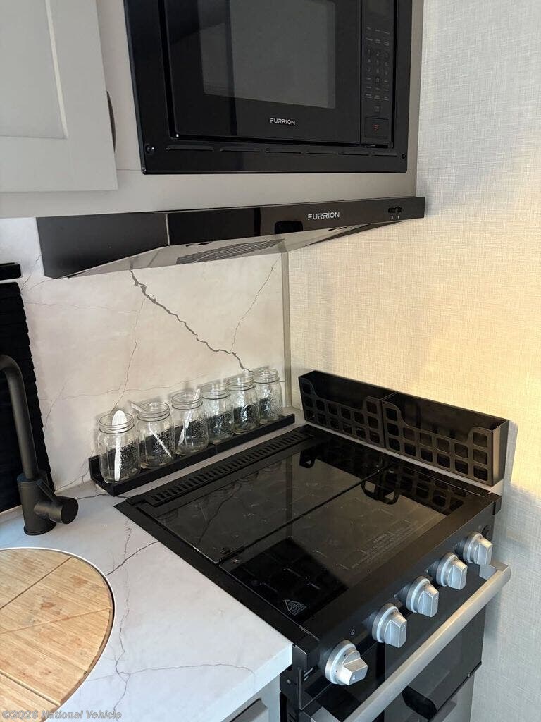 The kitchen is fully equipped for serious meals on the road, including an 8 cu ft 12V refrigerator, a 3-burner cooktop, a 17" oven, and a microwave-perfect for everything from quick breakfasts to full dinners under the awning.