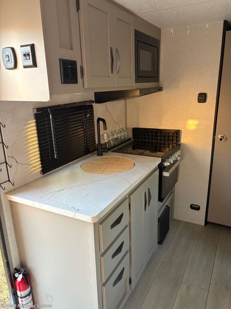 Outside, enjoy effortless camping with a power awning featuring LED lighting, plus an exterior spray port for quick cleanup after outdoor adventures. The trailer is also prepped for modern tech with solar prep and backup camera prep, making it both future-ready and convenient.