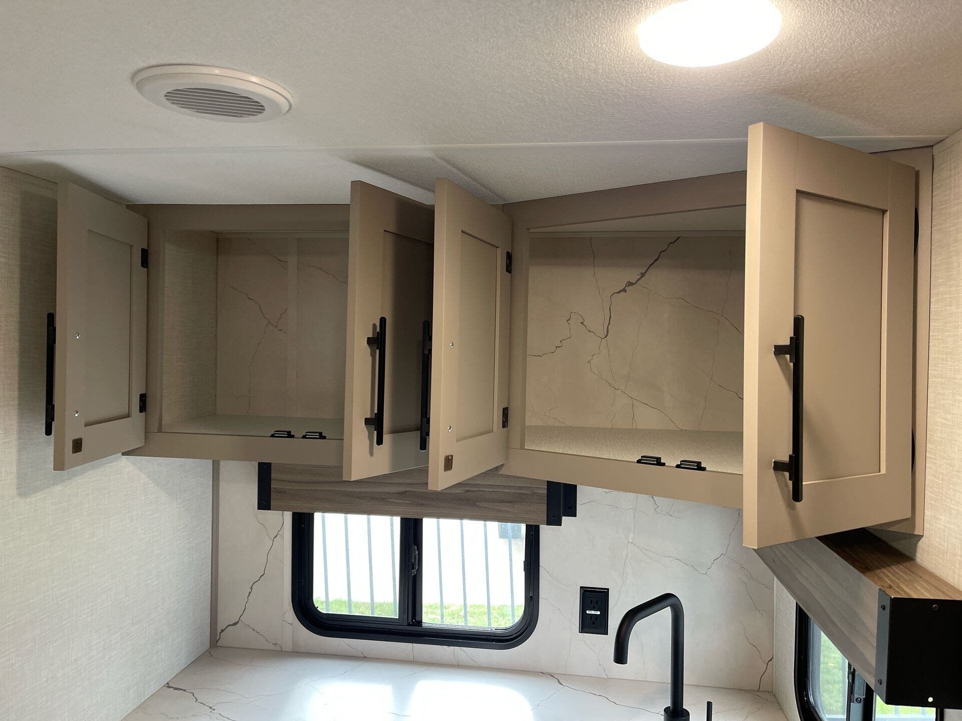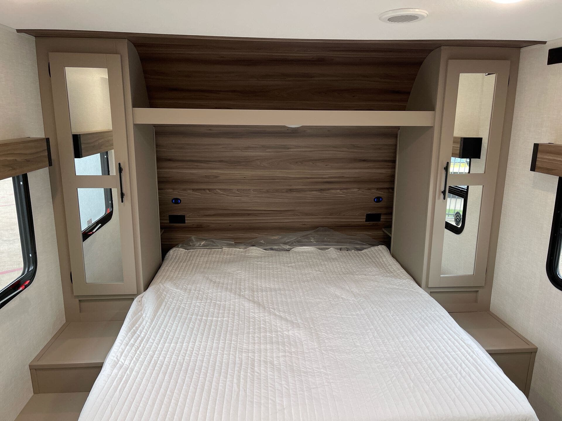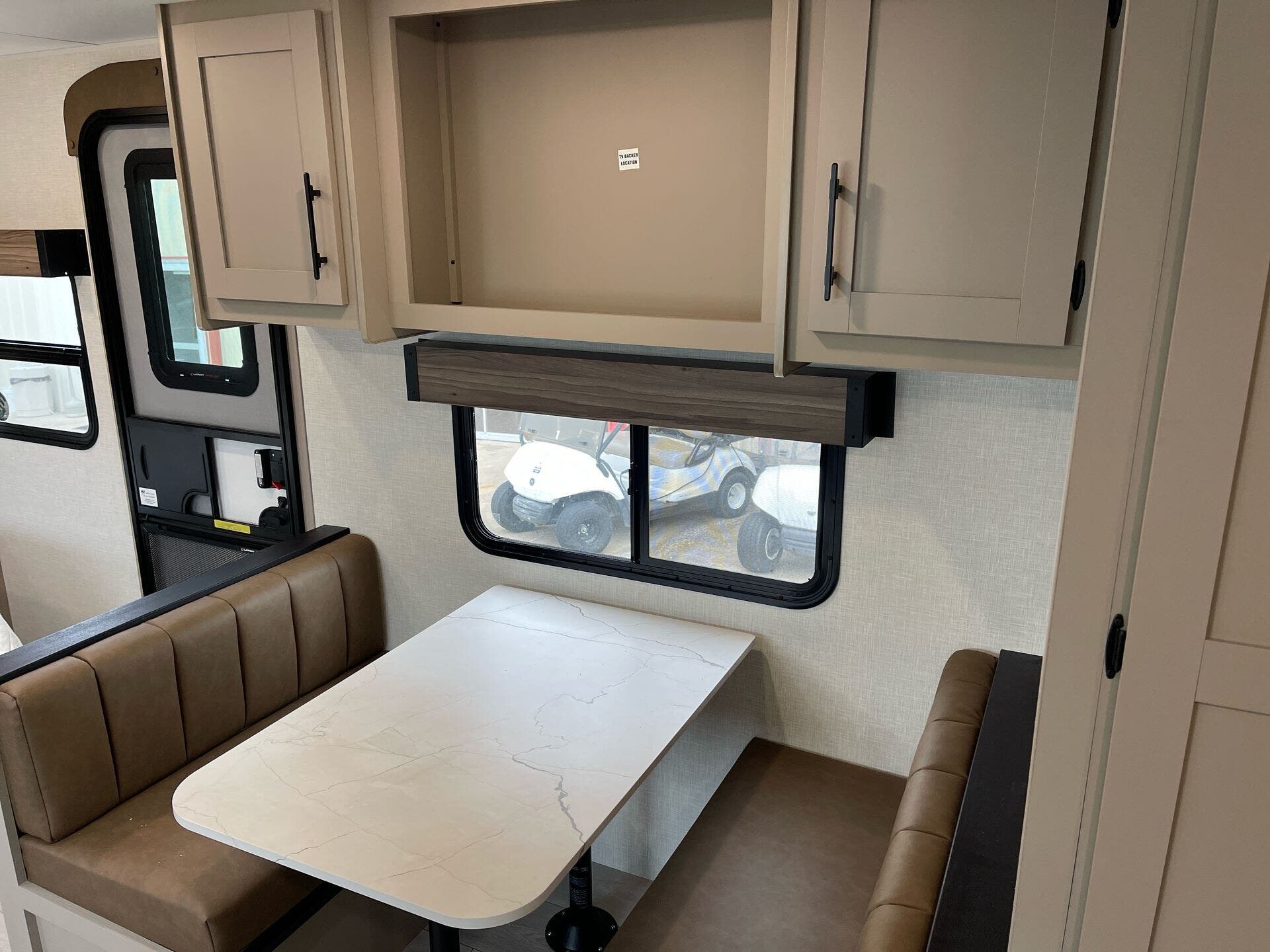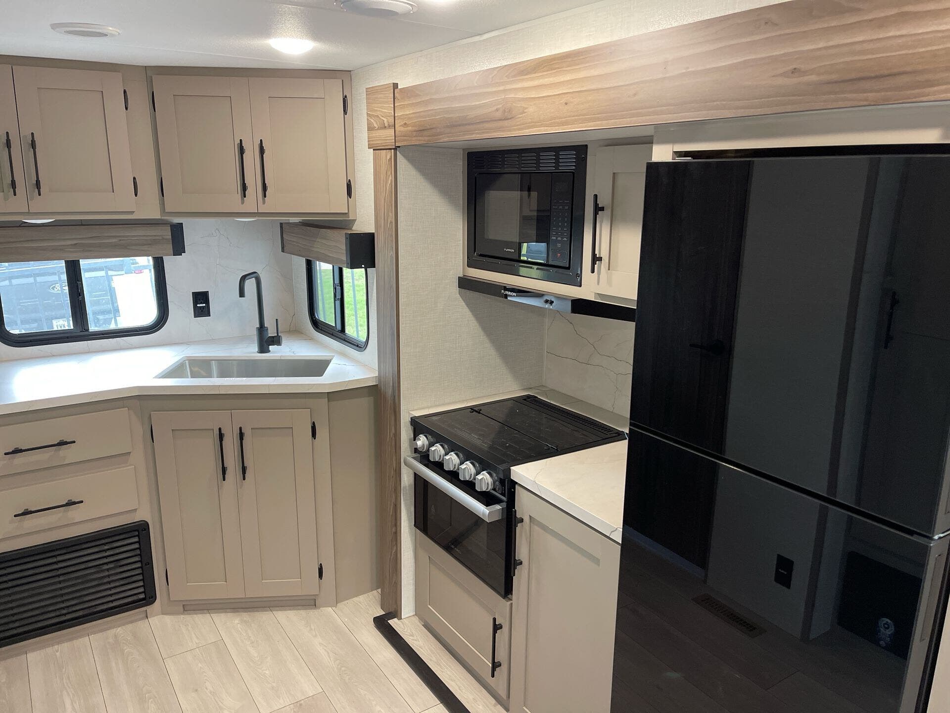 Inside, the 211MKSE offers a spacious rear kitchen layout featuring a 10 cu. ft. 12V refrigerator, three-burner cooktop, oven, microwave, and seamless countertops with a deep stainless steel sink. The slide-out houses a jackknife sofa and a booth dinette, both of which can convert into additional sleeping areas. The front bedroom includes a queen-size bed with dual wardrobes and overhead storage.