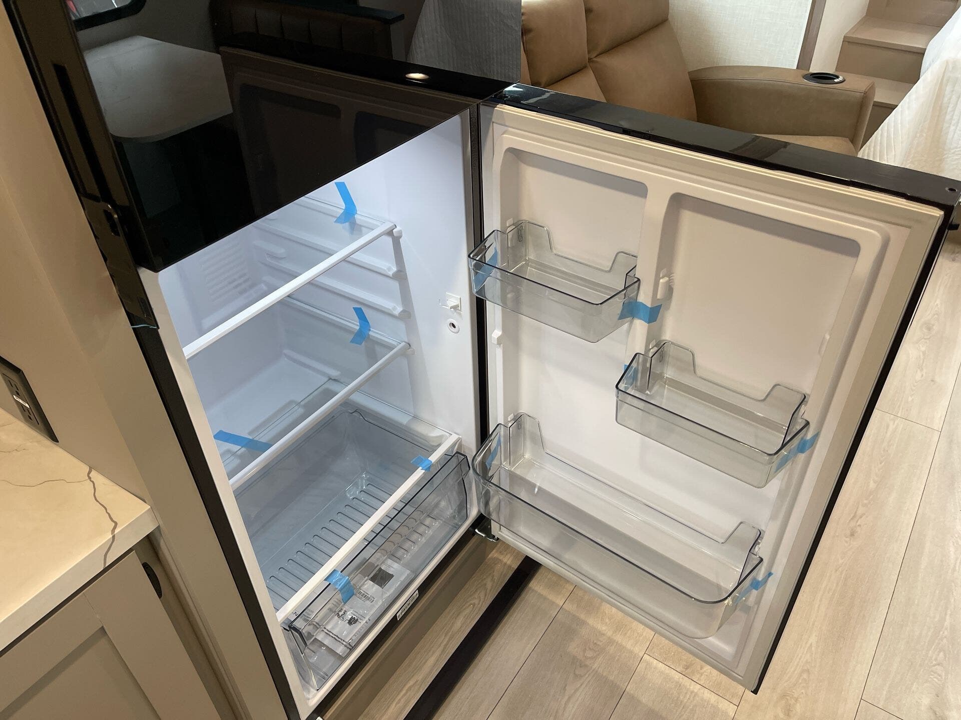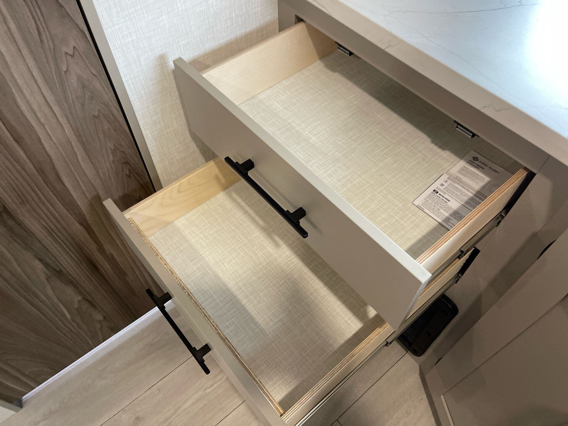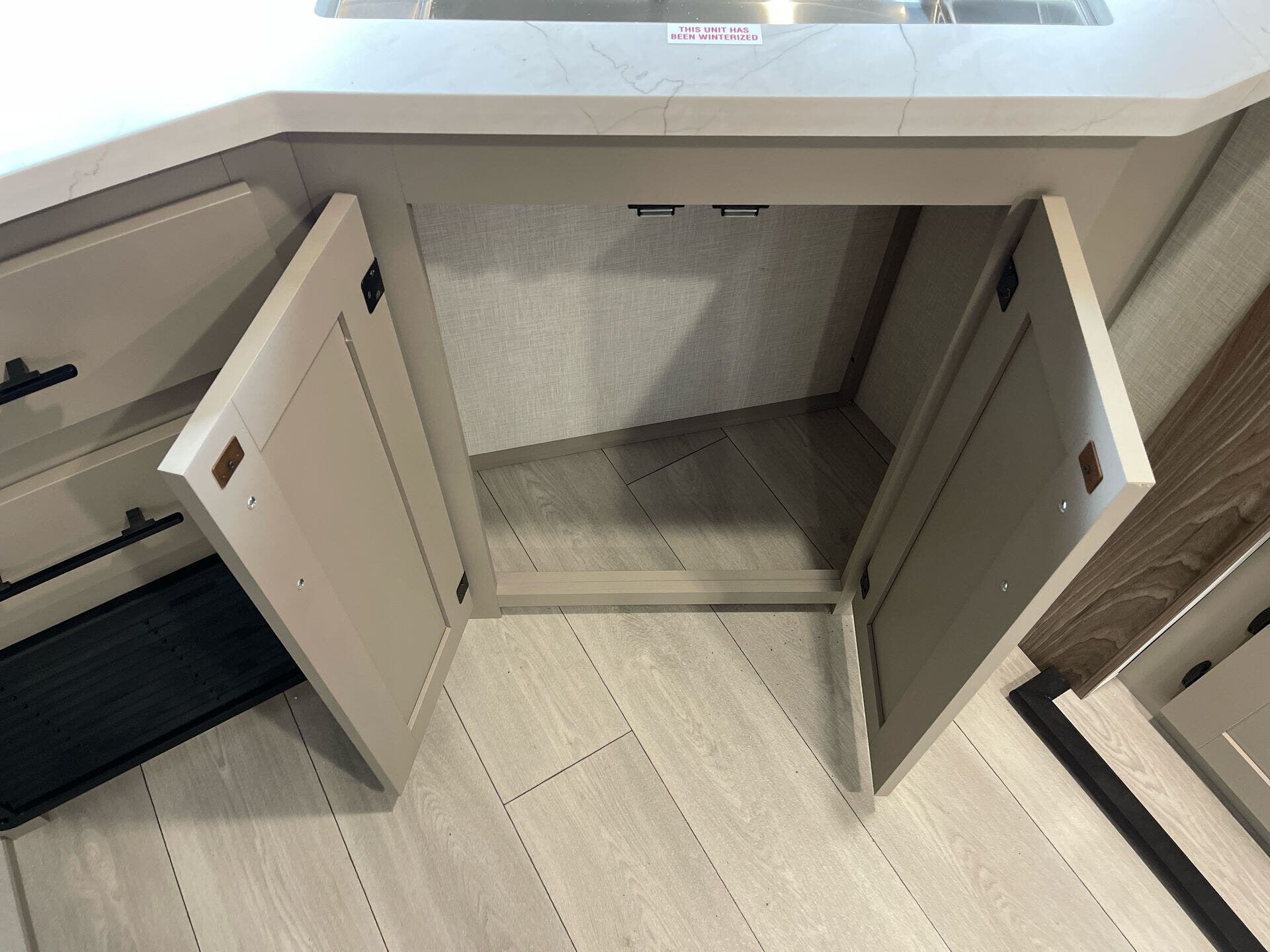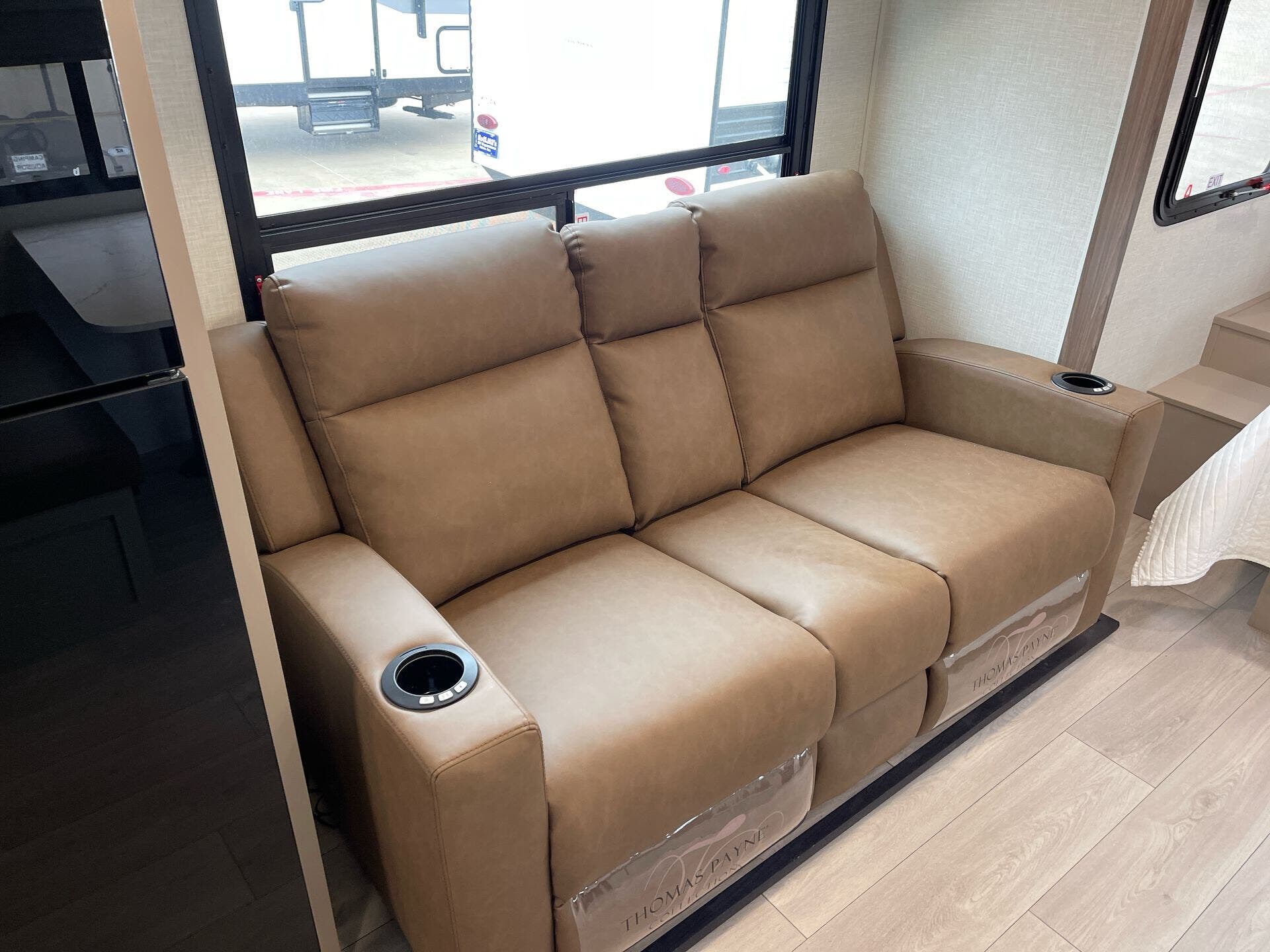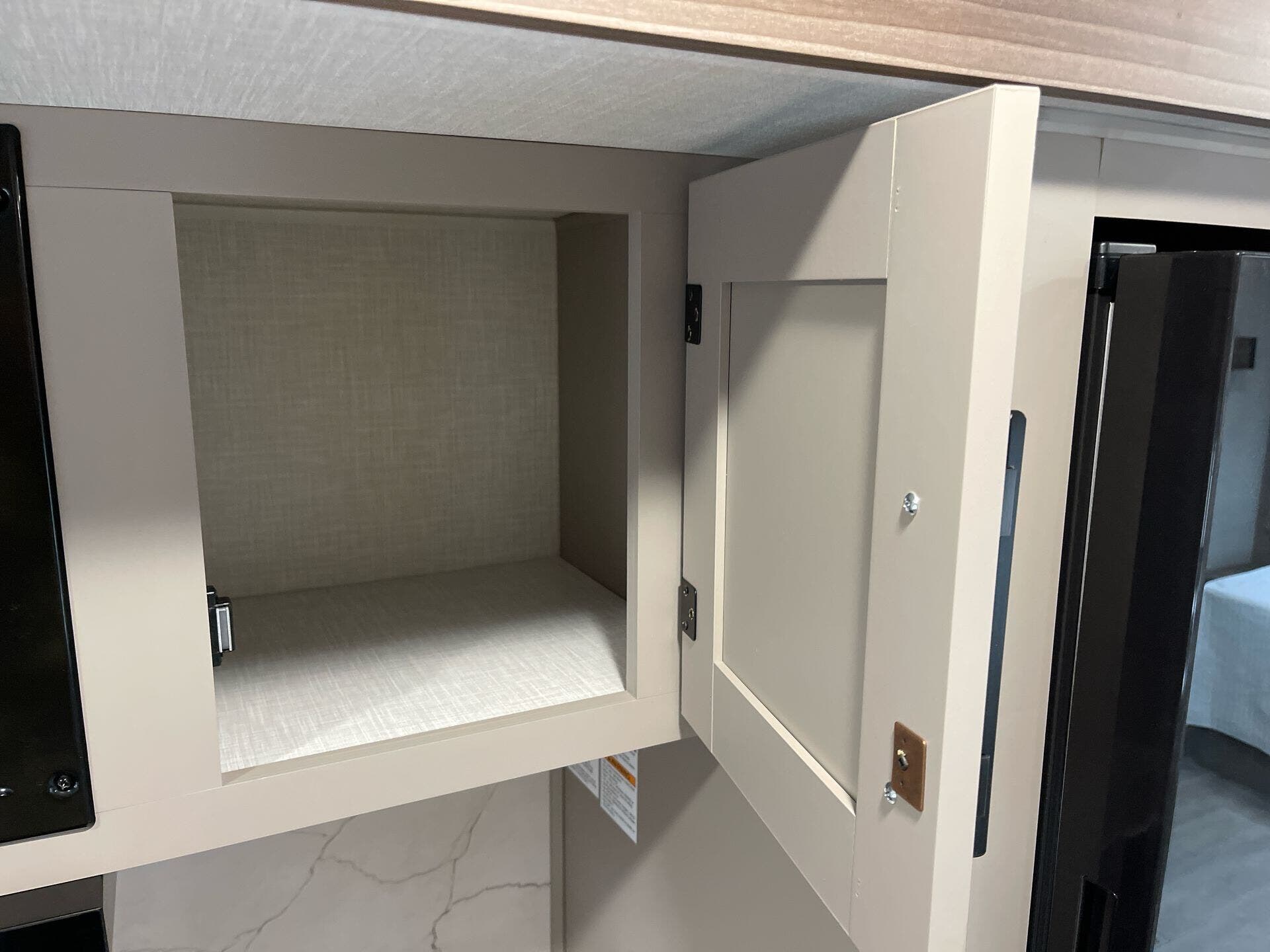 Inside, the 211MKSE offers a spacious rear kitchen layout featuring a 10 cu. ft. 12V refrigerator, three-burner cooktop, oven, microwave, and seamless countertops with a deep stainless steel sink. The slide-out houses a jackknife sofa and a booth dinette, both of which can convert into additional sleeping areas. The front bedroom includes a queen-size bed with dual wardrobes and overhead storage.