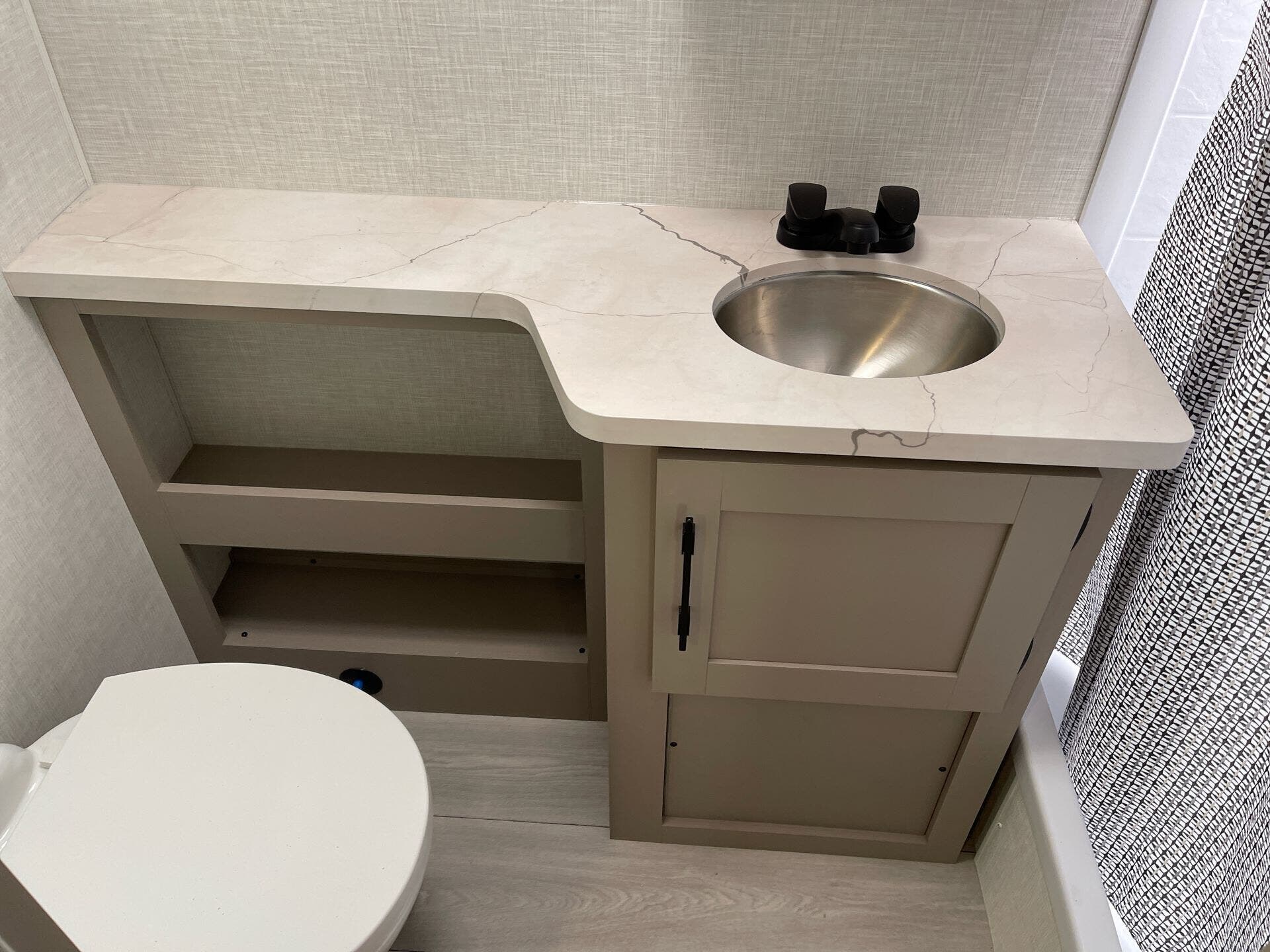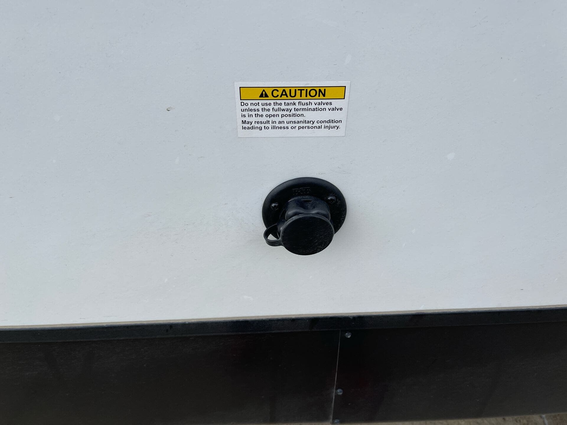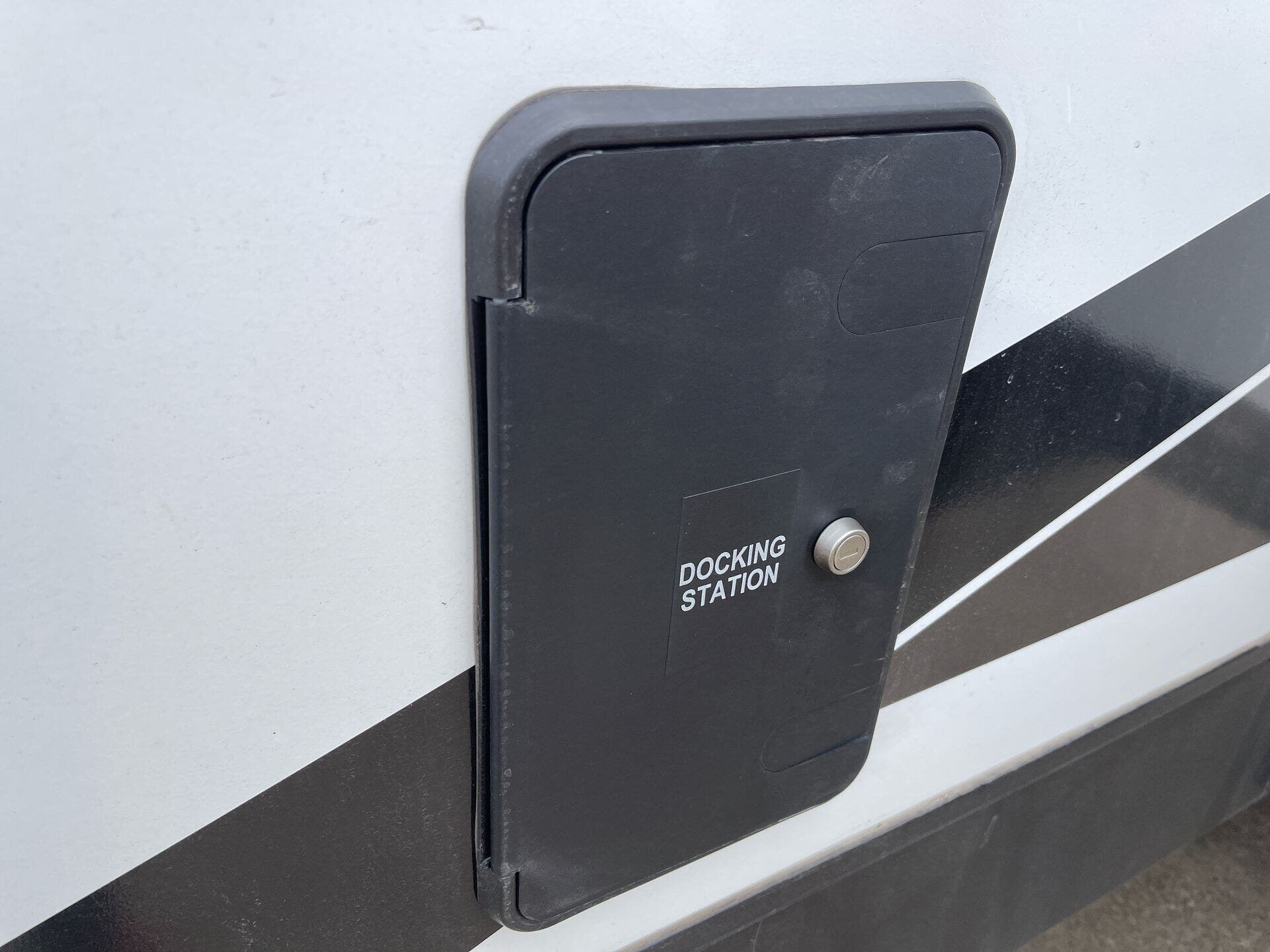 The bathroom is equipped with a 30" x 36" shower, foot-flush toilet, and vanity with a mirrored medicine cabinet. Additional features include an 18-foot power awning with LED lighting, exterior docking station, and pass-through storage.