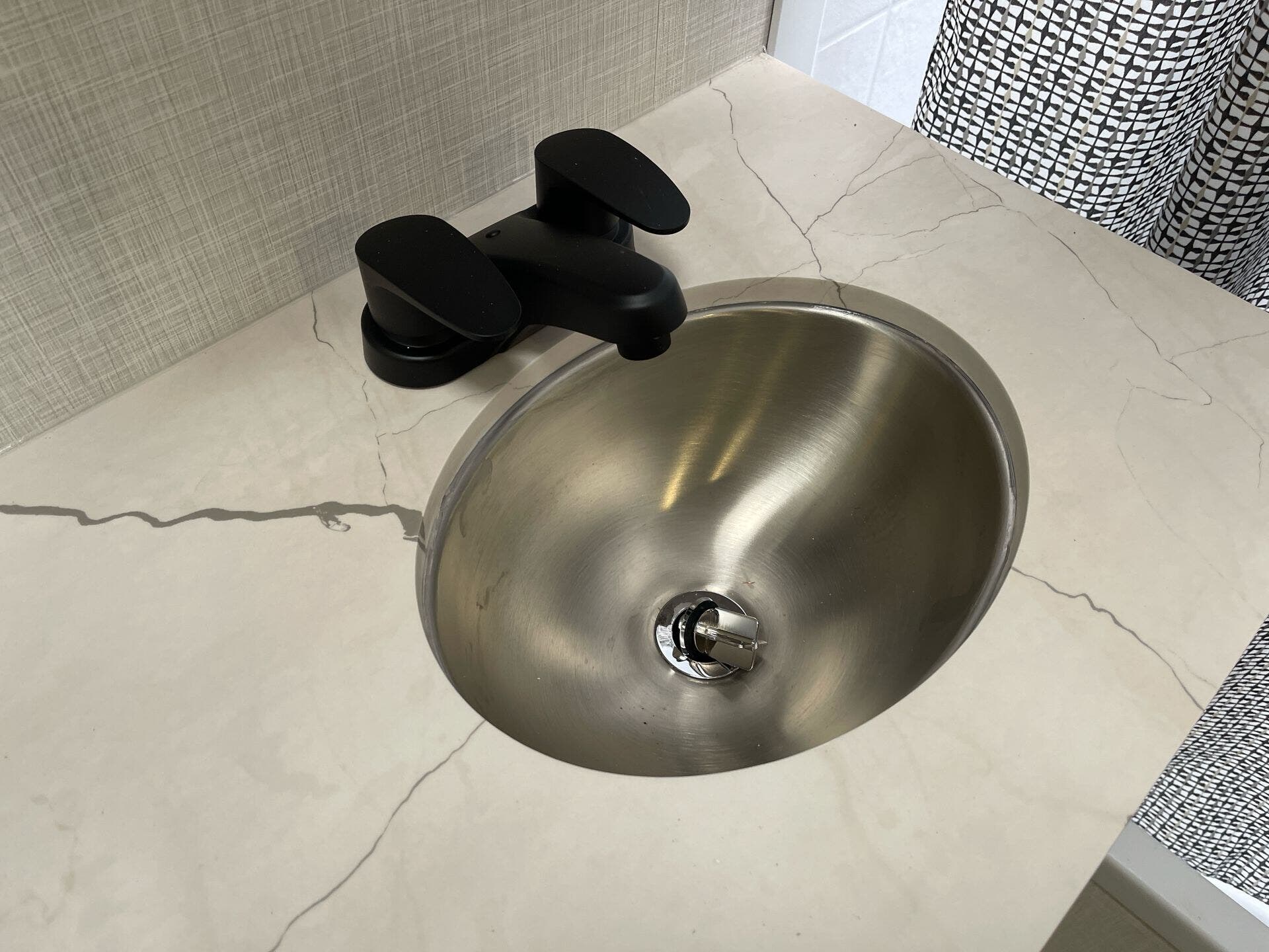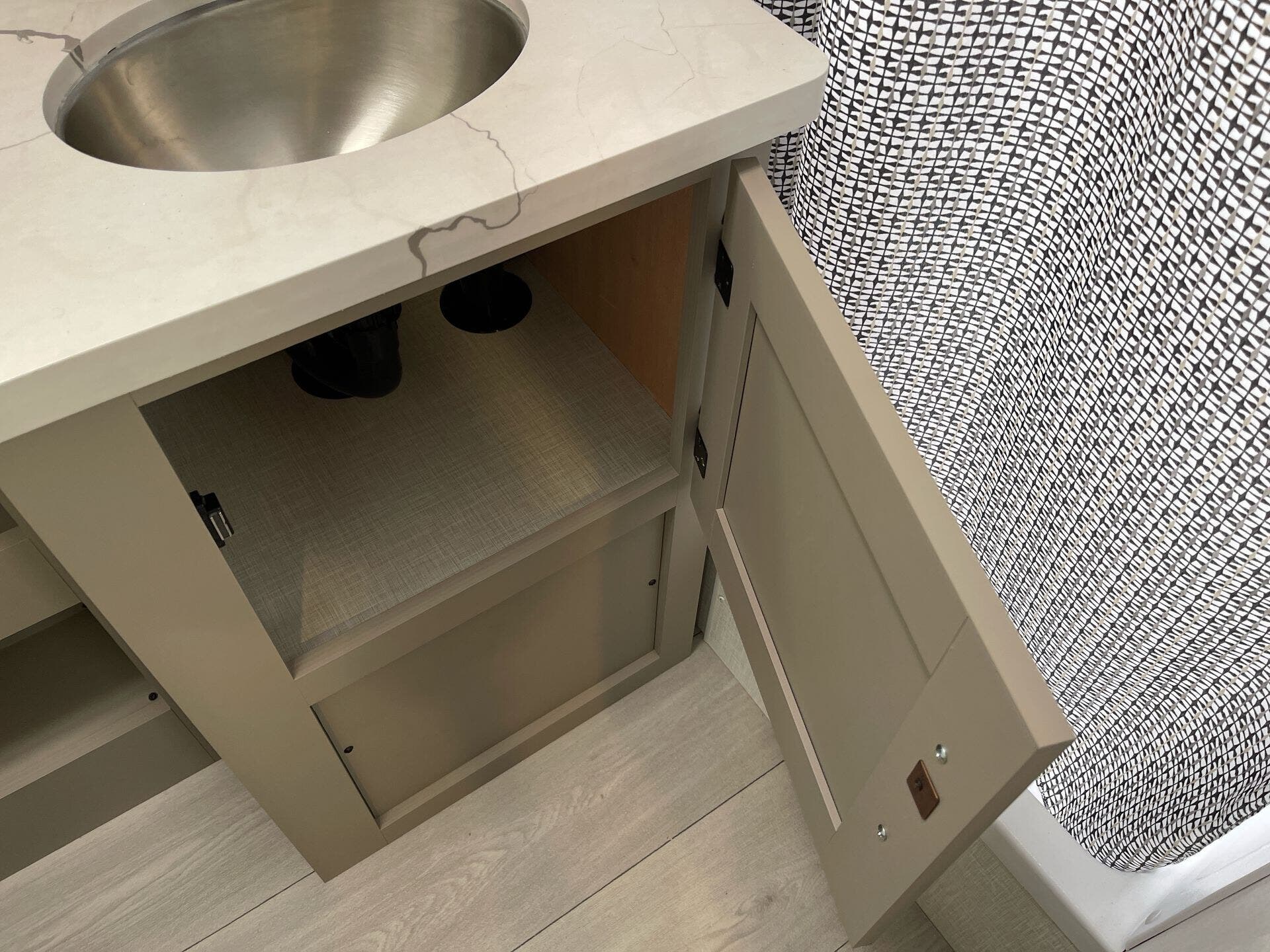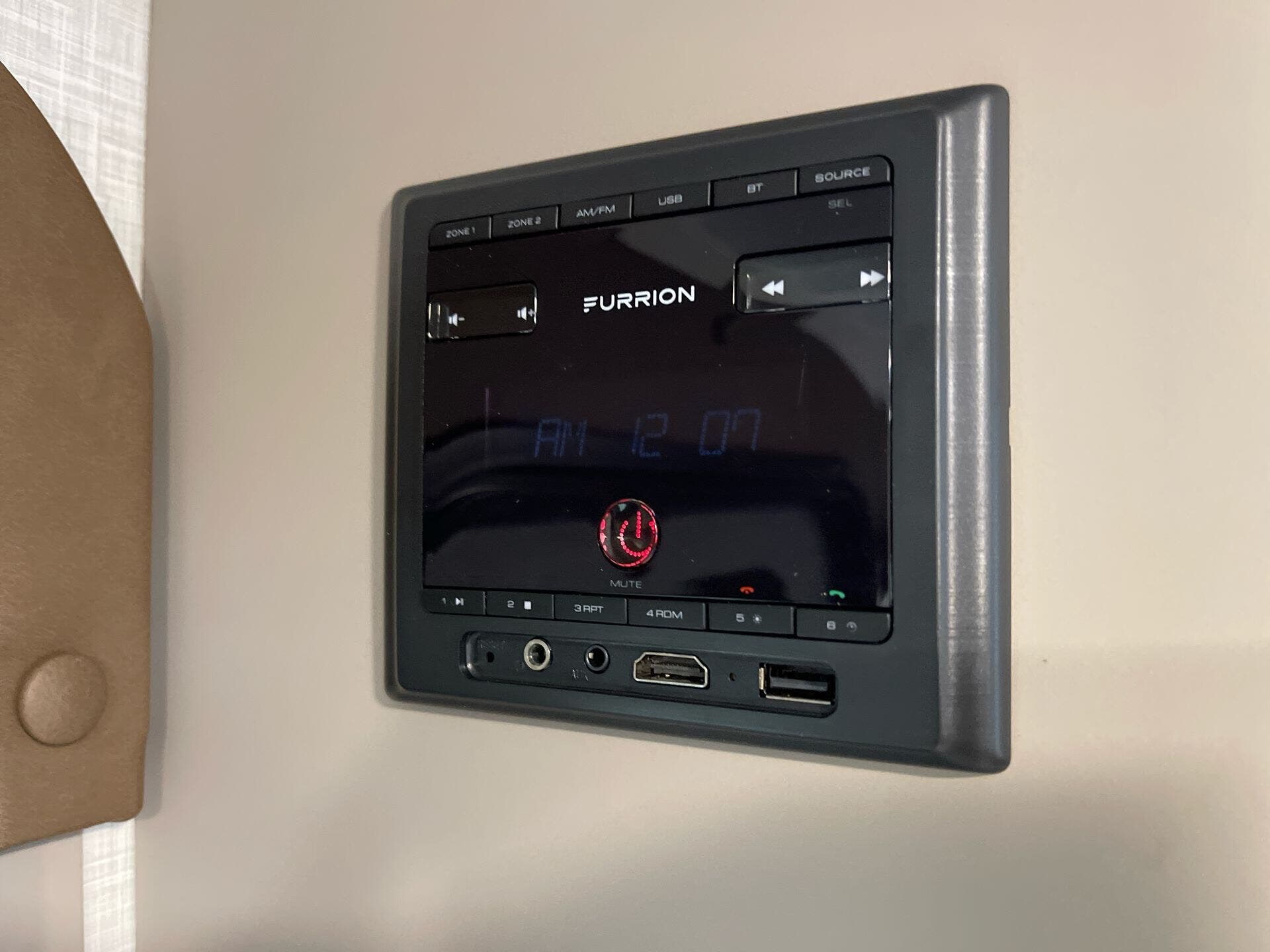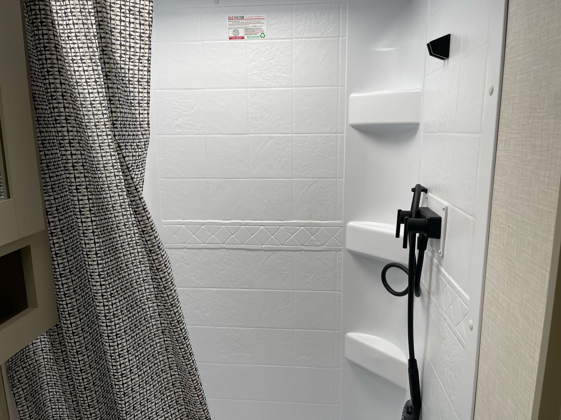 The bathroom is equipped with a 30" x 36" shower, foot-flush toilet, and vanity with a mirrored medicine cabinet. Additional features include an 18-foot power awning with LED lighting, exterior docking station, and pass-through storage.