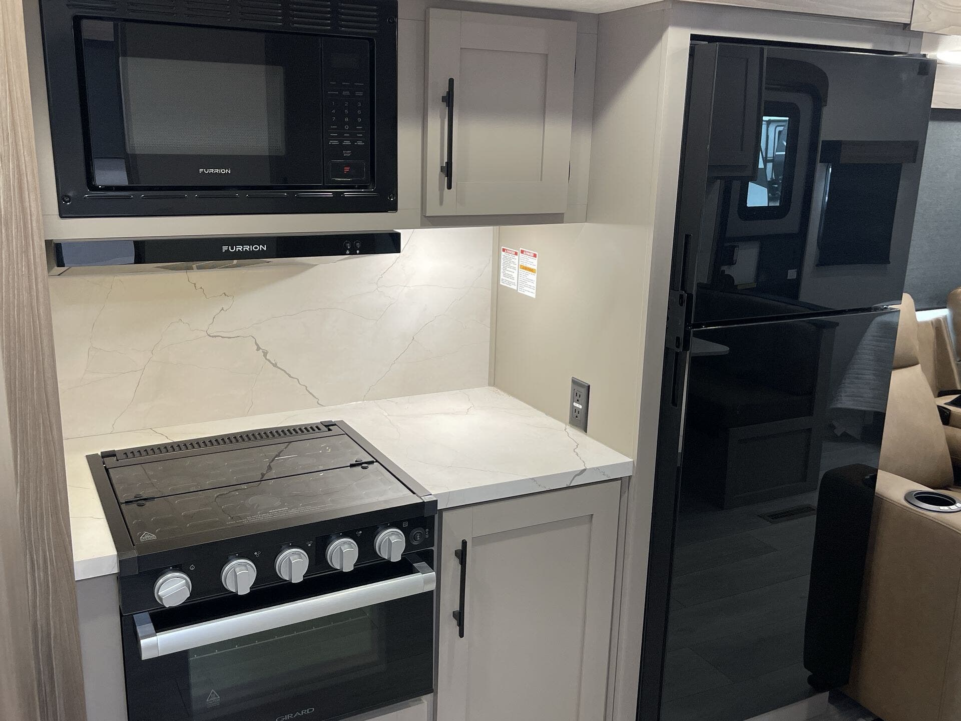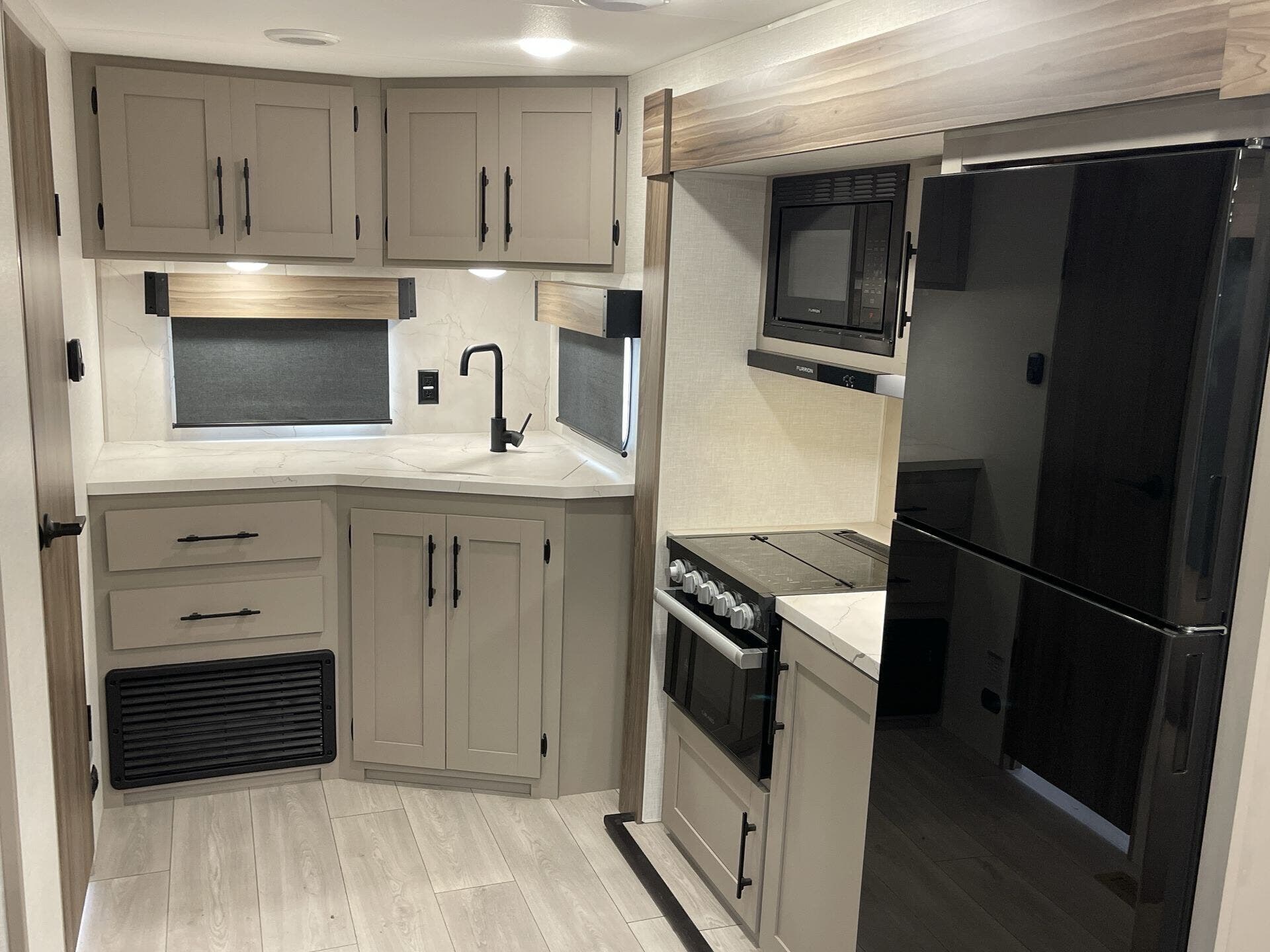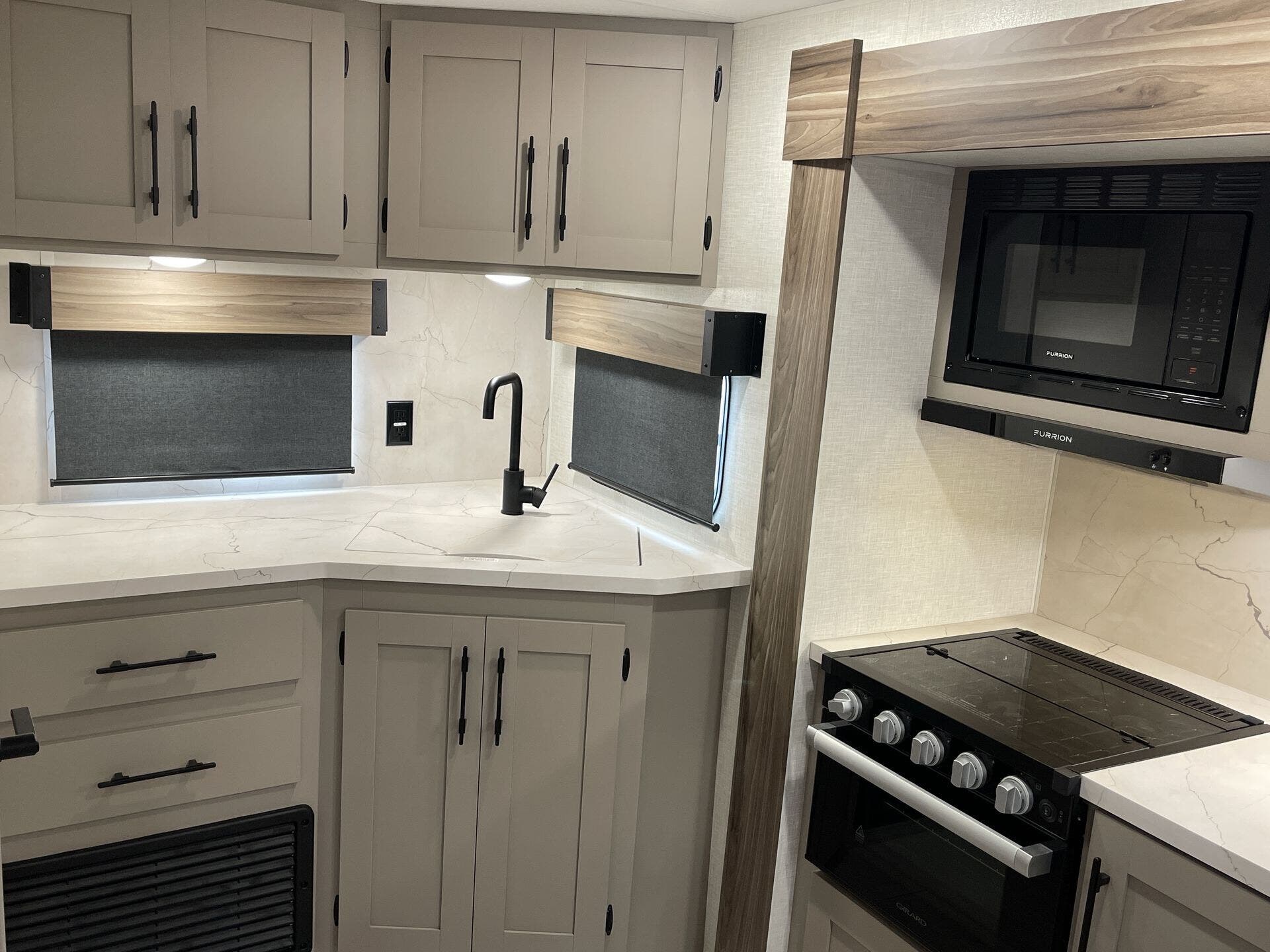 Inside, the 211MKSE offers a spacious rear kitchen layout featuring a 10 cu. ft. 12V refrigerator, three-burner cooktop, oven, microwave, and seamless countertops with a deep stainless steel sink. The slide-out houses a jackknife sofa and a booth dinette, both of which can convert into additional sleeping areas. The front bedroom includes a queen-size bed with dual wardrobes and overhead storage.